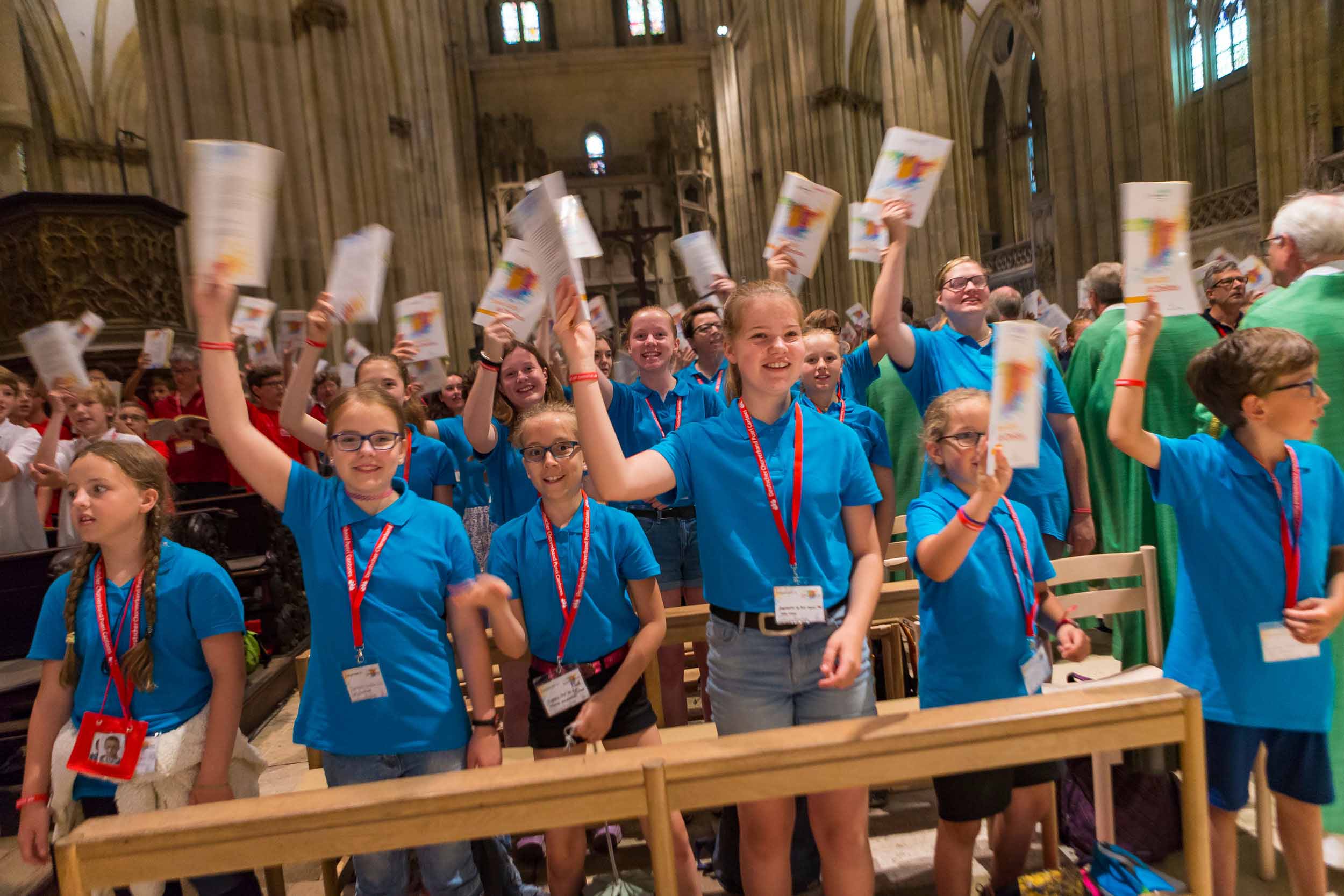 Angefangen von der großen Begrüßungsveranstaltung im Audimax der Universität, wo neben einem Konzert des Vokalensembles „Singer Pur“ ein Abendlob mit Bischof Rudolf Voderholzer mit Tauferinnerung gefeiert wurde, einem Teilnehmerkonzert im Dom St. Peter mit den Regensburger Domspatzen, dem Jugend-Kathedral-Chor aus Fulda, dem Osnabrücker Jugendchor und dem Jugendkammerchor der Singschule Koblenz, einem ökumenischen Friedensgebet in der evangelisch-lutherischen Dreieinigkeitskirche bis hin zum Höhepunkt in der Regensburger Kathedrale am Sonntag, als nochmals alle Chöre zusammen die Liturgie zum gemeinsamen Abschlussgottesdienst mit Bischof Rudolf musikalisch gestalteten. Aber auch für die Regensburger gab es die Möglichkeit, den jungen Menschen zu begegnen, denn am Samstag präsentierten sich zahlreiche Chöre in kostenlosen Konzerten in verschiedenen Kirchen und Einrichtungen der Stadt.