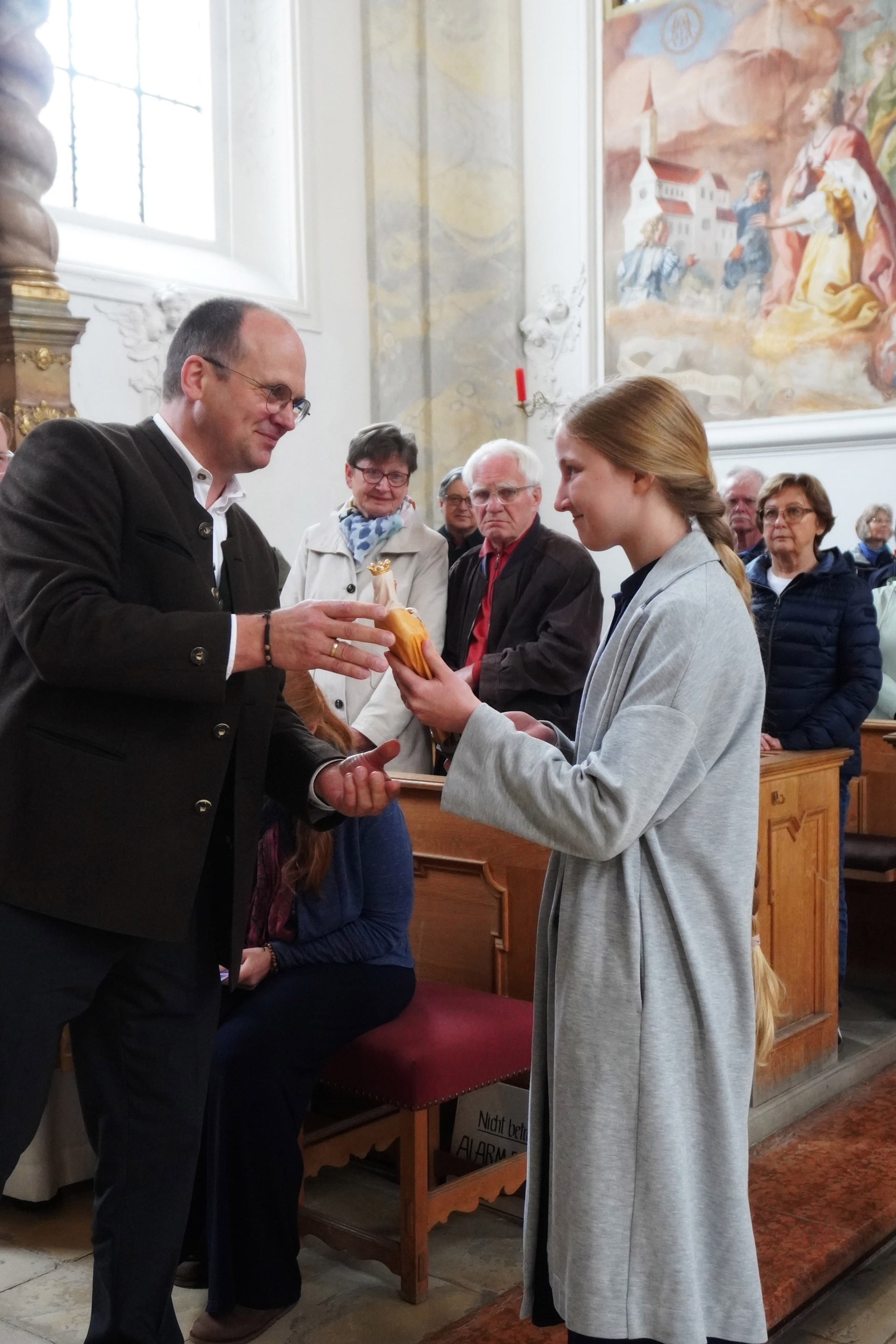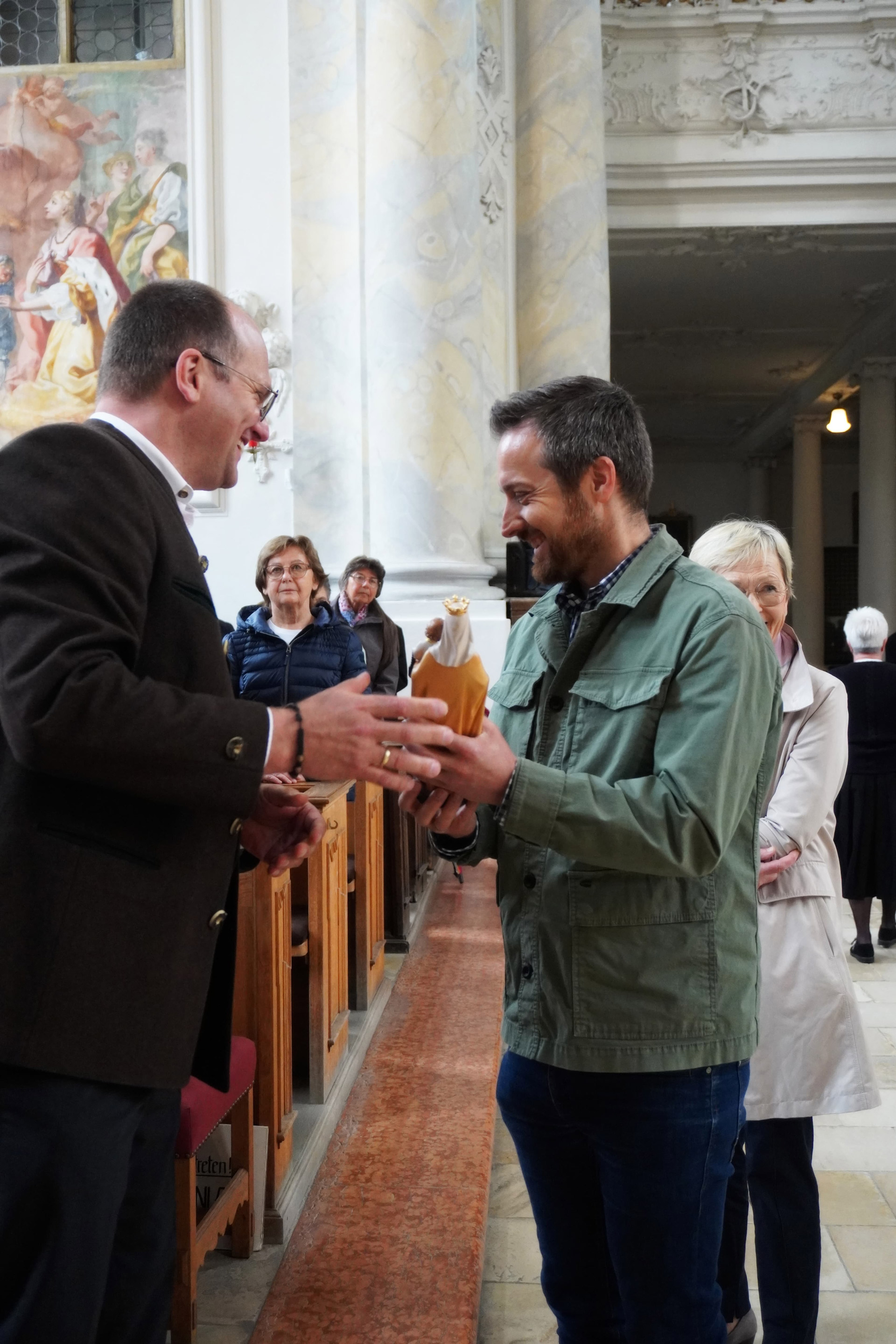 Die Idee, diese Aktion auch im Bistum Regensburg umzusetzen, stammt von Florian König aus Landshut. Beim Besuch eines norditalienischen Wallfahrtsortes wurde er auf die besondere Ausstrahlung der sogenannten „Wander-Madonnen“ aufmerksam gemacht. In Österreich wird die Aktion von der Katholischen Glaubensinformation der Erzdiözese Wien betreut. Wer eine Madonna erhält, übernimmt damit auch die Verantwortung, sie zu Menschen zu bringen, die sich in Lebensumbrüchen oder anderen schwierigen Situationen befinden – sei es in freudigen Momenten wie einer Taufe oder Hochzeit, oder in belastenden Zeiten wie vor einer Prüfung, während einer Krankheit oder bei Familienstreitigkeiten. Nach einiger Zeit kehren die Wander-Madonnen zu ihrem Besitzer zurück, um bald darauf erneut ein vorübergehendes Zuhause zu finden. Auch die Äbtissin des Klosters Seligenthal, Mutter Christiane, begrüßte die Aktion, ebenso wie der Spiritual des Klosters, P. Bonifatius, der sich zusammen mit Florian König um die Umsetzung kümmert. Beim Aussendungsgottesdienst der ersten „Wander-Madonnen“ am vergangenen Sonntag war das Interesse groß, sodass zu erwarten ist, dass es bei den 25 Figuren nicht bleiben wird. Im Anschluss an die Messfeier trafen sich alle Interessierten zu einer Austauschrunde im Klostergebäude.