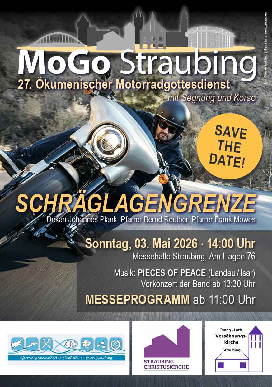Alle beteiligten Partner laden wieder herzlich ein zum 27. Straubinger Motorradgottesdienst mit Segnung und Korso, der in diesem Jahr das Thema "Schräglagengrenze" hat. Der ökumenische Motorradgottesdienst findet in diesem Jahr am Sonntag, den 03. Mai 2026, um 14 Uhr in der Messehalle Straubing statt.