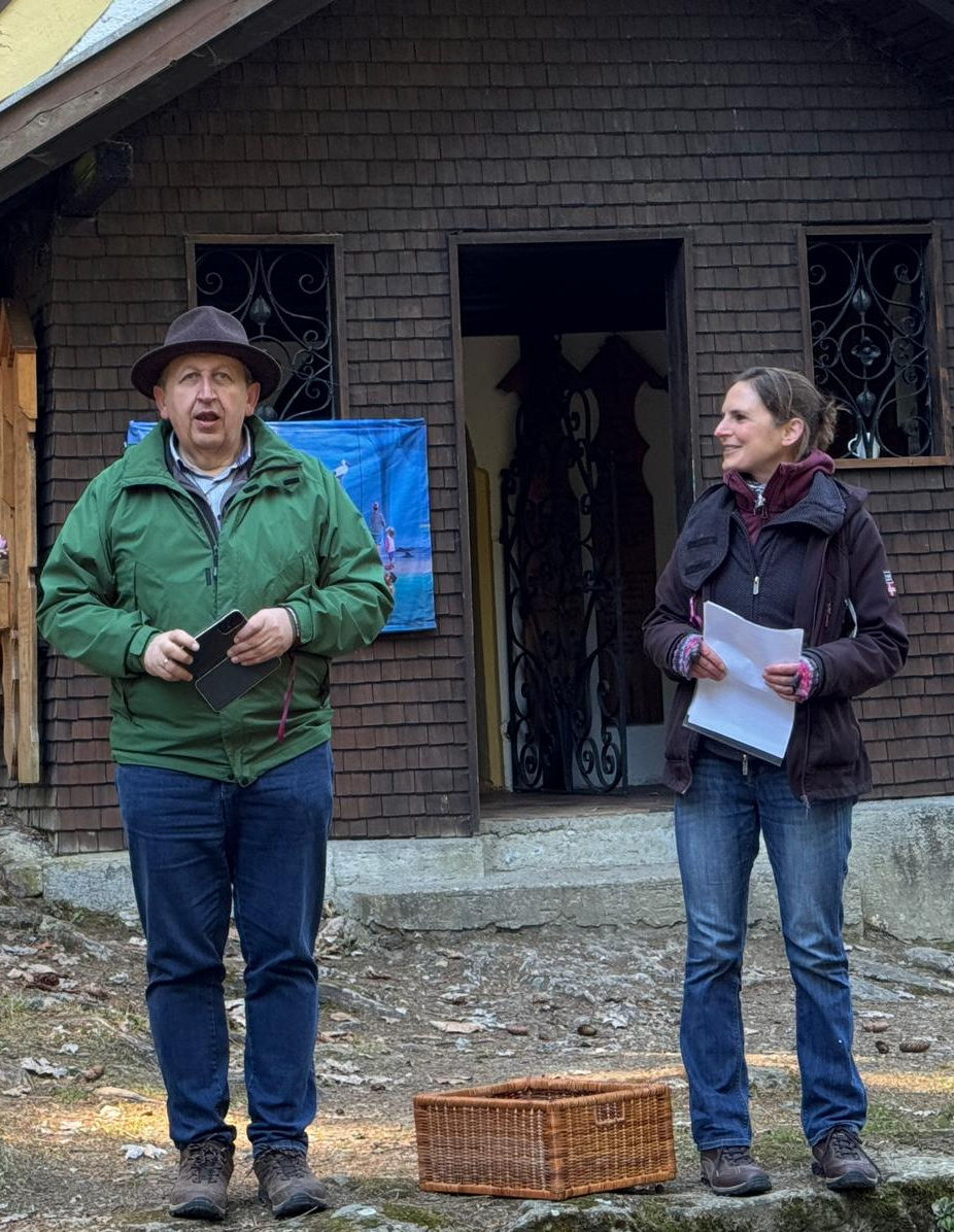 Irmgard Hilmer vom Förderverein Josef Renner hatte die besten Segenswünsche des früheren Kollnburger Pfarrers und Dekans mit dabei, der sich über das große Engagement an seiner „24-jährigen Wirkungsstätte daheim“ sehr freute und für alle Gaben schon im Voraus dankte. Hilmer erzählte kurz von der Arbeit in Chamba, wo derzeit eine Krankenhilfsstation am Schulgelände aufgebaut und das abgebrannte Mädchenwohnheim wiedererrichtet wird. Rechtzeitig vor dem Weitermarsch kam Landrat Dr. Ronny Raith mit seiner Frau der Schar entgegen, um die zweite Weghälfte mitzugehen und diese „lobenswerte Aktion“ zu unterstützen.