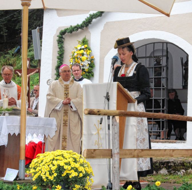 „Zum Ruhme Gottes und zur Mahnung für das Tal“ rief die Glocke der Ölbergkapelle die Pilger nach Sachrang. Den Festgottesdienst zur 44. bayerisch-tirolischen Wallfahrt zur Ölbergkapelle in Sachrang hielt Bischof Dr. Rudolf Voderholzer aus Regensburg. Bürgermeister Peter Solnar begrüßte Wallfahrer und zahlreiche Ehrengäste – darunter den Abgeordneten Klaus Stöttner, die stellvertretende Landrätin Marianne Loferer und den Vorsitzenden des Bayernbundes Adolf Dinglreiter.
