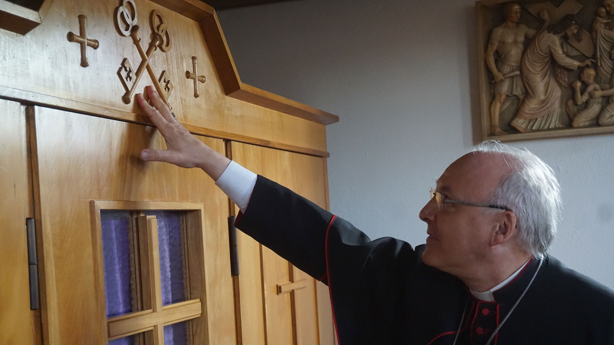 Nach dem Mittagessen stattete der Bischof der Filialkirche St. Michael in Thierstein einen Besuch ab. Mit Maria Zeidler und Günther Schröter traf er zwei Pfarrangehörige, die die Kirchweih vor 70 Jahren selbst mitgefeiert haben. Auch hier freute er sich über die gelungene Renovierung der Kirche: „1954 war Michael Buchberger Bischof von Regensburg. Ihm gefiel es, wenn eine neue Kirche auf seinen Namenspatron geweiht wurde.“ Thiersteins Bürgermeister Thomas Schobert sagte in seiner kurzen Ansprache, dass er aus der Predigt des Bischofs einige Anstöße für sich mitgenommen habe. Wie schon an der Kirche Mariä Himmelfahrt verabschiedete sich Bischof Rudolf auch an St. Michael mit einem herzlichen „Zsammhalten“ von den Gläubigen.