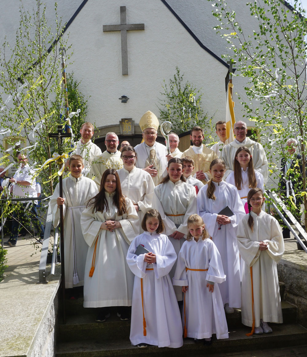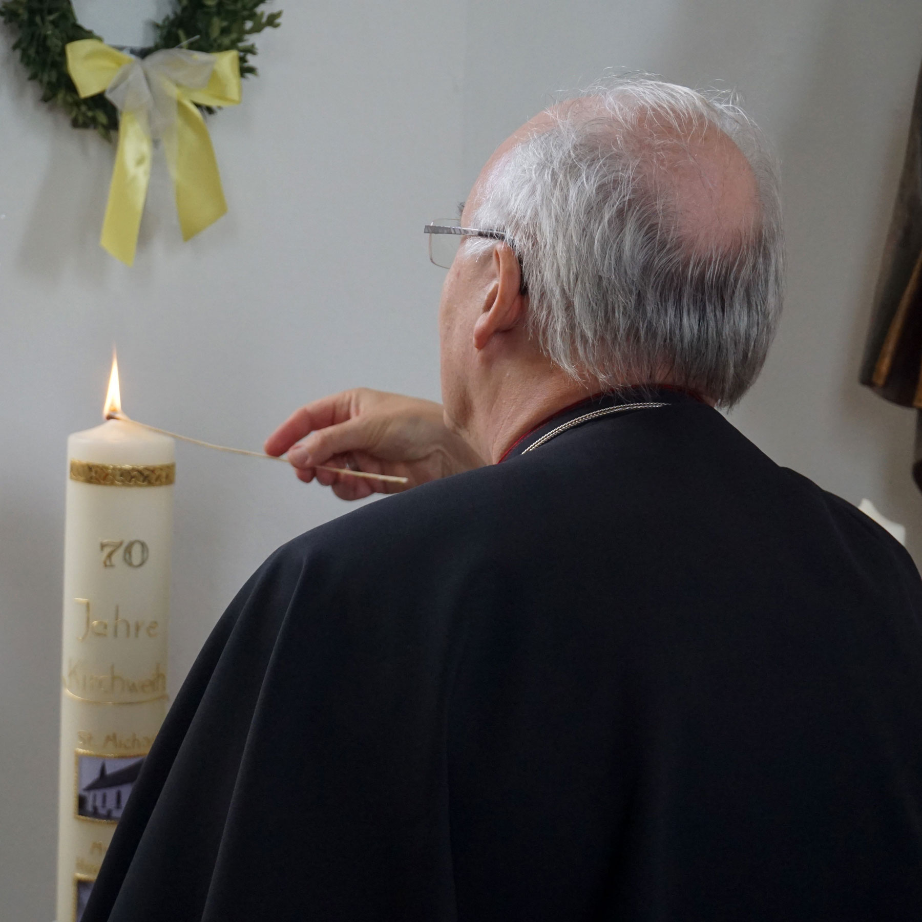 Bischof Rudolf sprach seinen Dank all denen aus, die mithelfen, dass dieses Gotteshaus ein Ort der Erinnerung an die Freude und ein Ort der Feier der Freude über unseren Glauben ist. Zum Jubiläum hatte Doris Härtl vom örtlichen „Bastelstübchen“ eine Kerze gestaltet. Sie wurde vom Bischof gesegnet: „Herr Jesus Christus, du bist das Licht der Welt, das Licht für alle Menschen. Segne diese Jubiläumskerze, die wir zu Deinem Lobpreis entzünden. Wie ihr Licht das Dunkel erhellt, so mache du unser Leben hell mit Deiner Wahrheit.“ Pfarrer Stefan Prunhuber verwies in seiner Begrüßung des Bischofs darauf, wie sehr sich die Gläubigen darüber freuten, dass nach dem 50-jährigen Jubiläum wieder einmal der Bischof die Diasporapfarrei besucht. In den letzten Jahren seien die beiden Gotteshäuser umfassend renoviert worden, so dass der Besuch auch den gelungenen Abschluss dieser Baumaßnahmen markiere. Er bedankte sich für die wichtige Unterstützung durch das Bistum. Bischof Rudolf bestätigte gerne, dass alles glänze und gut in Schuss sei: „Das schafft einfach Atmosphäre, wenn für alles gesorgt ist.“