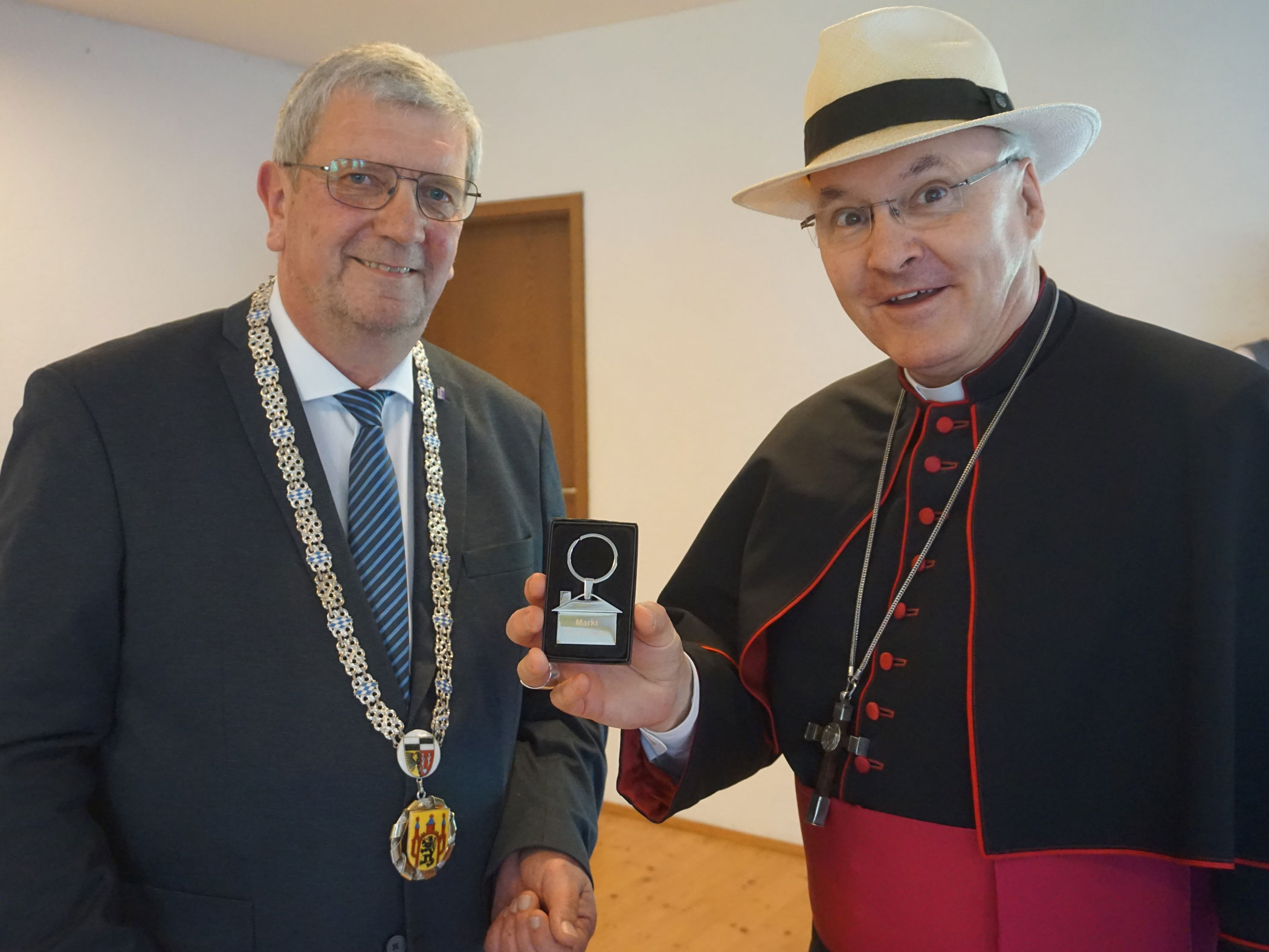 Beim anschließenden Stehempfang im Pfarrheim, durch den die Sprecherin des Pfarrgemeinderats Waltraud Döltsch führte, begrüßten die Kinder des Evangelischen Kinderhauses „Unter‘m Regenbogen“ Bischof Rudolf mit einem Lied. In den Grußworten wurde vielfach die gute Zusammenarbeit in der kirchlichen und politischen Gemeinde angesprochen. Ein Beispiel dafür war auch der evangelische Posaunenchor, der den Bischof mit dem „Lobe den Herren“ und dem Oberfrankenlied in Thiersheim begrüßte. Martin Schöffel, Staatssekretär im Bayerischen Staatsministerium der Finanzen und für Heimat, dankte der Pfarrgemeinde für ihr vielfältiges Wirken und dem Bistum für die gute finanzielle Unterstützung. Thiersheims Bürgermeister Werner Frohmader wohnt zwischen der evangelischen und der katholischen Kirche und nahe am Rathaus. Für ihn bildet das ein magisches Dreieck, in dem man gemeinsam viel bewirken kann. Wichtig ist ihm, dass die Kirchengebäude weiterhin offenstehen: „In Kirchen kann man sich auch zurückziehen und die Ruhe und Stille genießen. Das haben wir in unserer Gesellschaft oft verlernt.“ Auf Frohmaders Bitte hin trug sich Bischof Rudolf ins Goldene Buch der Marktgemeinde ein.