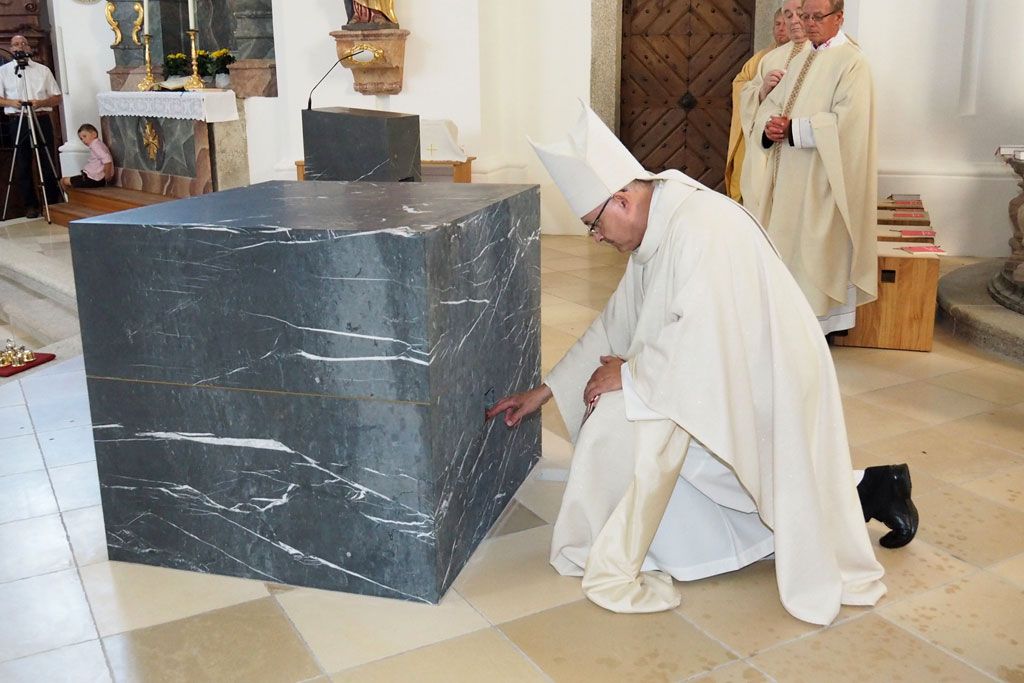 Viele der Gläubigen in der überfüllten Wallfahrtskirche Mariä Heimsuchung hatten bisher einer Altarweihe noch nicht beigewohnt - es wurde ein feierliches Erlebnis. Der Bischof setzte den Behälter mit Reliquien des Heiligen Wolfgang, der Heiligen Anna Schäffer und der Heiligen Aurelia unterhalb des Altartisches in den neuen Volksaltar. Steinmetz Alfred Neumann aus Bad Wörishofen, der den Altar hergestellt hatte, verschloss vor Ort das Reliquiengrab.
