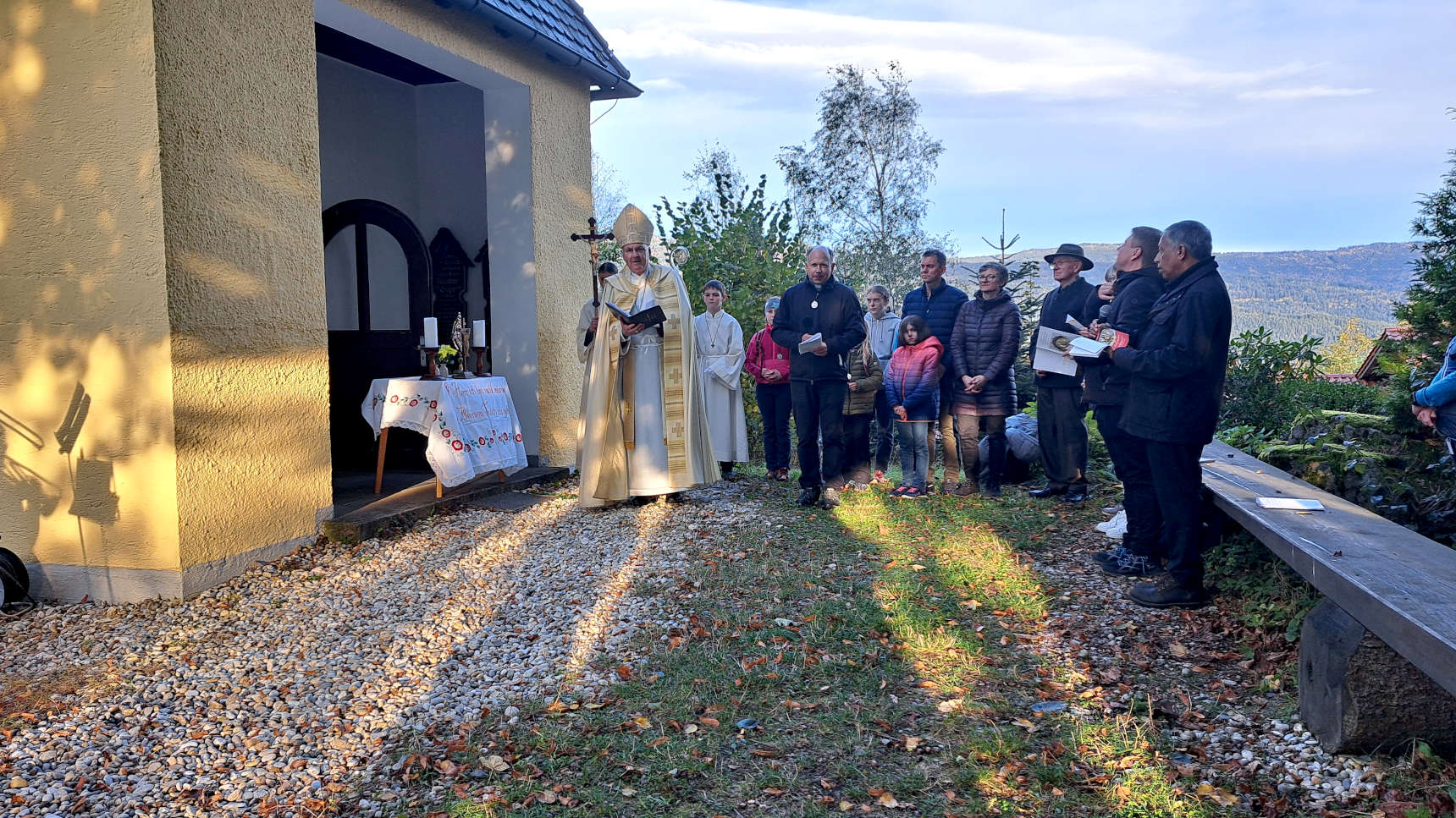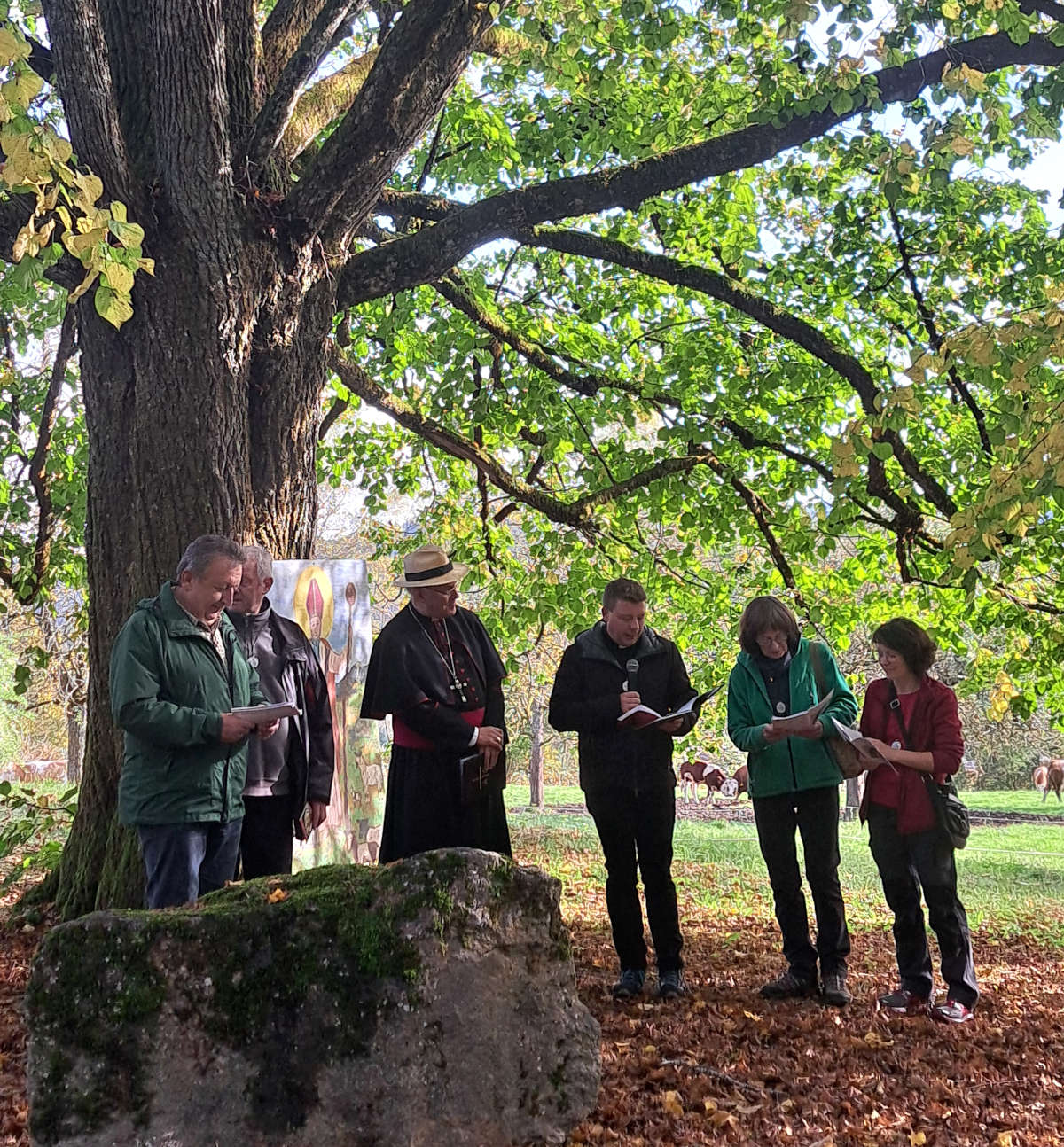 Mit seiner Wolfgangskapelle und seinen alten Traditionen sei Böbrach einer der besonderen Orte der Wolfgangsverehrung, bekräftigte Bischof Voderholzer, ehe man entlang der mit Blechschafen von der Viechtacher Künstlerin und 2. „Pilgerweg“-Vorsitzenden Dorothea Stuffer markierten „Schäfchenweg“-Route den ersten Anstieg zum abgelegenen „Wolfgangshof“ der Familie Weiler erwanderte. Auf diesem Weg, bemerkte Bischof Rudolf, sei der Heilige Wolfgang möglicherweise sogar tatsächlich selbst gegangen. Dort bei der mächtigen alten Wolfgangslinde nahm man sich Zeit für eine Betrachtung. Diese gewährte den Teilnehmenden nebenbei auch eine wohltuende Verschnaufpause vor dem steilen und steinigen Kreuzweg zu der hoch droben im Wald gelegenen Wolfgangskapelle. Beim Marterl am Fuße des Kreuzwegs waren einige Birkenkreuze auszumachen. Wie Hildegard Weiler erläuterte, gehören diese zur Initiative „Ein Stück Kreuz-Weg mit Christus gehen“. Seit einigen Jahren lädt der Pilgerverein die Wanderer dazu ein, ein Kreuz hinauf zur Kapelle zu tragen und dieses dort auf die Fürsprache des Heiligen Wolfgang hin Christus zu übergeben. Dieses Angebot erfreut sich großer Beliebtheit.