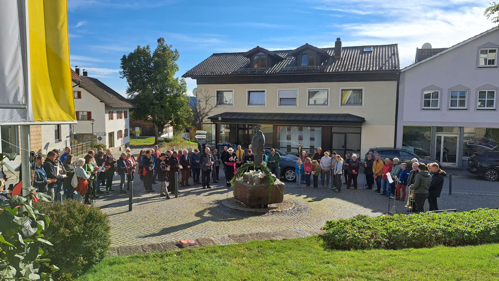 Bei seiner Ankunft in Böbrach wurde Bischof Rudolf von einer rund 100-köpfigen Menschenmenge vor der Pfarrkirche Sankt Nikolaus begeistert empfangen. Gerne trug er sich auf Bitten von Pfarrer Kohl und Bürgermeister Gerd Schönberger in der Sakristei ins Goldene Buch der Gemeinde Böbrach ein. Ein festliches Begrüßungs-Standerl eines Bläser-Quartetts und Glockengeläut geleiteten ihn anschließend zum Wolfgangs-Brunnen auf dem Kirchplatz, wo er gemeinsam mit dem Eggenfeldener Bildhauer Josef Neustifter dessen beeindruckende Darstellung des Heiligen Wolfgang (die übrigens auch auf der Rückseite des roten Pilgerheftchens abgebildet ist) bewunderte.