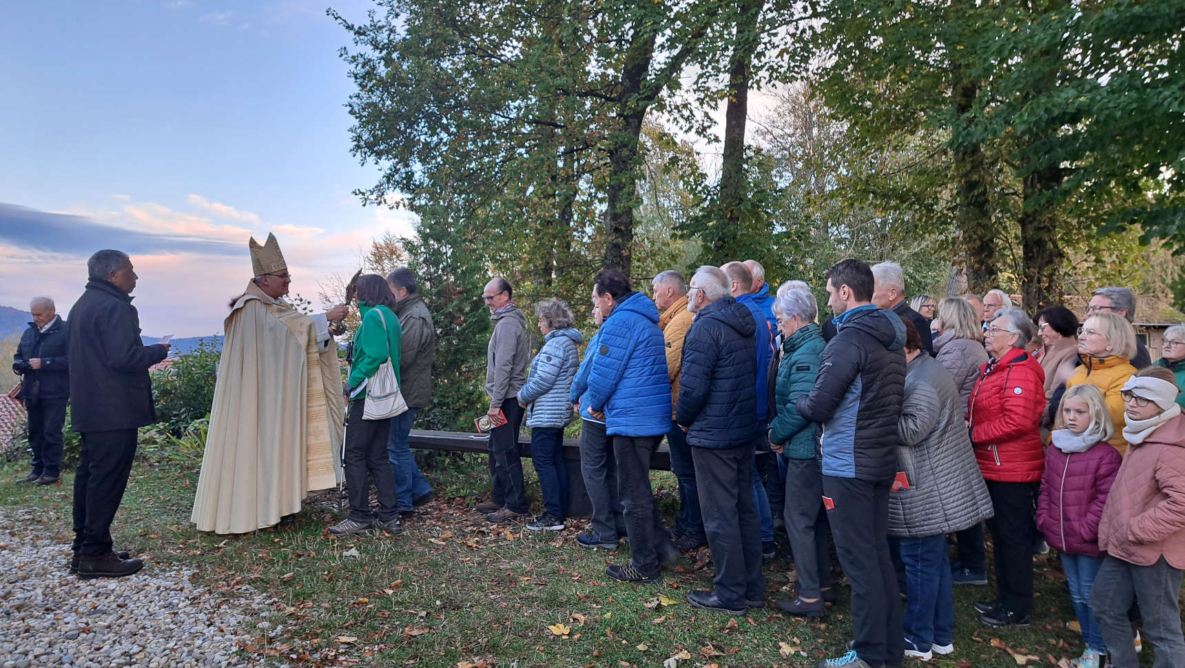 Wieder zurück beim Wolfgangshof führte die letzte Etappe der Wanderung auf einem leicht ansteigenden, gut gangbaren Wald- und Wiesenweg zum Weiler Frath, wo die drei Generationen der Gutshof-Familie Geiger die Gäste herzlich willkommen hießen. Vor der Gutskapelle, die dem Heiligen Nikolaus geweiht ist, feierte Bischof Rudolf abschließend eine Feldandacht, in der er alle vorherigen Stationen noch einmal kurz Revue passieren ließ. Dabei bedankte er sich für die wunderbare Gemeinschaft und für die Pflege des Wolfgangsgedankens. Sein besonderes Vergelt’s Gott galt den vielen Teilnehmern, die mit ihm mitgegangen sind und mitgebetet haben. Er selber durfte sich dafür über die herzlichsten Glückwünsche zu seinem 65. Geburtstag, den er wenige Tage zuvor begangen hatte, freuen. Am Ende der Andacht nutzten die Gläubigen gerne die Gelegenheit, sich von ihrem Oberhirten mit einer Reliquie des Heiligen Wolfgang persönlich segnen zu lassen, ehe man den Tag im Gutsgasthof gemeinsam gemütlich ausklingen ließ.