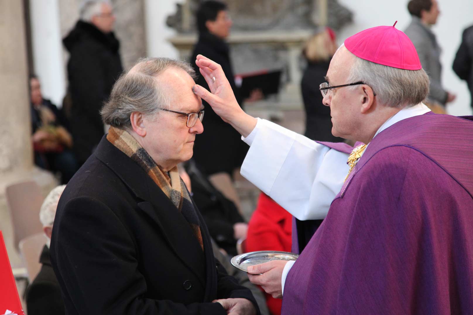 Die Künstlerinnen und Künstler und alle anderen Gottesdienstteilnehmer ließen sich danach mit dem Aschenkreuz bezeichnen. Mit der "heilsamen Grobstaubkonzentration" aus der Asche verbrannter Palmzweige, so Bischof Rudolf, bekennen wir uns sichtbar als bewusste Menschen mit nur einem einzigartigen Leben: zu Schuld und Unzulänglichkeit, die Gott mit seiner Erlösungstat getilgt hat, zu unserer Hoffnung auf ein unsterbliches Leben bei Gott.
