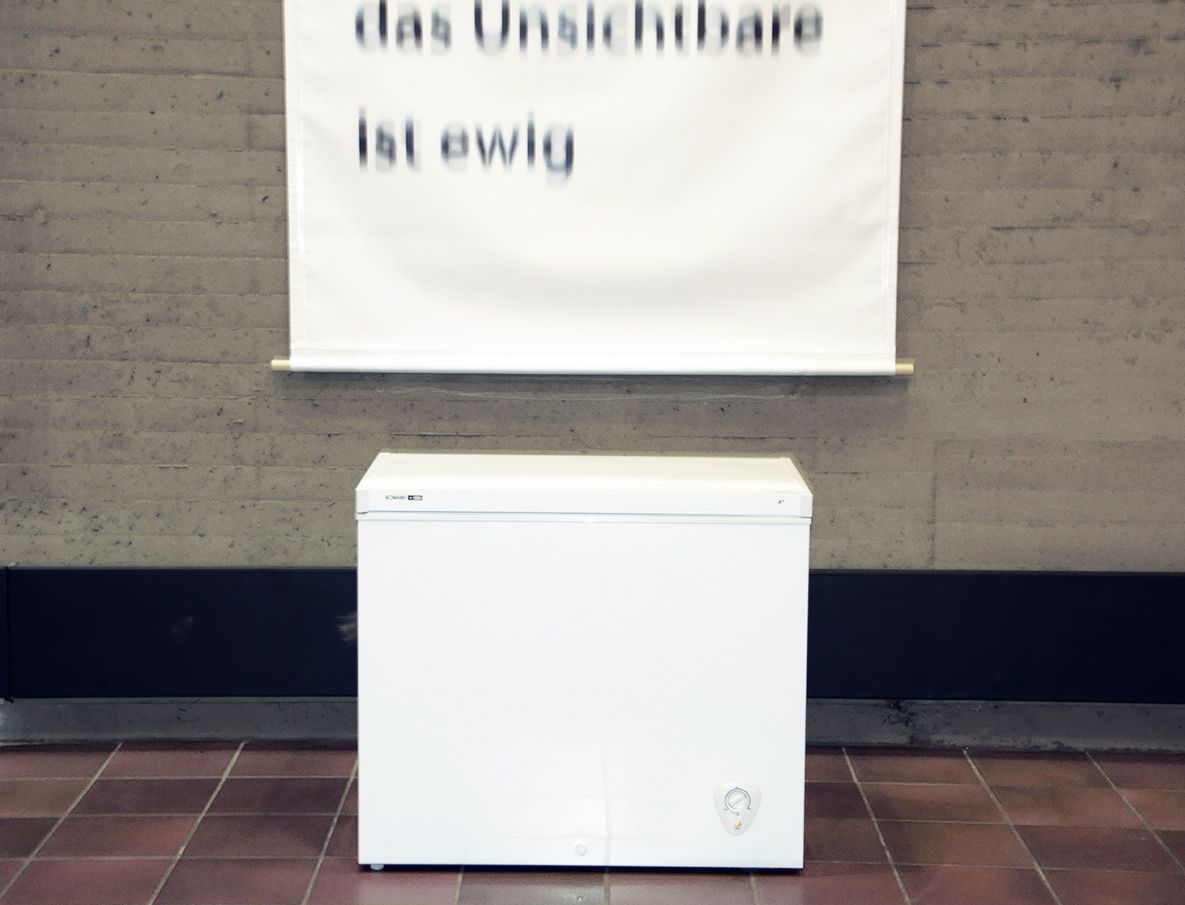 Seit Montag setzt eine Installation von Raoul Kaufer einen spannungsreichen Akzent. Eine Gefriertruhe, ein Transparent – kühl und nüchtern fordert die Arbeit „Ewigkeit“ im Kirchenraum der Denkfabrik Universität heraus. Die Gefriertruhe ist ein Haushaltsgerät, das befremdlicher kaum sein kann. Größe, Maße und Form erinnern an einen Sarkophag. Im Permafrost hält sich organische Materie nahezu ewig.