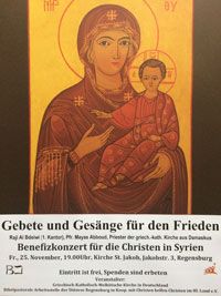 Zum Benefizkonzert für die Christen in Syrien laden die Griechisch-Katholisch-Melkitische Kirche in Deutschland, die Bibelpastorale Arbeitsstelle der Diözese Regensburg sowie der Verein „Christen helfen Christen im Hl. Land e.V.“ herzlich ein! Der Eintritt ist frei, Spenden sind willkommen.