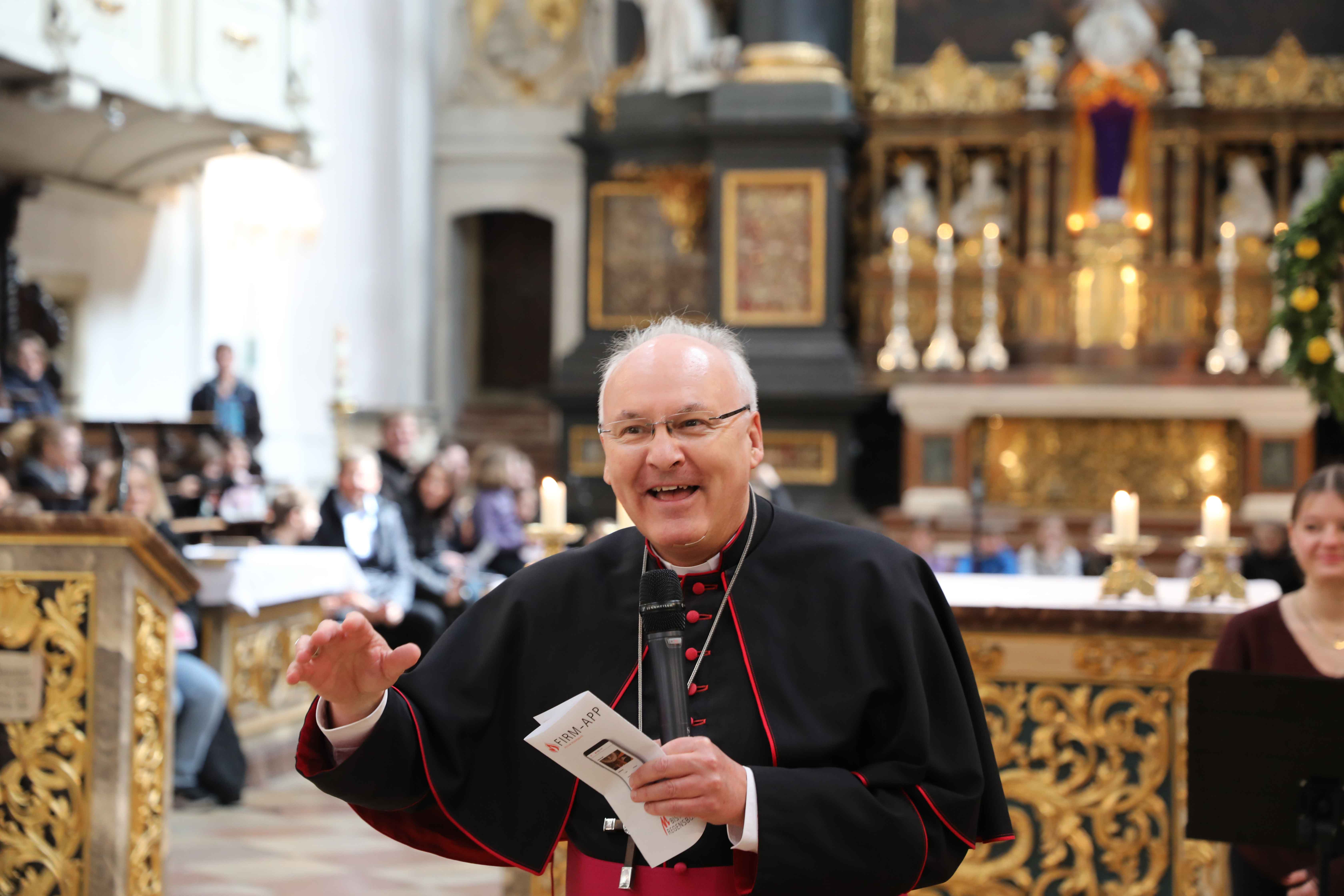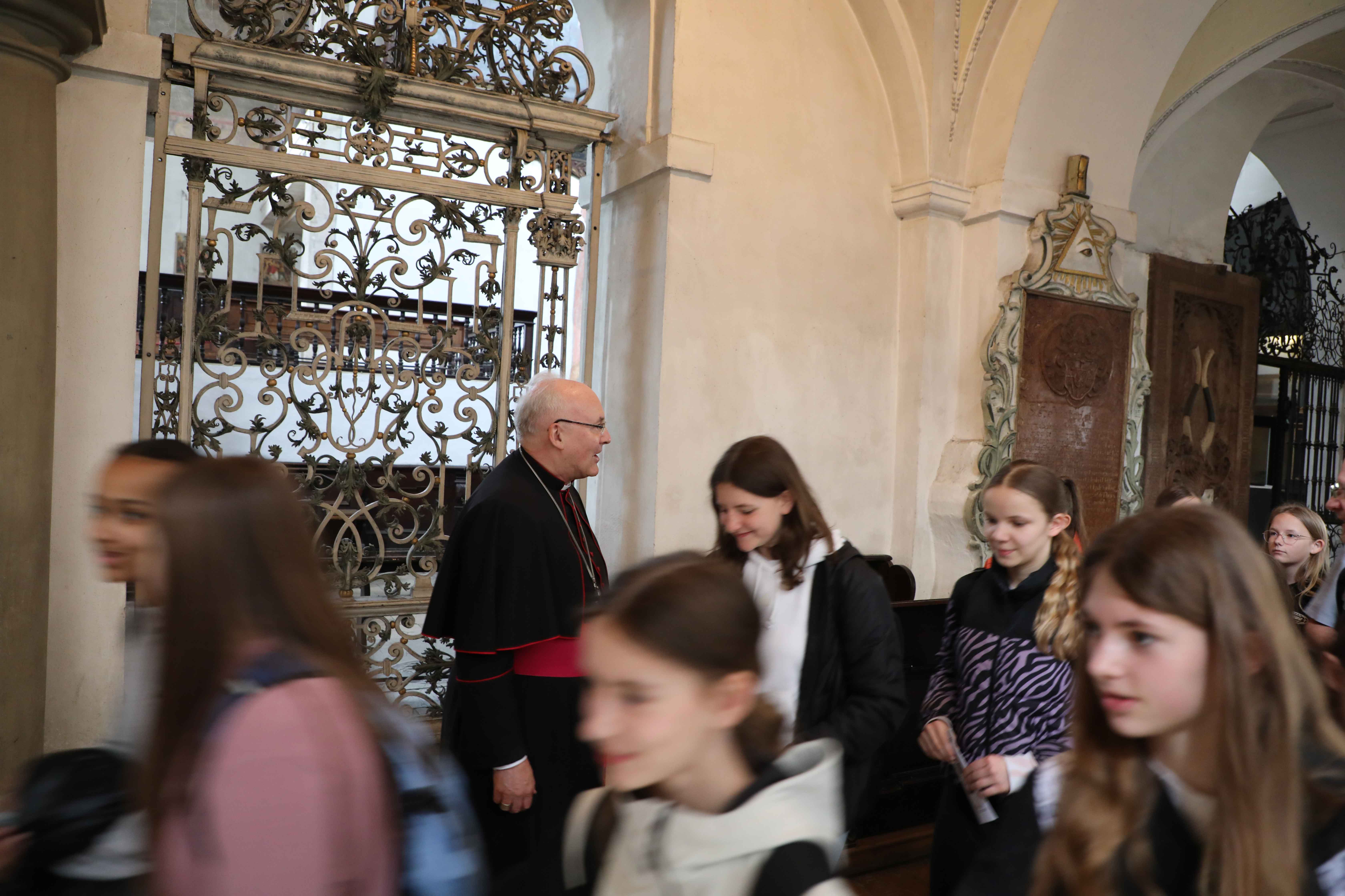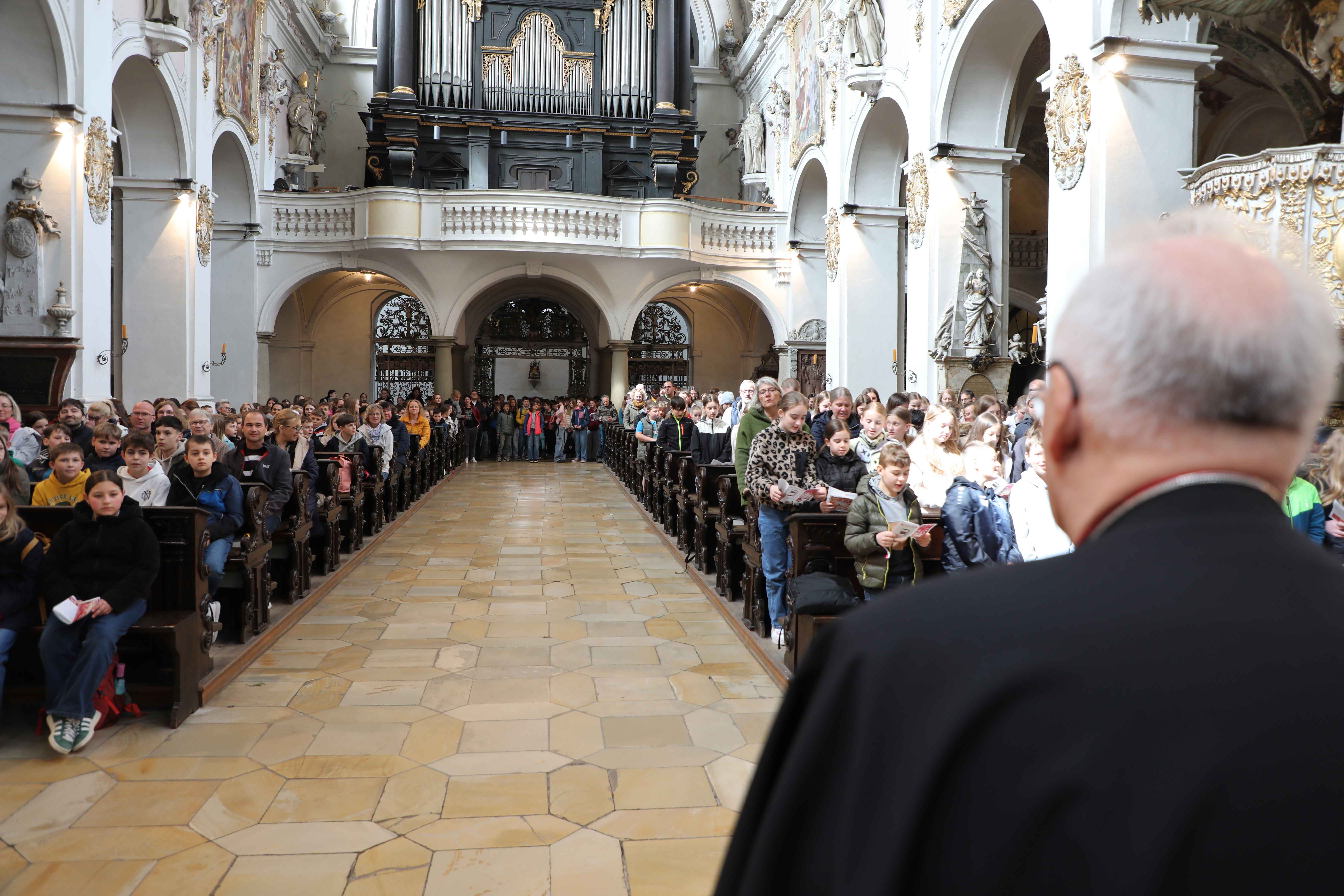 Bevor die Firmlinge in den Sankt Marienschulen aus knapp 30 Workshops ihr Nachmittagsprogramm wählen konnten, versammelten sich alle zuerst in der Basilika Sankt Emmeram, um gemeinsam eine Andacht zu feiern. Bischof Rudolf Voderholzer nahm sich extra die Zeit und empfing die Firmlinge per Handschlag am Portal der Basilika. Die große Anzahl an jungen Christinnen und Christen freute den Regensburger Bischof. „Es ist schön, dass ihr euch die Zeit nehmt und euch geistlich und auch später in den Workshops auf die Firmung vorbereitet“, so Bischof Rudolf. Den Kindern erklärte er, dass der Grundstein der Kirche von Regensburg in der Basilika Sankt Emmeram gelegt wurde, denn in der Krypta liegen die Gebeine des Heiligen Wolfgang, dessen 1.100 Geburtstag das Bistum Regensburg im vergangenen Jahr mit vielen Veranstaltungen gebührend gefeiert hatte. Die Andacht zeigte wieder einmal, dass Kirche jung und lebendig ist.