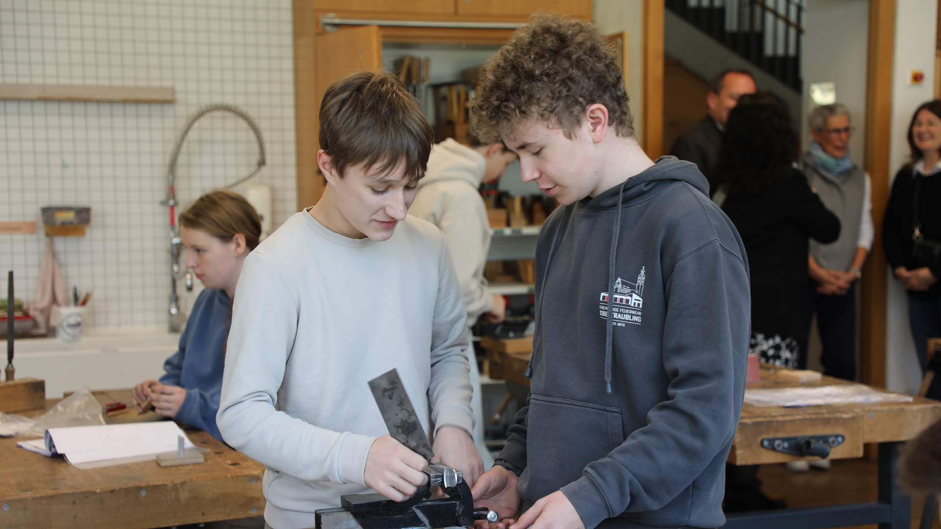 Einer der Schwerpunkte der Mittelschule ist Technik. Die eigene Werkstatt bietet den Jugendlichen dabei die Möglichkeit, kreativ und handwerklich zu arbeiten. Christian Knauer, der Technikleiter erklärt, dass die Schüler industriemäßig ausgebildet werden, damit sie auch draußen Fuß fassen können. In der Schule können sie verschiedene Projekte umsetzen. So entstand im Rahmen der Projektwoche ein Steinteich, erklärte er Bischof Rudolf, den die Schüler aus eigenen Materialien hergestellt haben.