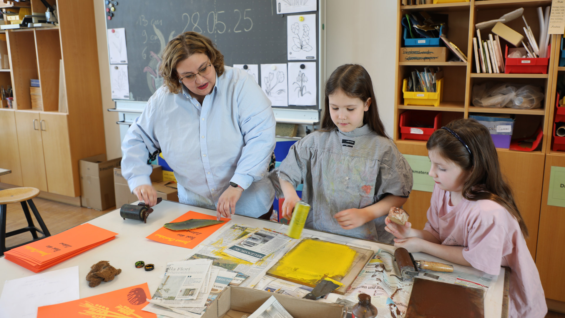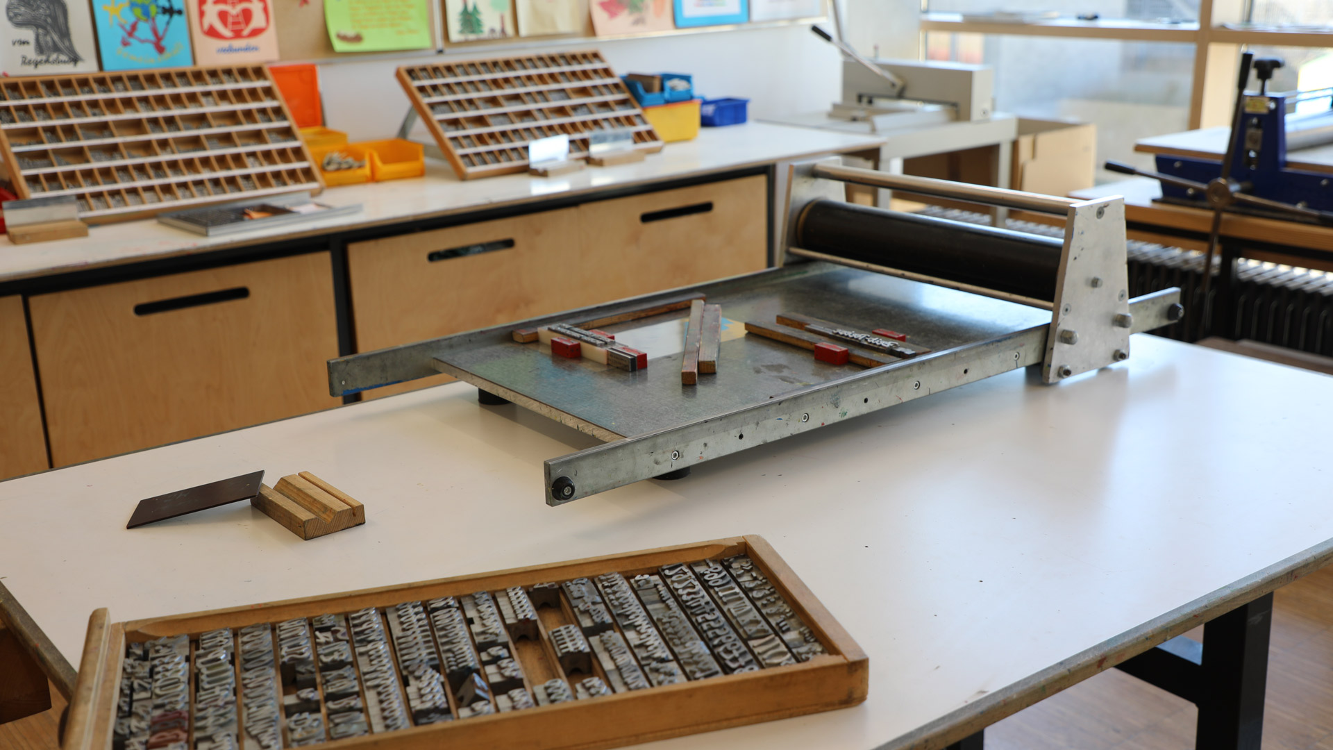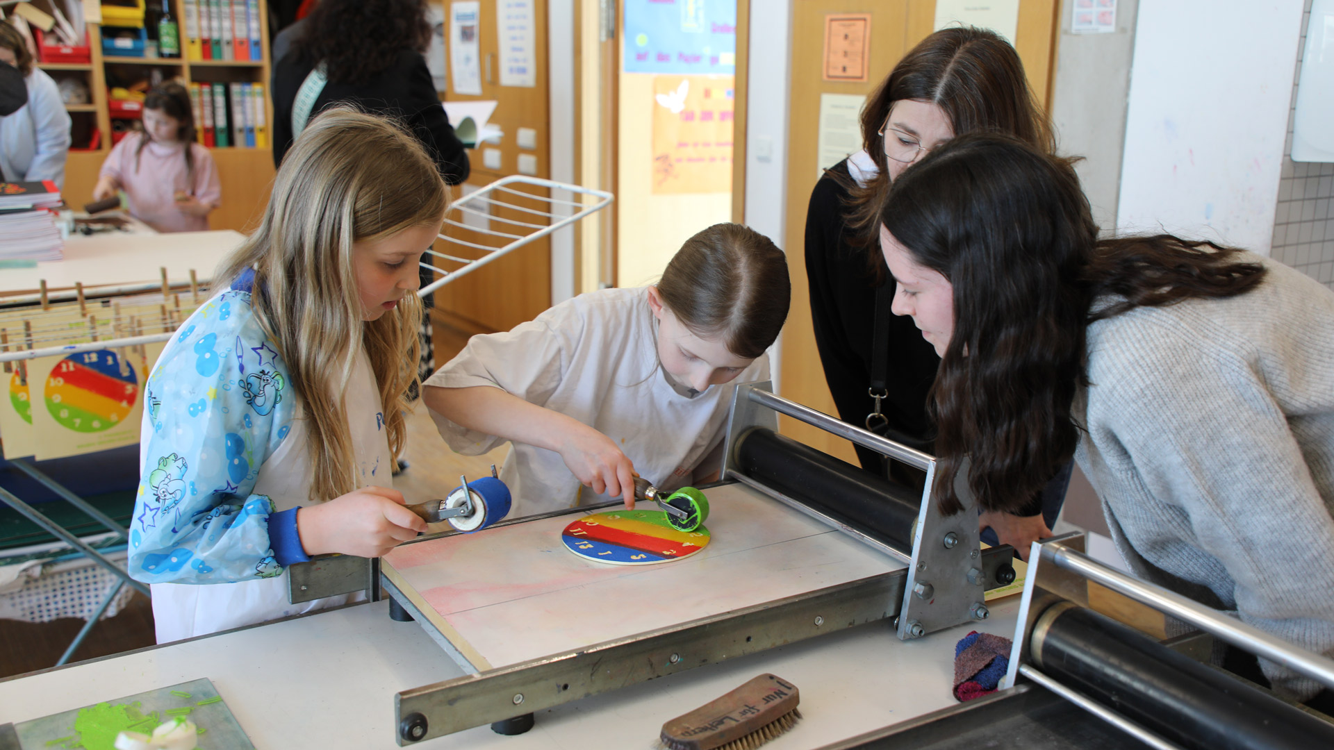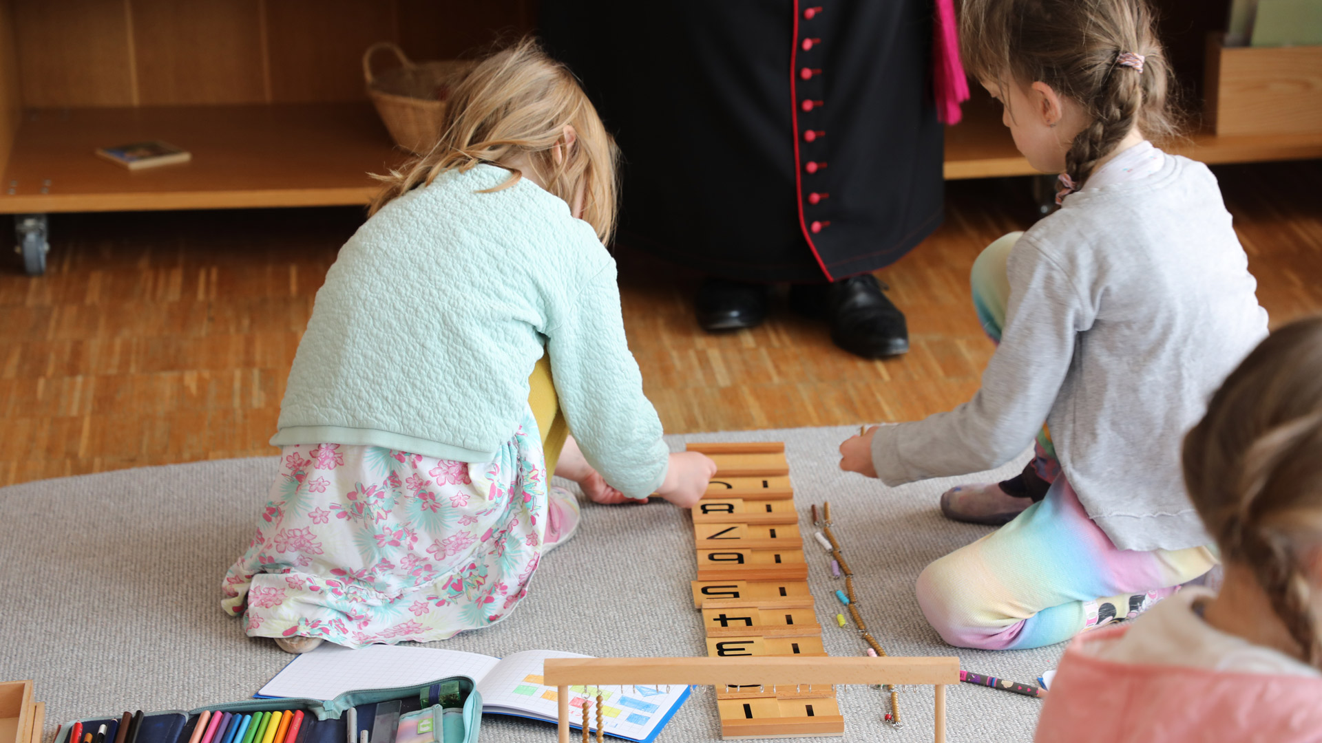 Bei der Führung warf Bischof Rudolf auch einen Blick in die schuleigene Druckerei. Von hier bekäme er jedes Jahr eine Karte, sagte er stolz, als er den Schülern beim Drucken zuschaute. Die Schüler setzen in der Freinet-Schuldruckerei selbst die einzelnen Metall-Lettern spiegelverkehrt zusammen, drucken und gestalten Grafiken, Deckblätter oder die jährliche Weihnachtskarte. Die vielen Projekte und die Beteiligung bewirkt bei den Kindern einiges, findet die Schulleiterin. „Ich glaube, dass Kinder so Freude an der eigenen Arbeit entwickeln, wenn sie merken, dass sie ernst genommen werden, selber entscheiden dürfen und dass sie dadurch zu mündigen, gläubigen Christen heranwachsen können.“