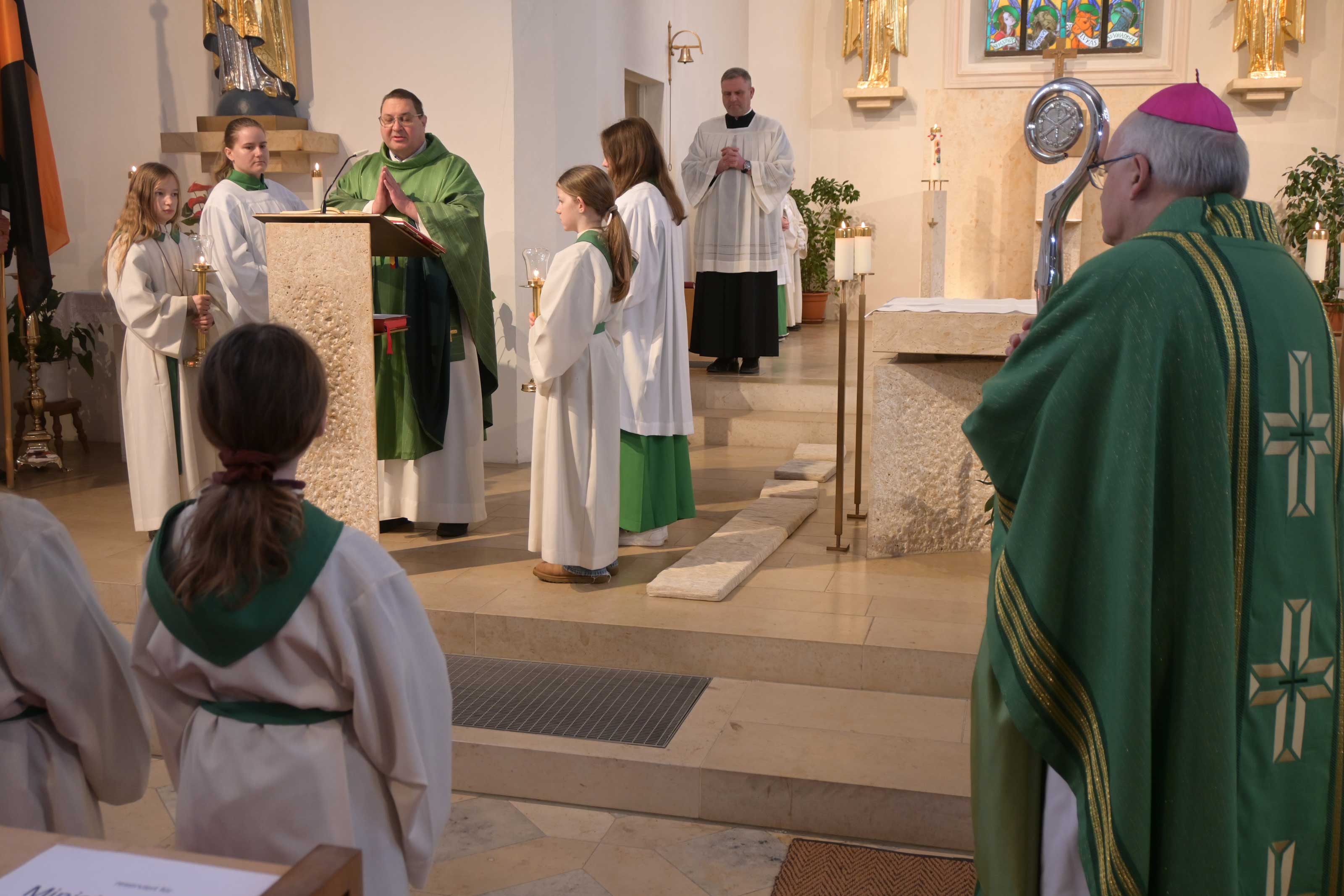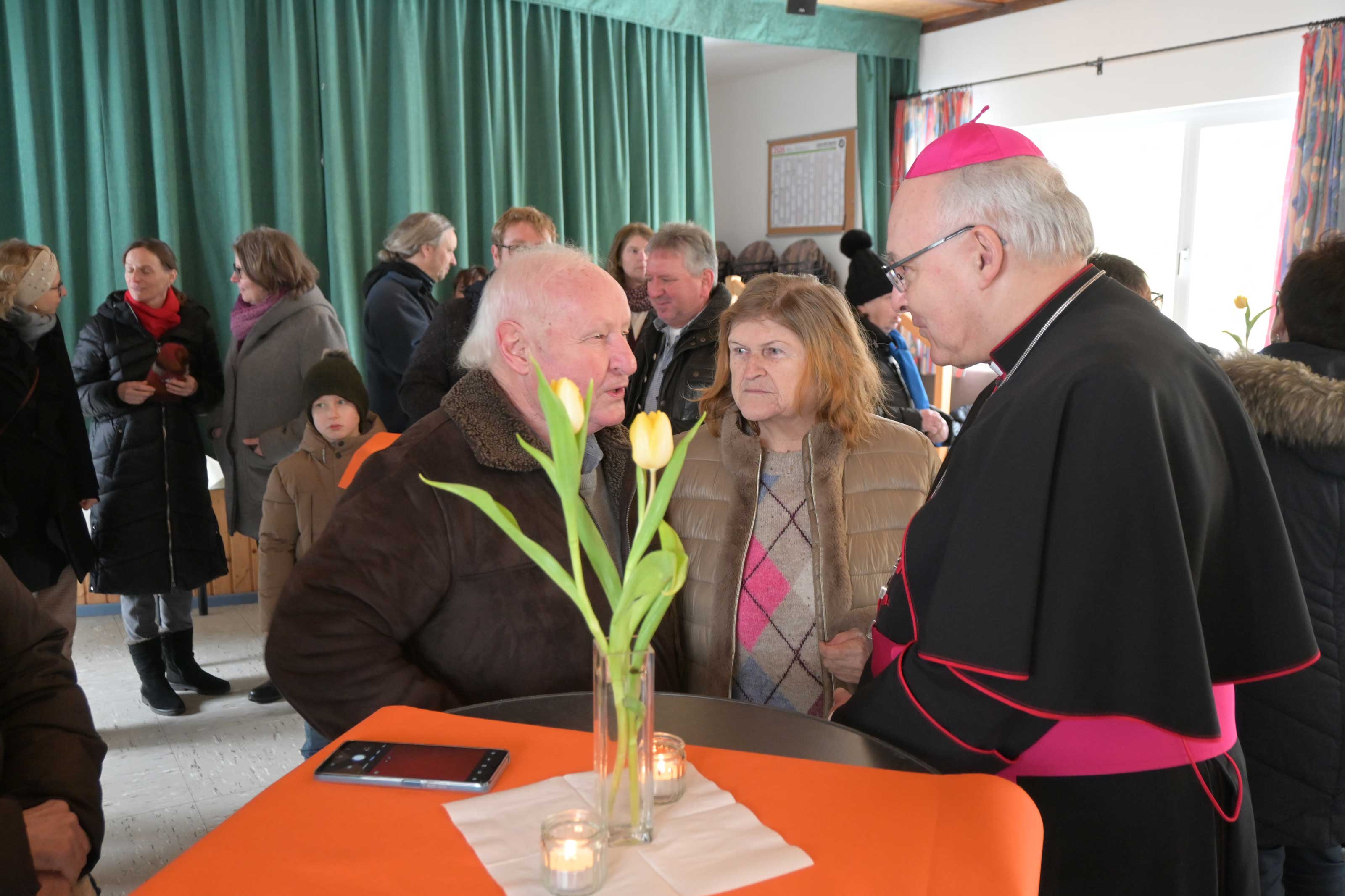 Bei den Fürbitten, die fünf Ministrantinnen vortrugen, wurde deutlich, dass die Messdiener der Pfarrei nicht nur den liturgischen Dienst am Altar übernehmen, sondern auch als Lektoren tätig sind. Nach der Eucharistiefeier, die auch musikalisch von Bläsern mitgestaltet wurde, bestand im Pfarrsaal ausreichend Gelegenheit zum Gespräch mit dem Diözesanbischof. Für eine vielfältige Auswahl an süßen und deftigen Speisen hatten Mitglieder des Frauenbundes gesorgt. Neben kalten Getränken wurde auch wärmender Tee angeboten.