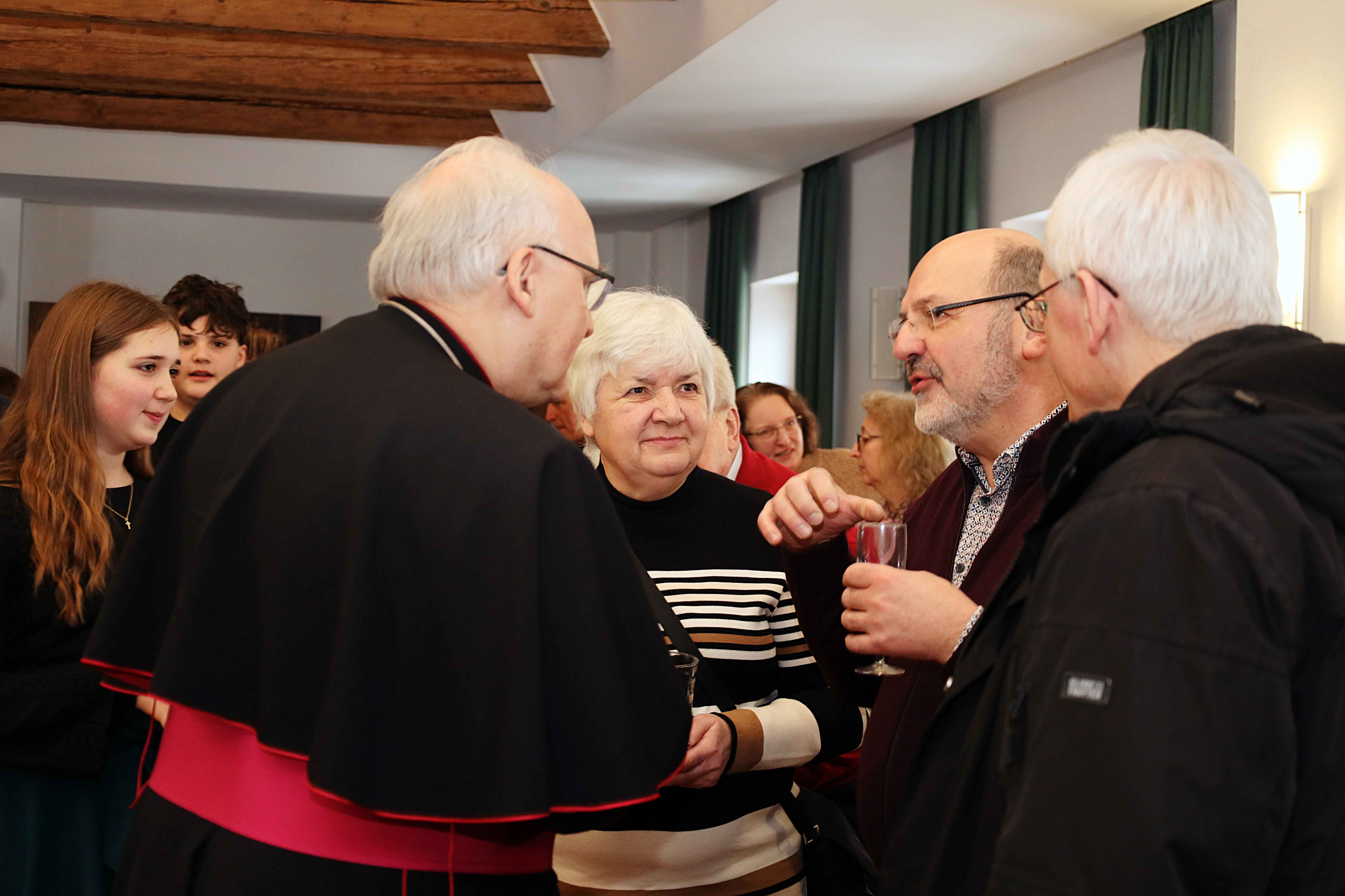 Nach dem Pontifikalsegen setzte sich die Begegnung im Pfarrhaus fort. Beim Sektempfang begrüßte die Pfarrgemeinderatssprecherin Sonja Gonschorek den Bischof offiziell. Auf Bitte des Bürgermeisters trug sich Dr. Rudolf Voderholzer zudem in das Goldene Buch der Gemeinde Loiching ein. Ein kurzer Besuch in der Expositurkirche St. Georg in Wendelskirchen und in der Pfarrkirche in Oberviehbach rundeten den Pastoralbesuch ab.