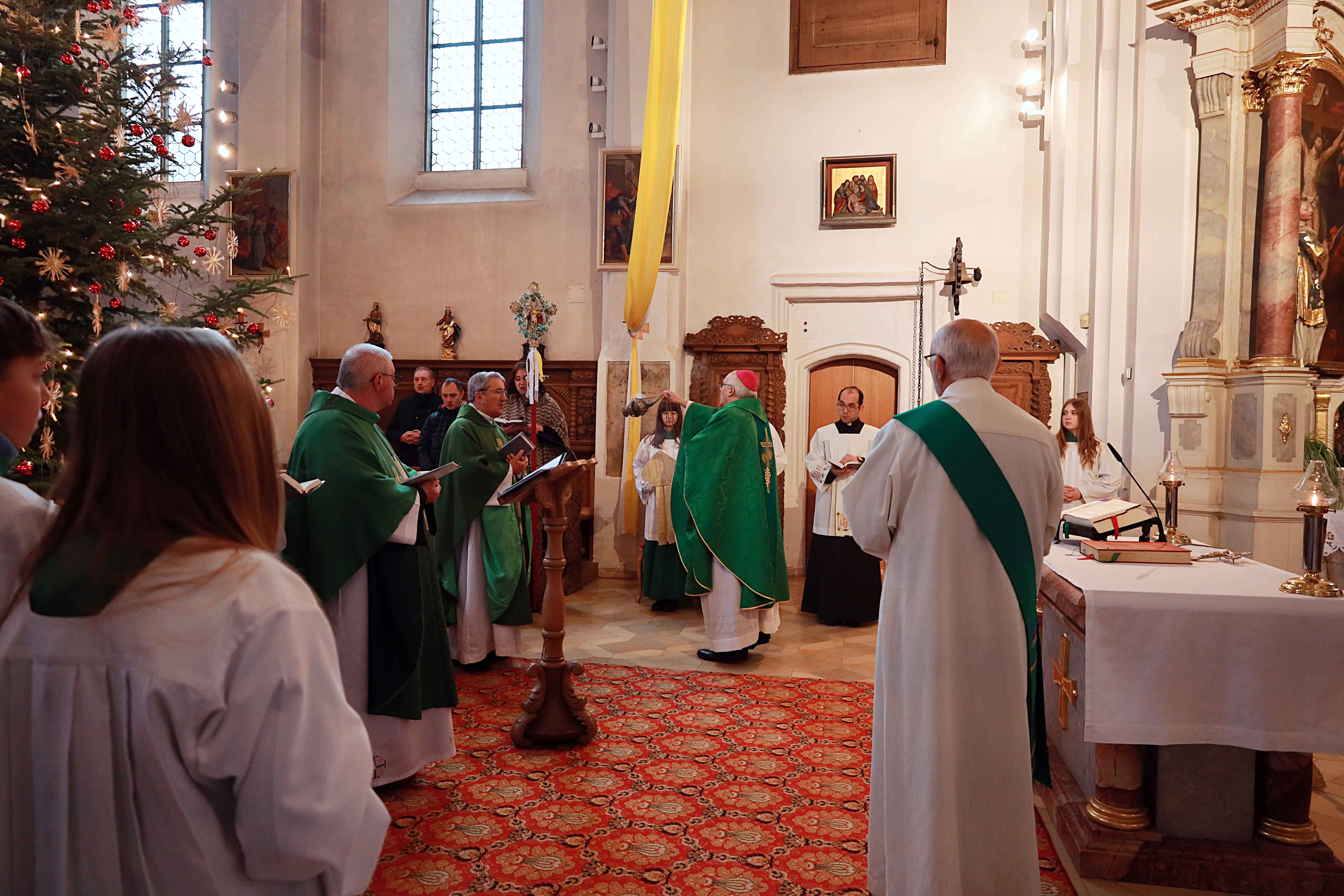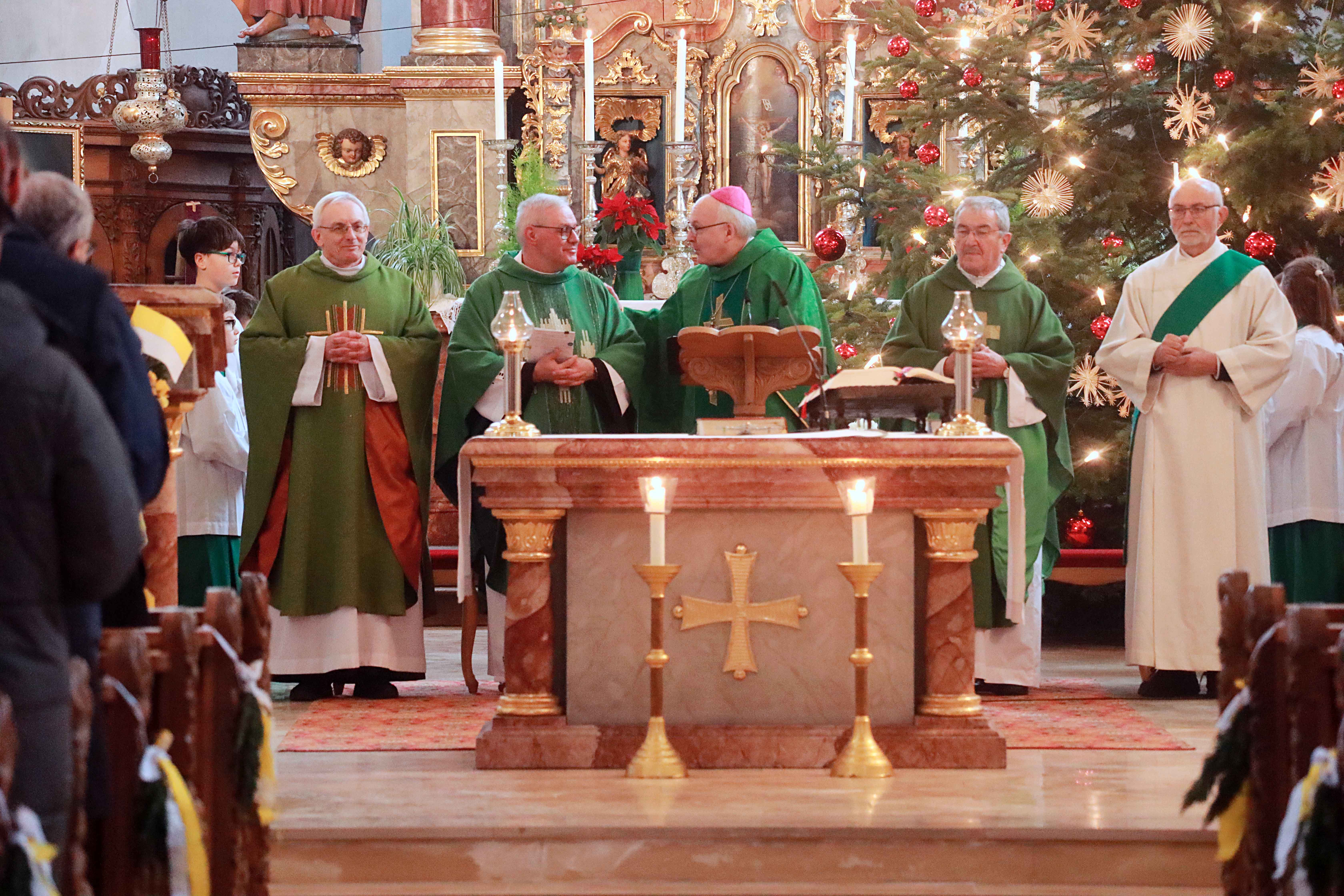 Als Konzelebranten wirkten Pfarrer P. Pawel Kusiak OFM Conv., P. Adam Salomon OFM Conv., Pfarrer Werner Gallmaier sowie Diakon Wolfgang Brandl mit. Die musikalische Gestaltung des Pontifikalamtes übernahm der Gemeinschaftschor Loiching/Niederviehbach unter der Leitung von Marco Heine; an der Orgel begleitete Centa Eisenreich die Feier.
