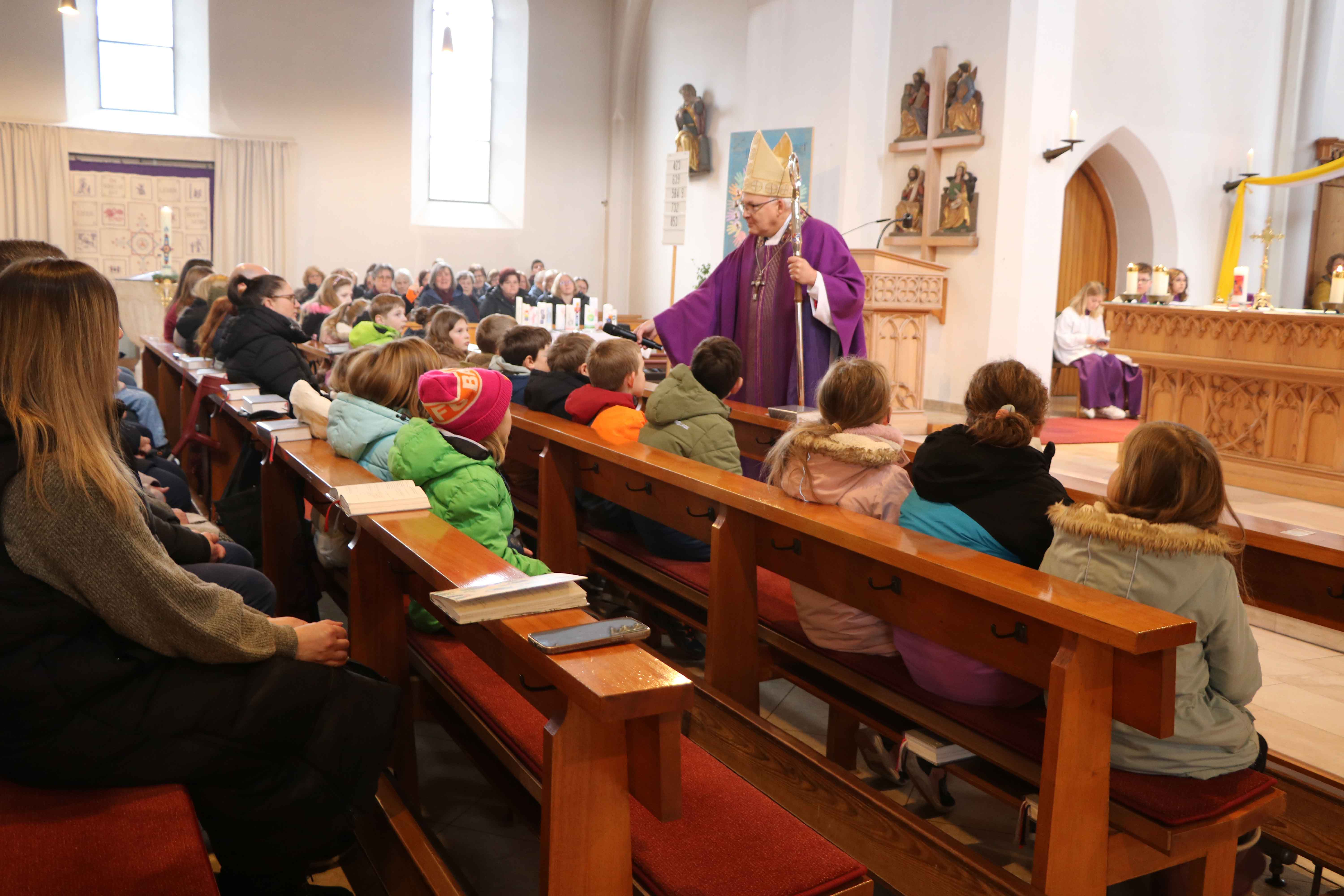 „Er war ein freier Mensch wie wir, von seiner Gottheit getragen, und habe die Versuchung bestanden, obwohl er 40 Tage gefastet habe“, betonte der Bischof. Jesus habe sich nicht dazu verleiten lassen, aus Steinen Brot zu machen, sondern in der Eucharistie mache er sich selbst zum Brot für die Menschen. Er habe nicht nach äußerem Ruhm gestrebt, sondern sich aus Liebe ans Kreuz nageln lassen. Seine Königsherrschaft sei eine dienende: ein Herrscher ohne Soldaten, der im Abendmahlssaal vor seinen Jüngern niederknie und ihnen die Füße wasche. Seine Krone sei – wie ein Kommunionkind spontan ergänzt habe – nicht aus Gold, sondern aus Dornen.
