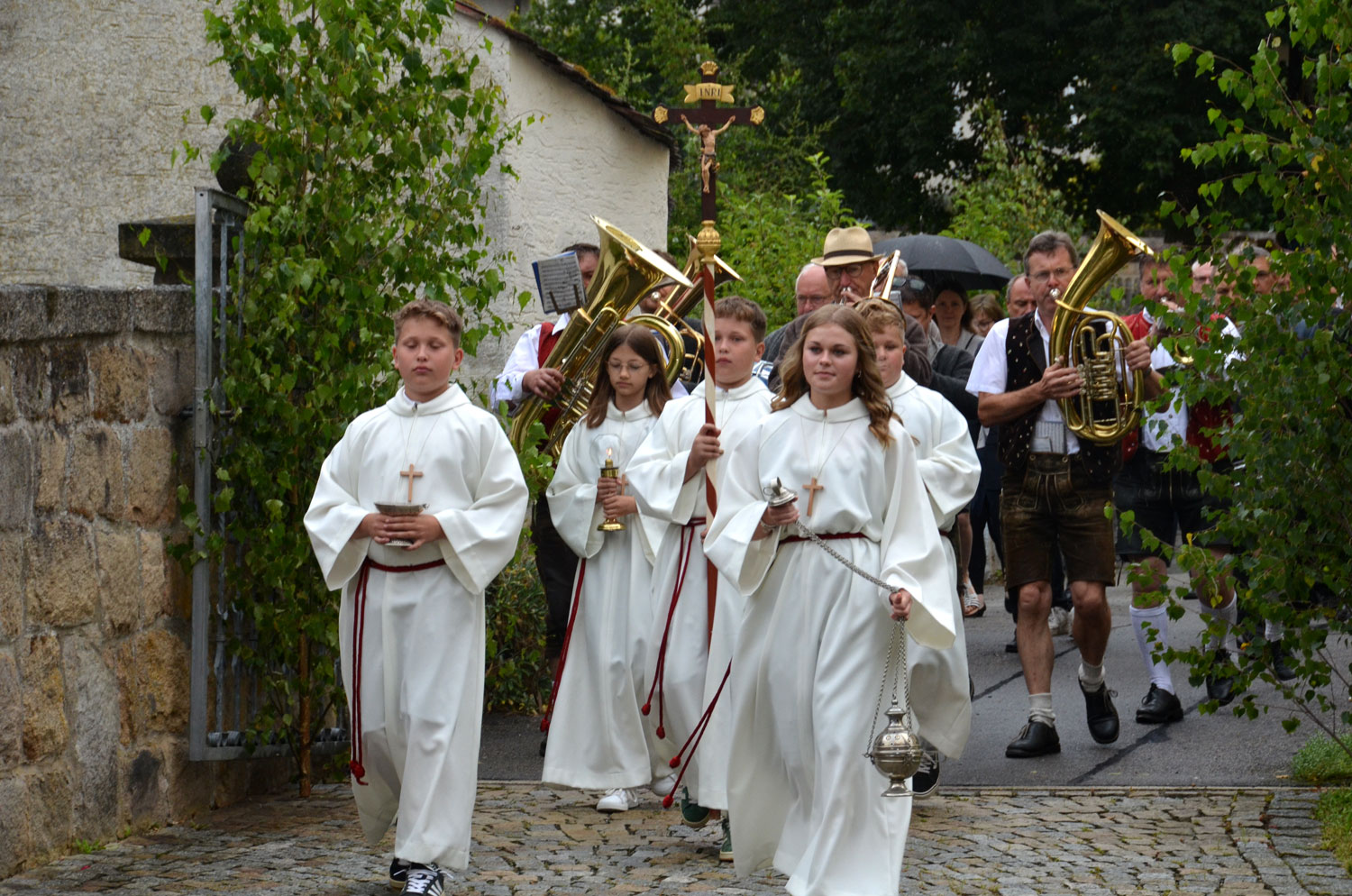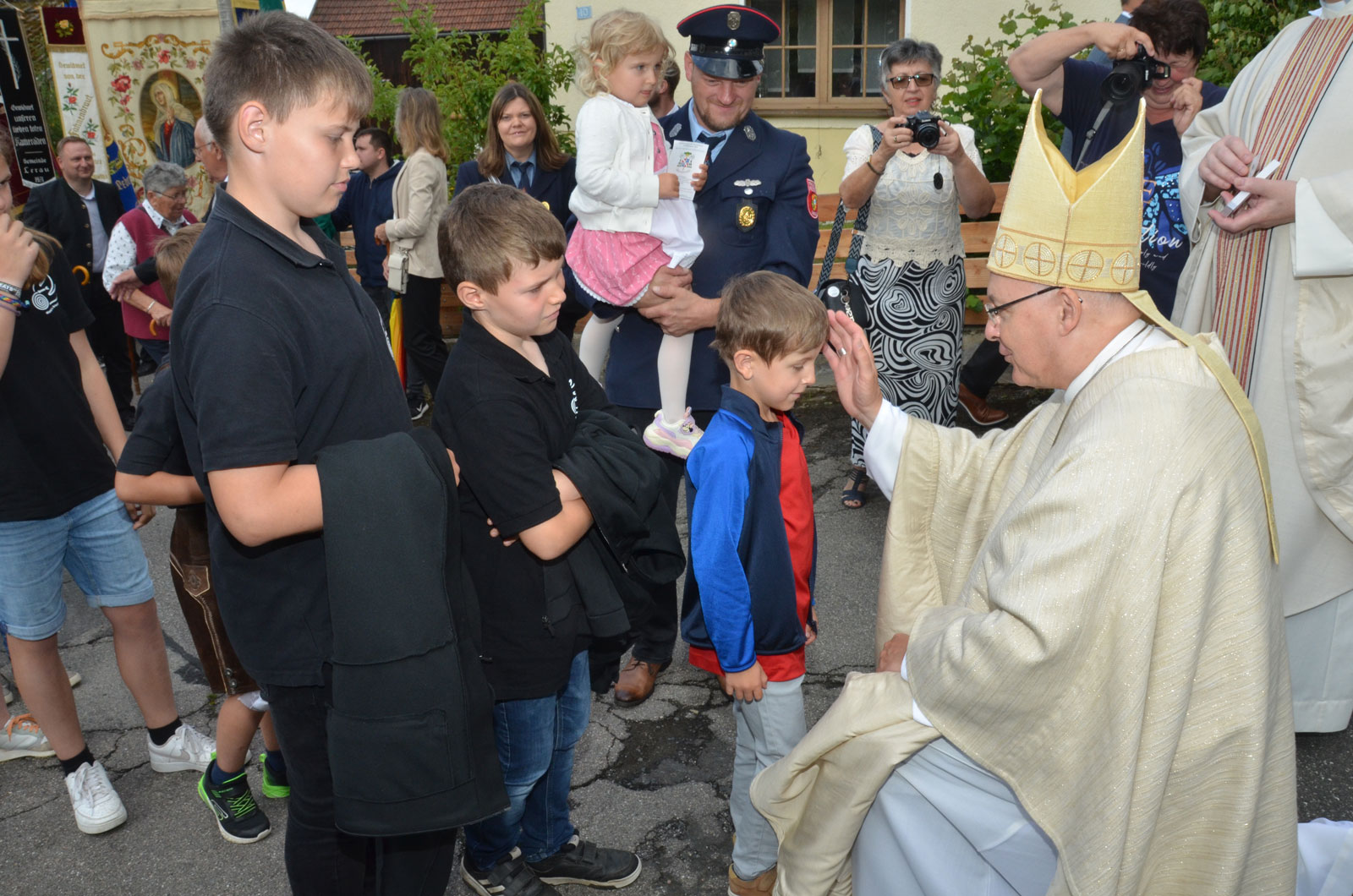In der Ortsmitte wurde Bischof Rudolf mit dem Leuchtenberger Pfarrer Adam Nieciecki, Professor Dr. Stanislaw Fel aus Polen, dem Bischöflichen Kaplan, Domvikar Claudio Alves Pereira, sowie den Messdienern freudig willkommen geheißen. Nach dem Ständchen des Männergesangvereins „Liederkranz“ aus Leuchtenberg unter Leitung von Holger Scheufler und der Kapelle „Bayrisch Blech“ mit Johann Reitinger an der Spitze, formierte sich ein langer Kirchenzug mit Fahnenabordnungen der kirchlichen und weltlichen Verbände sowie den Markträten und dem zweitem Bürgermeister Karl Liegl. Die Zwillinge und diesjährigen Erstkommunikanten, Jeremias und Konstantin Wittmann, durften Mitra und Bischofsstab tragen.