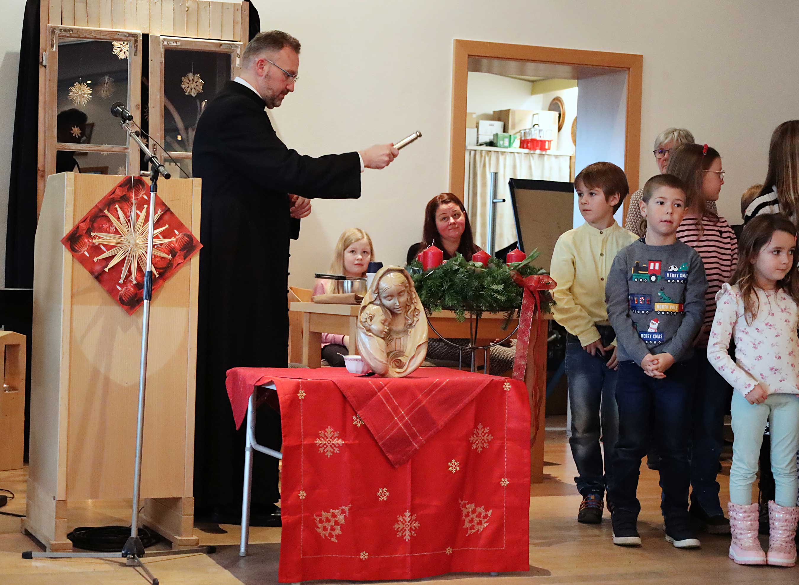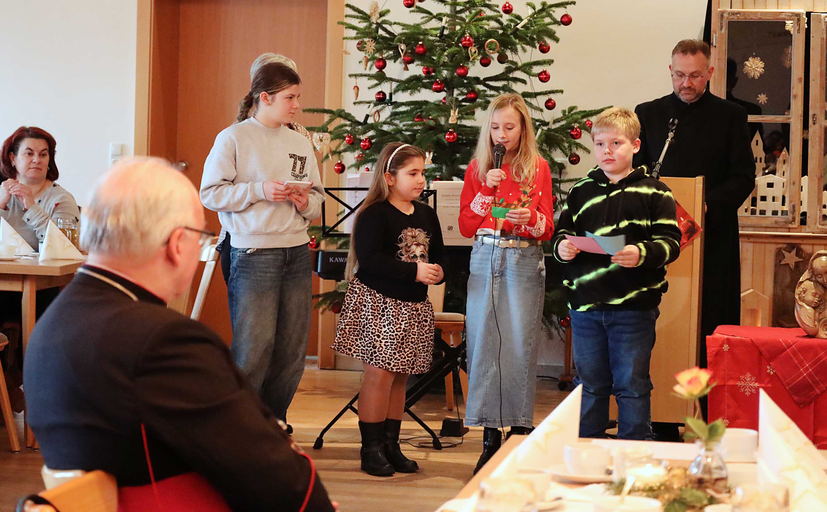 Der Nachmittag im voll besetzten Saal begann besinnlich. Während die KLJB der Pfarreiengemeinschaft noch Getränke ausschenkte und die Gäste bediente, wurde Diözesanbischof Rudolf mit großem Applaus im Bürgersaal willkommen geheißen. Nachdem Pfarrer Dr. Przemyslaw Nowak die Gäste, darunter auch Bürgermeister Anton Kargel und Kirchenpfleger Josef Bachner, begrüßt und den Bischof als „Doktorvater und Mentor“ willkommen geheißen hatte, wurde es still im Raum. Eines der Kinder hatte die ehrenvolle Aufgabe, die erste Kerze am Adventskranz zu entzünden; begleitet wurde dieser Moment von geistlichen Impulsen, ebenfalls vorgetragen von Kindern. In ihren Texten erinnerten sie daran, dass ein „kleines Licht“ Frieden stiften, Mut machen und „heller noch als tausend Kerzen“ in die Welt hinausleuchten kann.