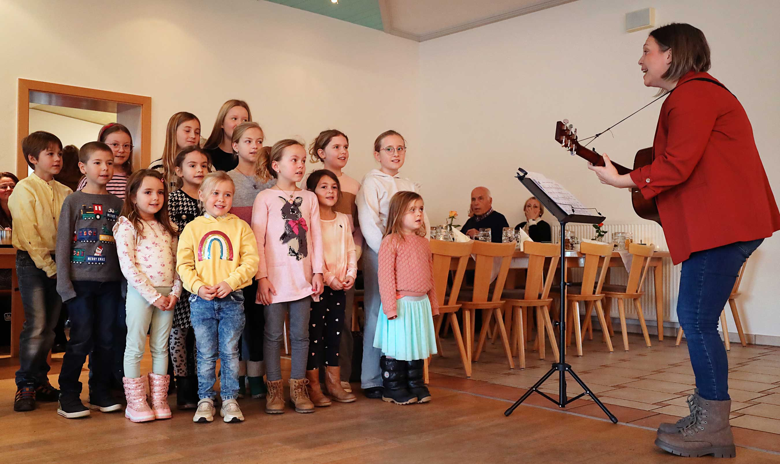 Musikalisch umrahmt wurde der Nachmittag vom Kinderchor unter der Leitung von Katharina Haider. Mit Begeisterung sangen die Kinder Klassiker wie „In der Weihnachtsbäckerei“ und das rhythmische „Nikolo bum bum“, was nicht nur den Bischof zum Schmunzeln und Mitwippen brachte. Zum Abschluss der gelungenen Feier gab es Geschenke – nicht vom Bischof, sondern für ihn: Pfarrer Dr. Nowak und die Pfarrei überreichten ihm als Dank für seinen Besuch ein großes Lebkuchenherz und Tee zur Stärkung für die kommenden Aufgaben.