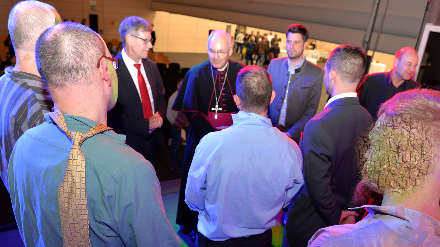 Bischof Rudolf fand gemeinsam mit Christian Gessenharter von der Justizvollzugsakademie, Landrat Andreas Aichinger und Anstaltsleiter Hans-Jürgen Ammansberger das Gespräch mit den Schauspielern. Hier gab es neben lobenden Worten auch Erinnerungen an vorangegangene Stücke. Die Schauspieler erzählten, wie sie ihre Texte lernen, allein in der Zelle, aber dann auch bei den Proben. Bischof Rudolf dankte den Schauspielern für ihre professionelle Darstellung. Die Texte erschlossen sich – und der tiefere Sinn, die Gefahr der totalitären Massenhysterie, wird brillant gezeigt. „Es ist schwer, sich gegen Trends zu behaupten“, betonte Bischof Rudolf. Das Theaterstück zeige, wie sich „erst vernünftige“ Menschen dann verwandeln. Auch warum er Fan der Theatergruppe ist, hob Bischof Rudolf hervor. Es werden hier Begabungen gut gefördert. Man spürt einen wertvollen pädagogischen Effekt – und den Theaterspielern wird etwas zugetraut. „Ich komme wieder“ sagte Bischof Rudolf zum Abschied.