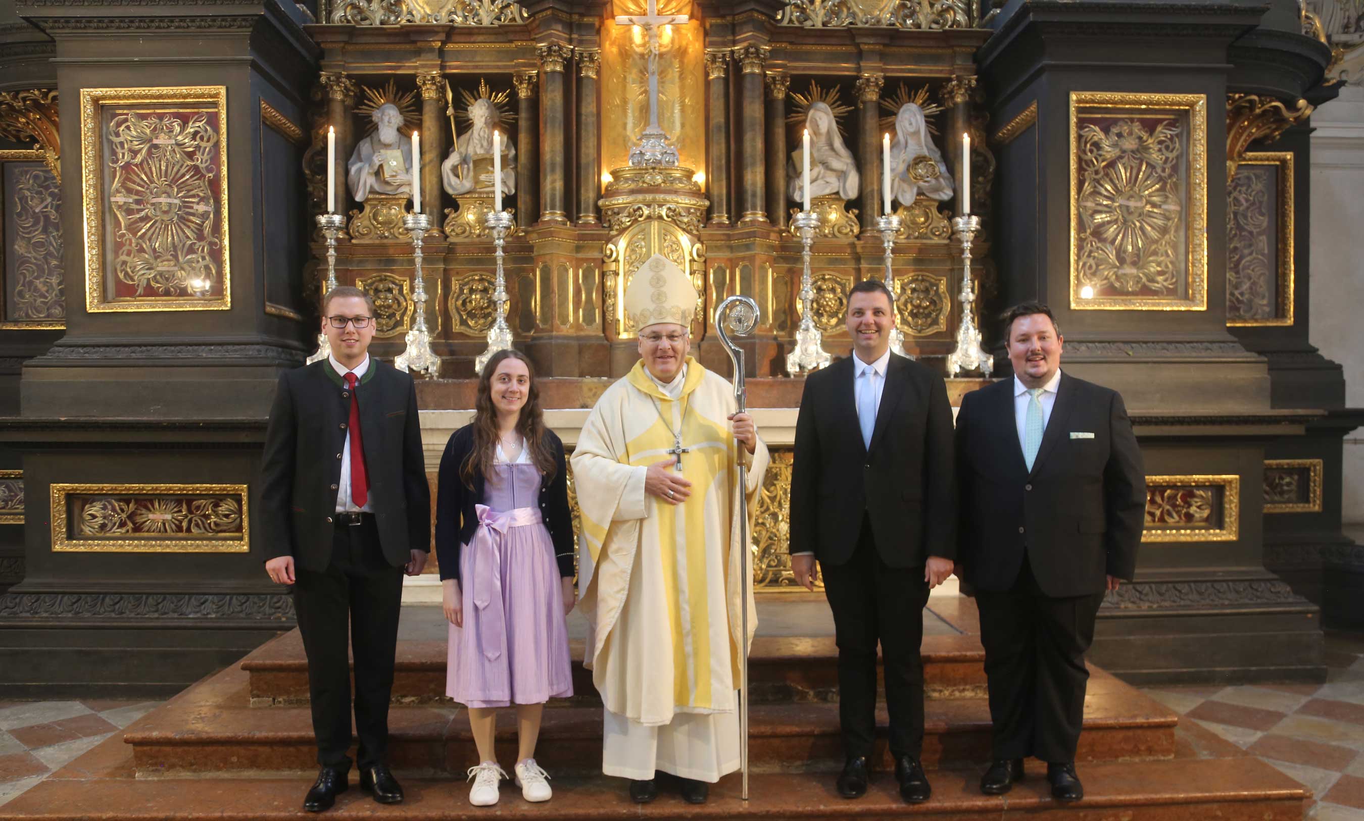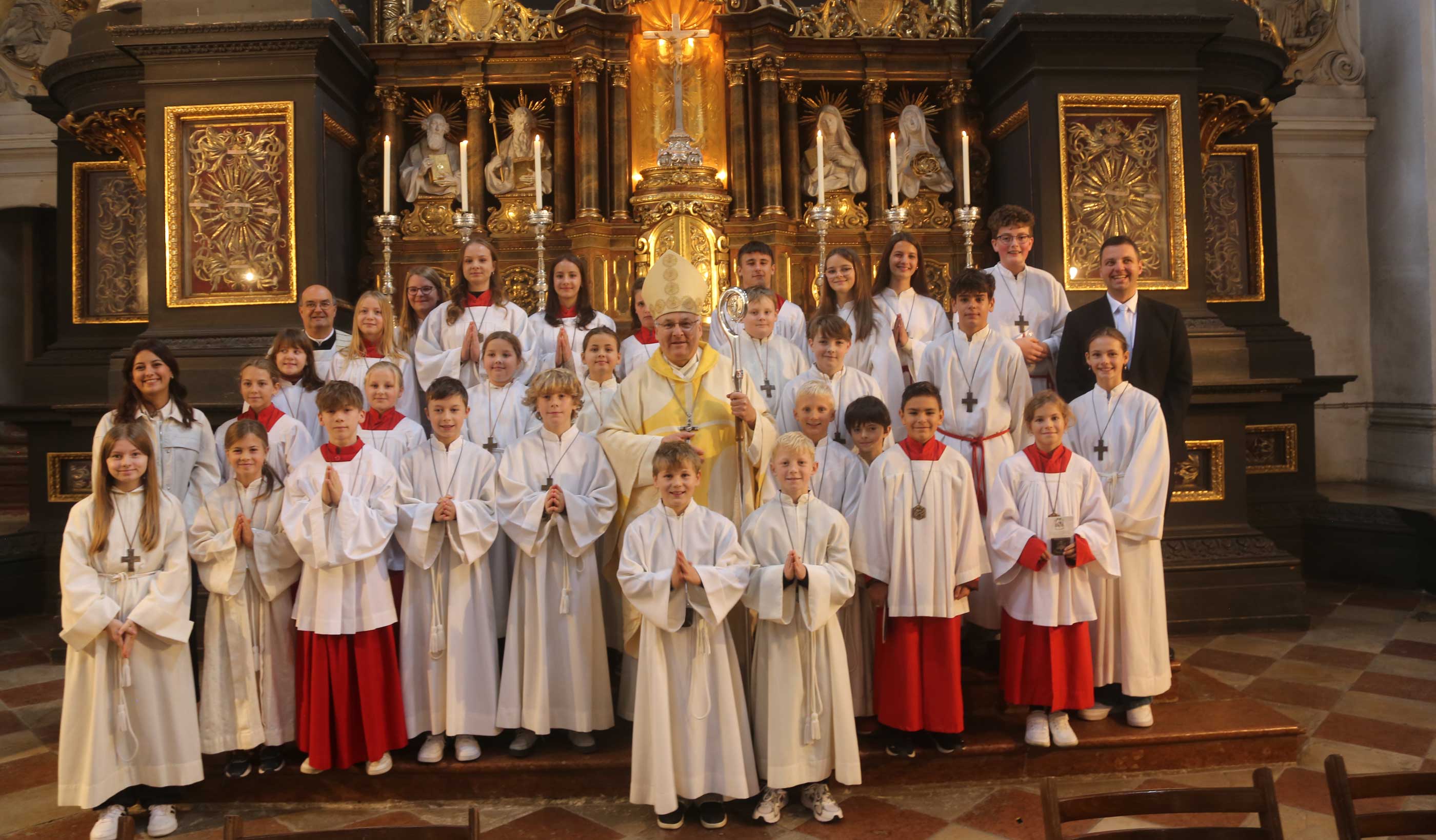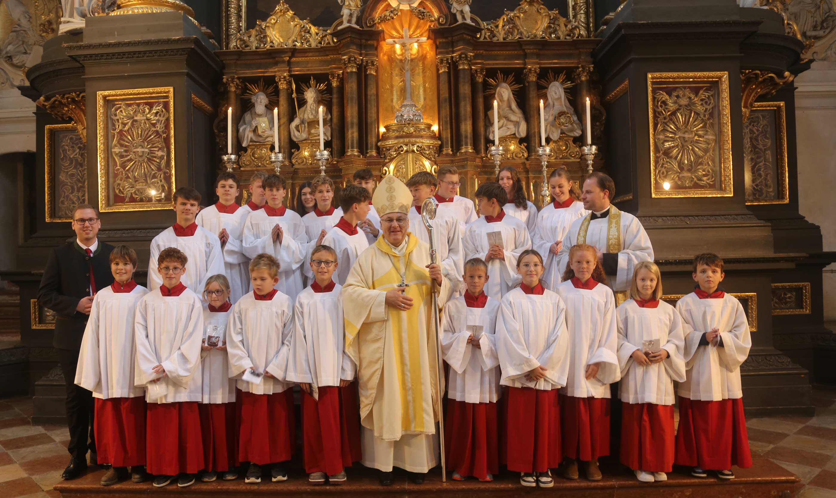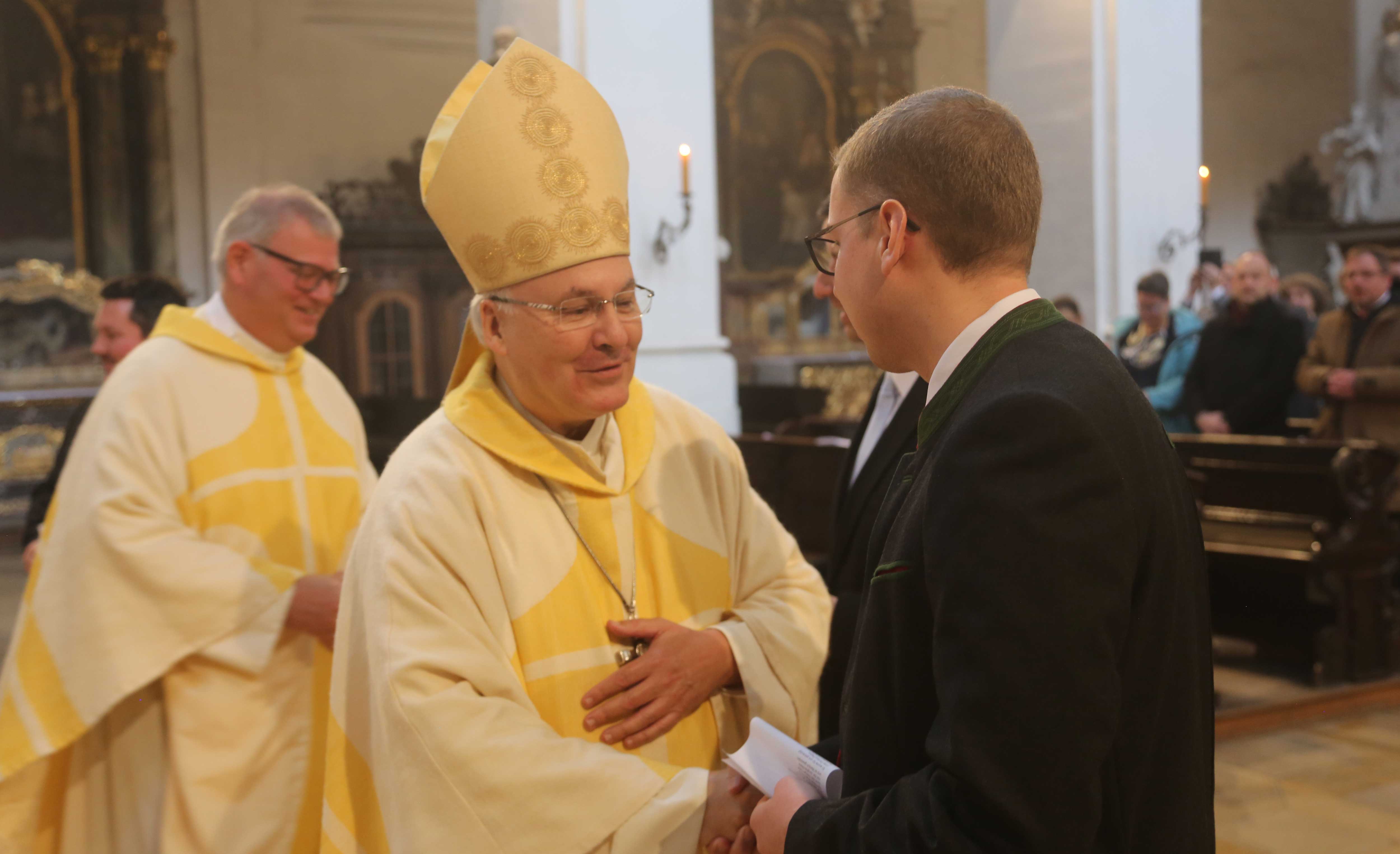 Mit Bischof Rudolf standen am Altar Generalvikar und Domdekan Monsignore Dr. Roland Batz, Dompropst Prälat Dr. Franz Frühmorgen (Leiter der Hauptabteilung Pastorales Personal) und Domkapitular BGR Johann Ammer (Stellvertretender Leiter der Hauptabteilung Pastorales Personal) sowie Diakon Elmar Wechsler aus Regenstauf. Rund 70 Ministranten waren aus den beiden Pfarreiengemeinschaften der neuen Pastoralreferenten gekommen. Ein Projektchor aus den Kirchenchören Falkenstein und Rettenbach gestaltete kirchenmusikalisch mit der Missa in G von Christopher Tambling (1964-2015) und Neuen geistlichen Liedern den Festgottesdienst.