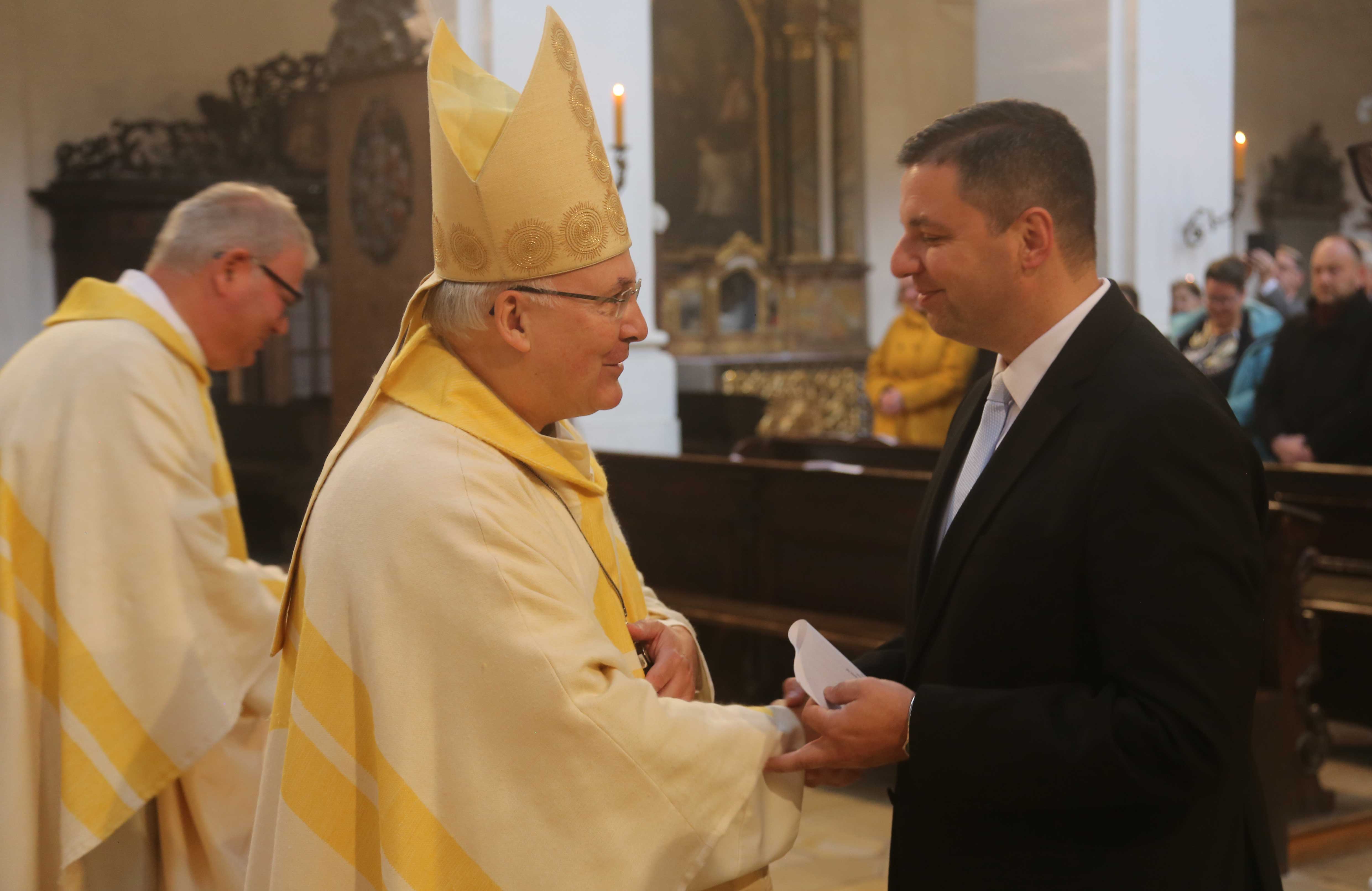 …gab Bischof Rudolf, ganz im Lichte der Lehre des Zweiten Vatikanischen Konzils, den Kandidaten mit auf den Weg: Durch die Anregung der Übersetzung der Bibel in die Landessprachen habe das Konzil „den Tisch des Wortes“ neu gedeckt. In Bibelkreisen sollten sie diese „Urkunde unseres Glaubens“ mit den Gemeinden wieder neu entdecken, auch in der Jugendarbeit solle die Beschäftigung mit biblischen Texten ihren Platz haben. Als nächstes habe das Konzil das Laienapostolat herausgestellt, dass alle getauften und gefirmten Frauen und Männer zu einem lebendigen Glaubenszeugnis berufen seien. Dazu sei es notwendig, so der Bischof, dass sowohl im Religionsunterricht als auch in der Erwachsenenbildung dazu das nötige Rüstzeug vermittelt werde. Damit eng verbunden sei der dritte Punkt, die Berufung aller zur Heiligkeit. Nun richtete er den Blick auf die Petrusstatue am Hochaltar und baute sozusagen eine kleine Katechese mit den zahlreichen Ministranten ein. Dort sieht man den Apostelfürsten mit den für ihn typischen beiden Schlüsseln. In der anderen Hand hält er ein Netz, jedoch nicht mit Fischen, sondern mit Herzen gefüllt. Mit ihrem Dienst sollten die neuen Pastoralen Mitarbeiter Herzen für Gott und Jesus gewinnen. Nach der Predigt rief Domkapitular Johann Ammer als Hauptverantwortlicher für die Pastoralen Dienste (Pastoral- und Gemeindereferent/innen) die vier Kandidaten namentlich auf, diese traten vor den Bischof und legten zuerst das Große Glaubensbekenntnis und dann ihr „Versprechen als pastoraler Mitarbeiter“ ab.