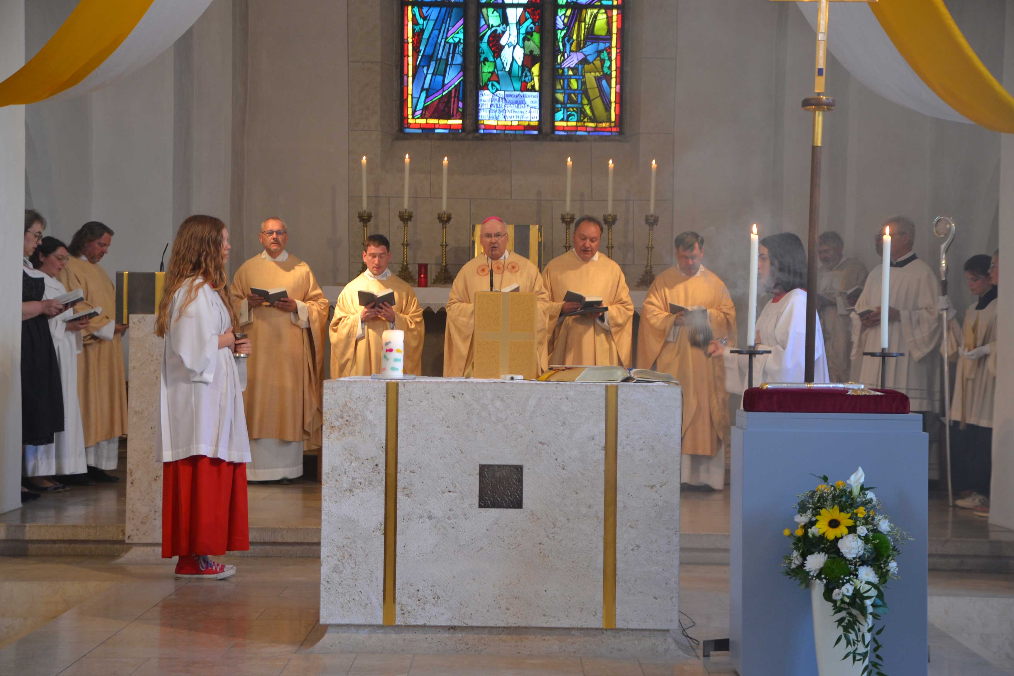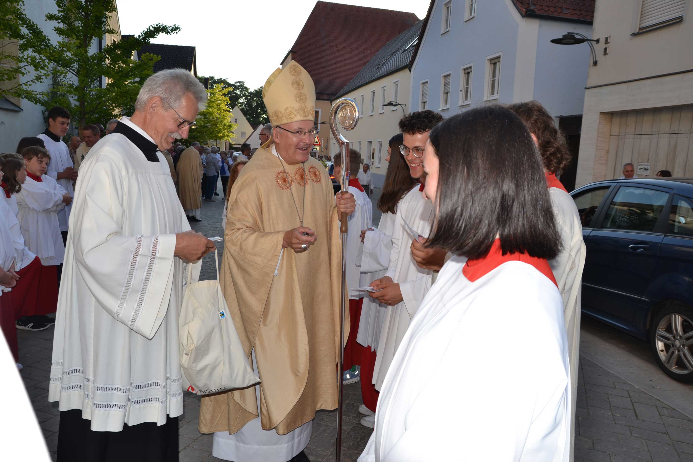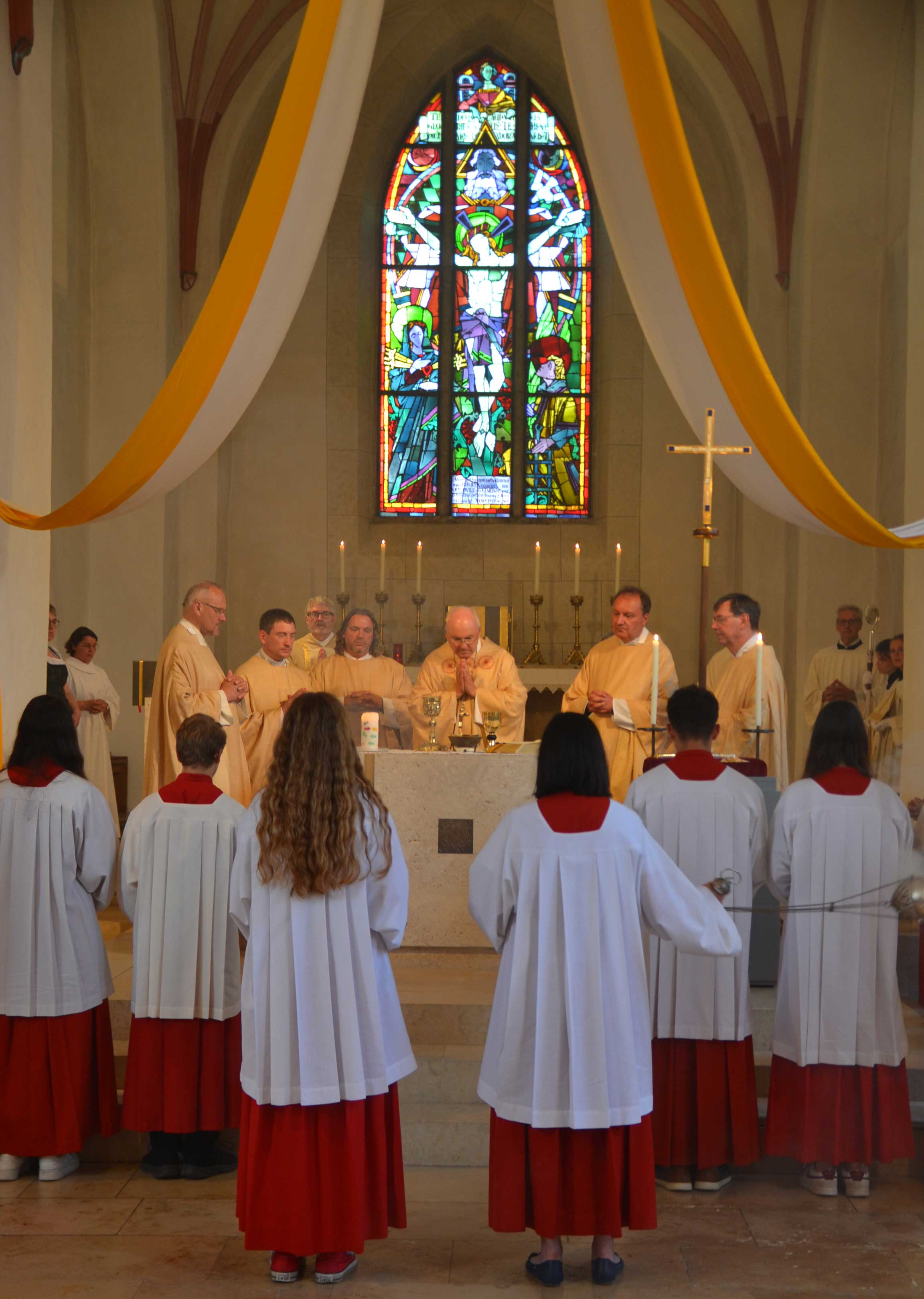 Abschließend dankte er den Priestern der Region für ihre Arbeit in der Weitergabe des Feuers des Glaubens, den Eltern und Großeltern für die christliche Erziehung ihrer Kinder und Enkel, allen an der Liturgie Beteiligten sowie den Vereinen und Verbänden für ihr gelebtes Glaubenszeugnis. Musikalisch gestaltet wurde der Gottesdienst von Kammerchor und Kammerorchester St. Laurentius mit der Missa in C „Trinitatis“ von Wolfgang Amadeus Mozart. Nach der Eucharistiefeier kamen alle Gläubigen noch zur Begegnung im Pfarrheim zusammen.