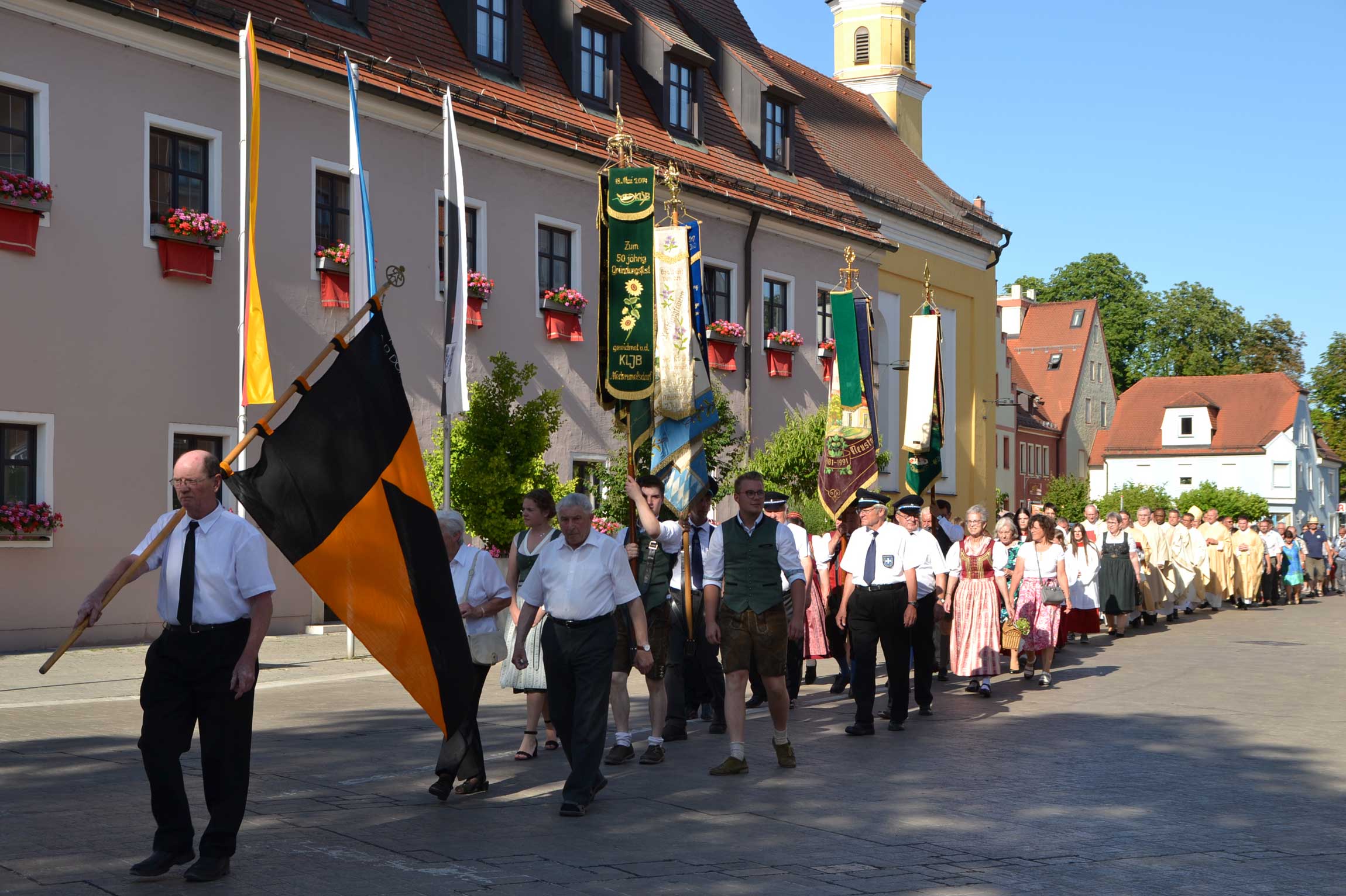 Vor dem Gottesdienst bewegte sich ein langer Zug mit dem liturgischen Dienst, den Vertretern der kirchlichen und weltlichen Vereine sowie einer Abordnung des Stadtrates zur Pfarrkirche, in der Regionaldekan und Stadtpfarrer BGR Thomas Stummer Bischof Rudolf, seine Mitbrüder im geistlichen Dienst aus den Pfarreien der Dekanate Kelheim und Geisenfeld-Pförring, sowie alle Gläubigen begrüßte. In Erinnerung an das Leitwort des Heiligen Jahres „Pilger der Hoffnung“ habe man sich in einer Prozession zur Kirche aufgemacht. Zudem sei auch Wolfgang Zeit seines Lebens ein Pilger der Hoffnung in all seinem Tun gewesen, so Pfarrer Stummer. Bischof Rudolf bezeichnete in seiner Begrüßung Neustadt als idealen Ort für den Beginn der Festwoche, liege die Stadt doch am Wolfgangsweg, der von Pfullingen nach Regensburg verläuft und die Wirkungsstätten des Heiligen ehrt. Besonders freute es ihn, dass sich auch eine Gruppe von Pilgern aus Pfullingen, dem Geburtsort Wolfgangs, unter den Gottesdienstbesuchern befand. Der Höhepunkt der Wolfgangswoche sei die Priesterweihe am 28. Juni im Regensburger Dom, bei der der Diözesanbischof zwei junge Männer durch Gebet und Handauflegung zu Priestern weihen wird.