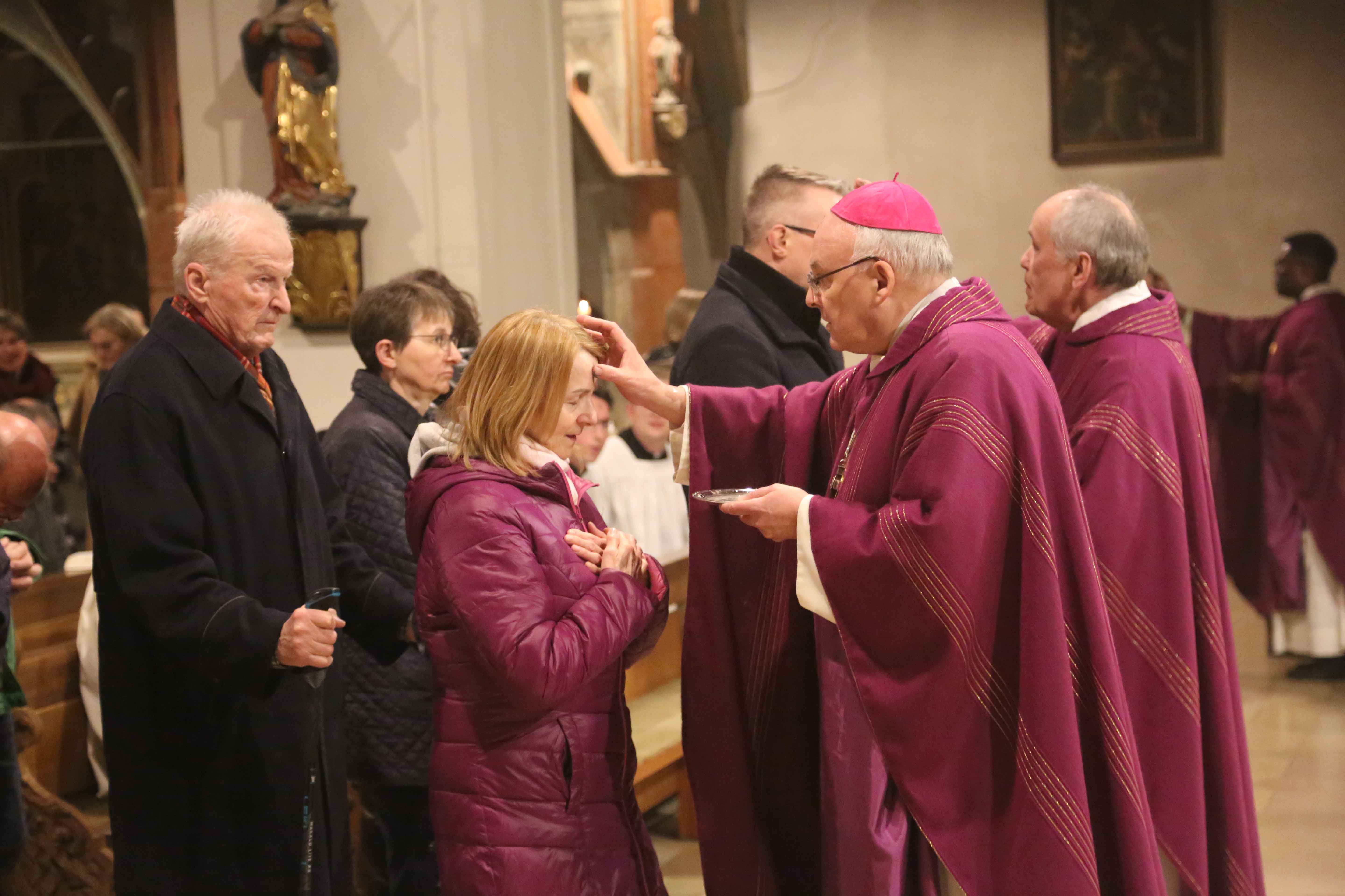 „Die frühlingshaften Temperaturen haben heute schon die Vorfreude auf Ostern genährt, und das ist gut so, denn die österliche Bußzeit ist nicht eine Zeit der Trauer, sondern eine Zeit der Gnade, des Wachsens und des Reifens von Glauben, Hoffnung und Liebe“, mit diesen Worten begrüßte Bischof Dr. Rudolf Voderholzer die Gläubigen am Mittwochabend in der Dompfarrkirche Niedermünster in Regensburg zum Pontifikalamt am Aschermittwoch. Konzelebranten waren Stadtpfarrer Roman Gerl und Pfarrvikar Florent Mukalay Mukuba von der Dompfarreiengemeinschaft St. Emmeram - St. Ulrich sowie einige Mitglieder des Domkapitels. Der Aschermittwoch eröffnet die 40-tägige Bußzeit vor Ostern. Mit der Erteilung des Aschenkreuzes und den mahnenden Worten: „Bedenke Mensch, dass du Staub bist und wieder zum Staub zurückkehren wirst“ wurde auch ein äußeres Zeichen der inneren Bußbereitschaft und Vergänglichkeit gegeben.
