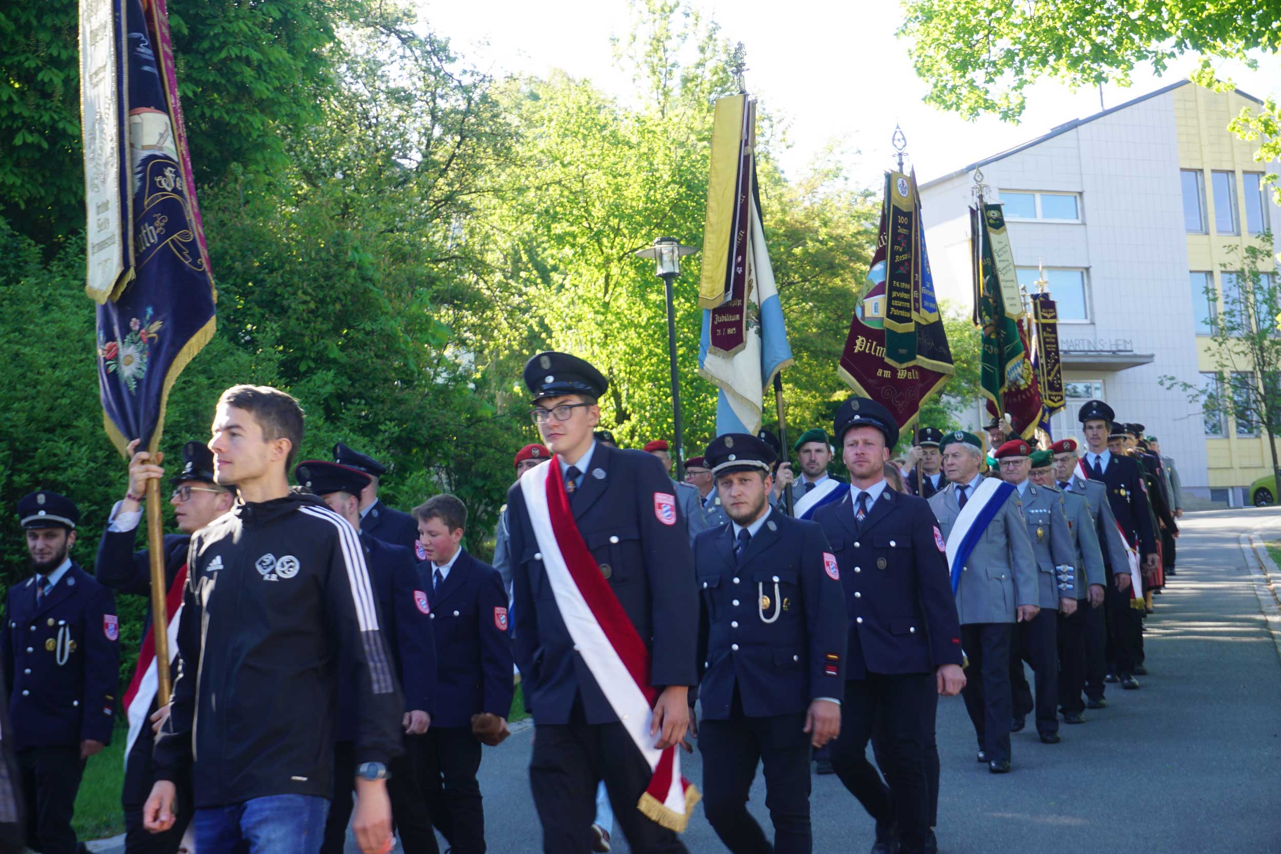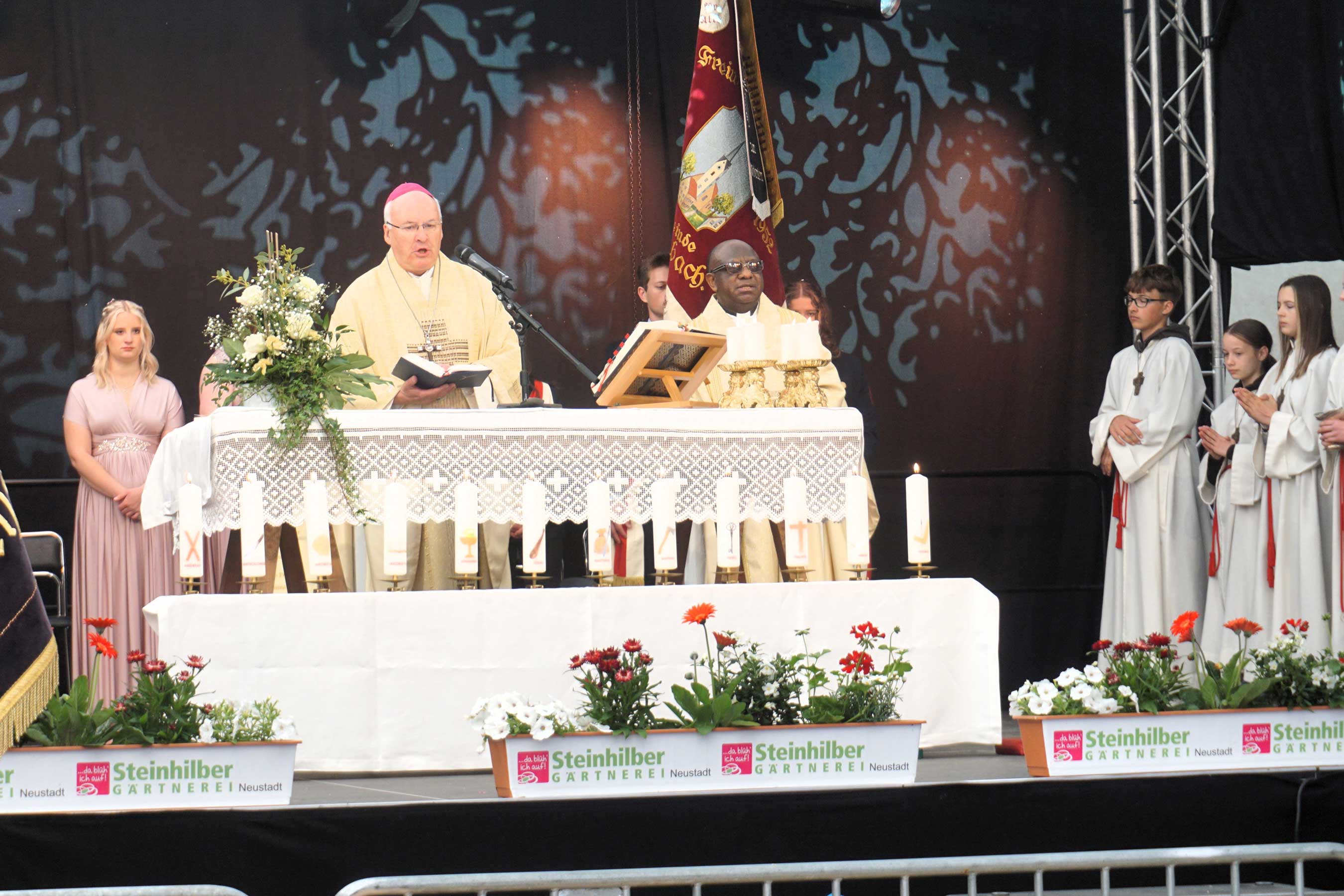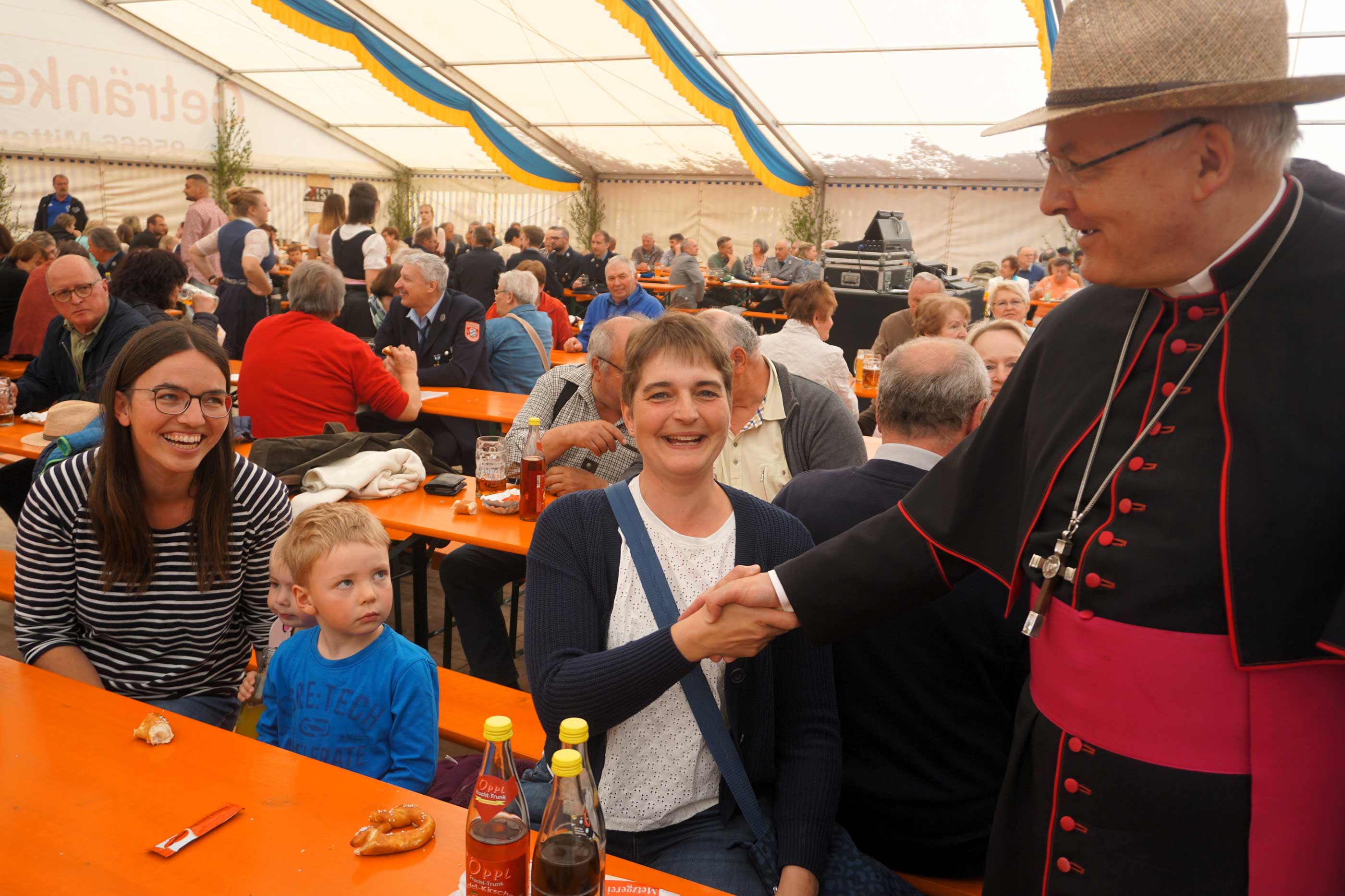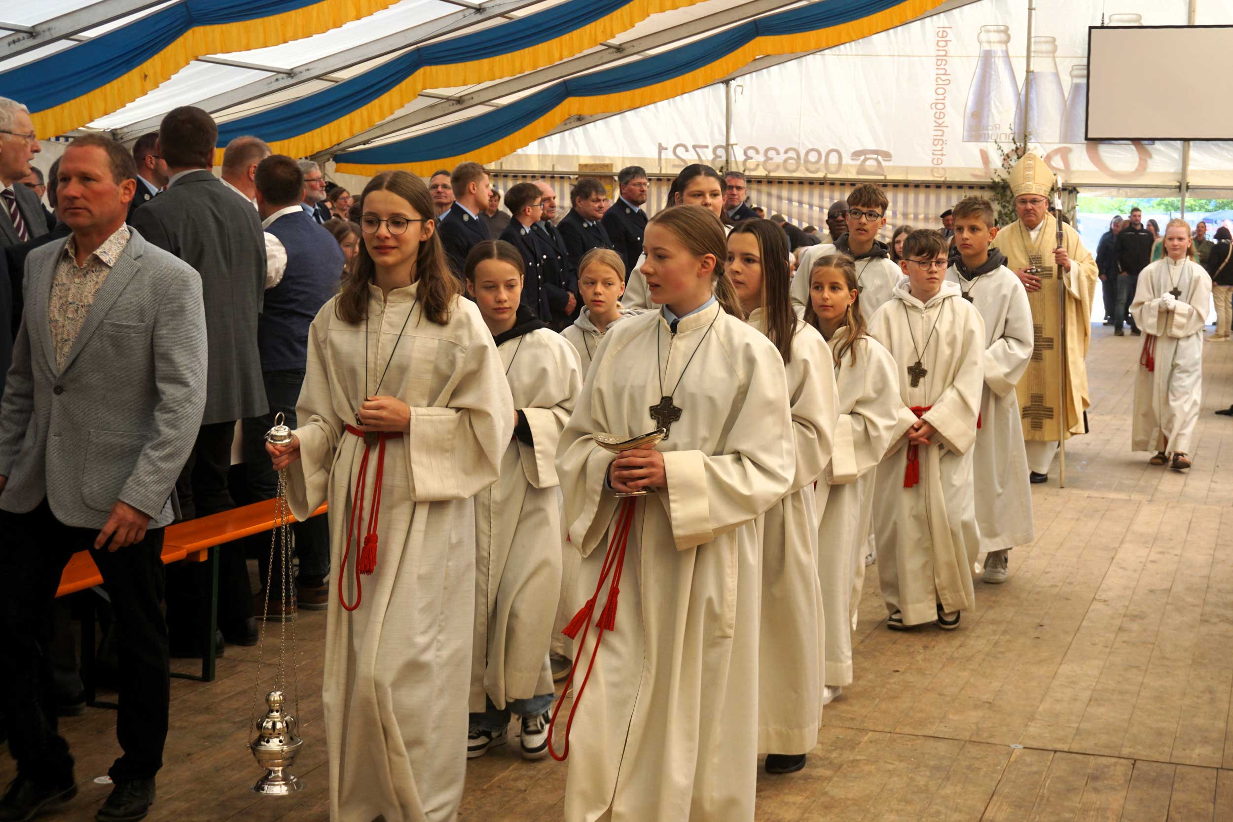 Im weiteren Verlauf der Pontifikalmesse segnete Bischof Rudolf die Fahnenbänder und Freundschaftszeichen, die die FFW Griesbach von befreundeten Wehren bekam. Erster Vorstand David Riedl moderierte den Reigen der Grußworte. Reiner Meier, MdB a.D., wies als Schirmherr des Jubiläums darauf hin, dass das Emblem der Griesbacher Feuerwehr die Kirche zeigt: „Damit schließt sich der Kreis der Nächstenliebe!“ Dr. Alfred Scheidler, der stellvertretende Landrat des Landkreises Tirschenreuth, hieß den Bischof willkommen und gratulierte der FFW Griesbach herzlich zu ihrem Jubiläum. Beim Abschlusssegen bat Bischof Rudolf auch um die Fürsprache des Heiligen Florian, des Schutzpatrons der Feuerwehr. Der Festtag mit dem Bischof begann mit dem Kirchzug, der von der Kirche zum Festzelt führte. Dort begrüßte Pfarrer Dr. Charles Ifemeje den Bischof herzlich in Griesbach. Er bat ihn, die Festgemeinde mit seinen Worten zu stärken: „Denn wir alle brauchen doch immer wieder diese Bekräftigung.“