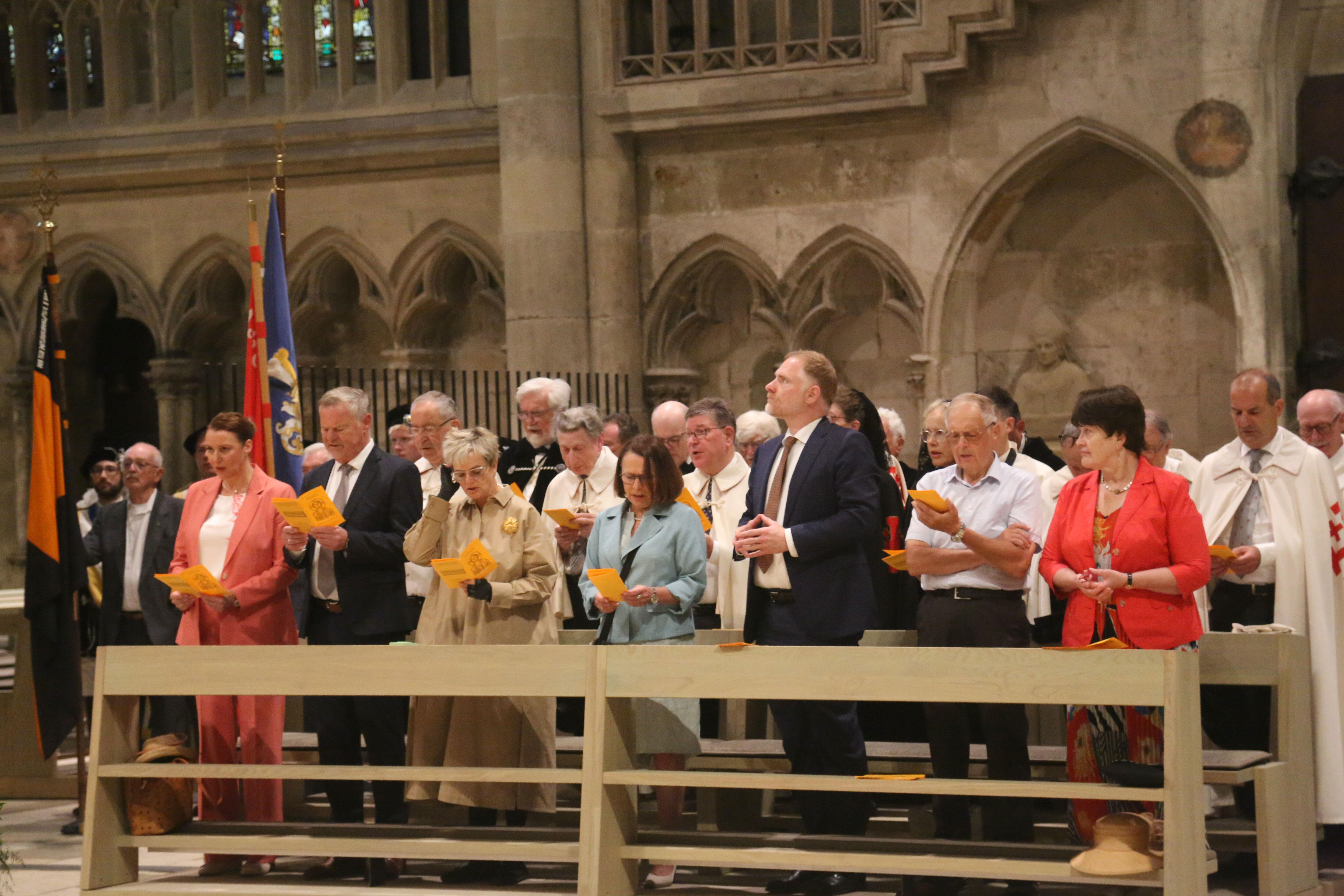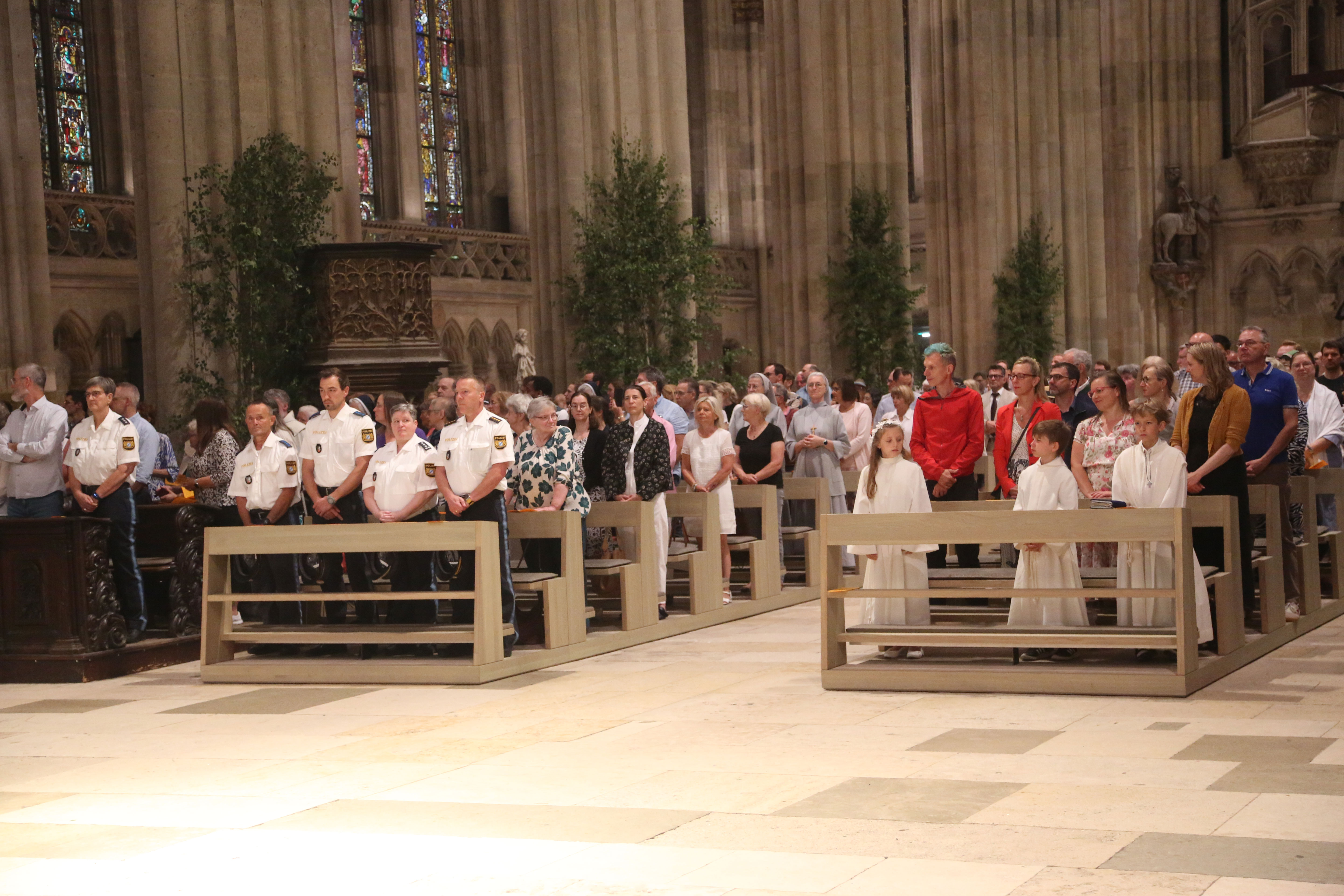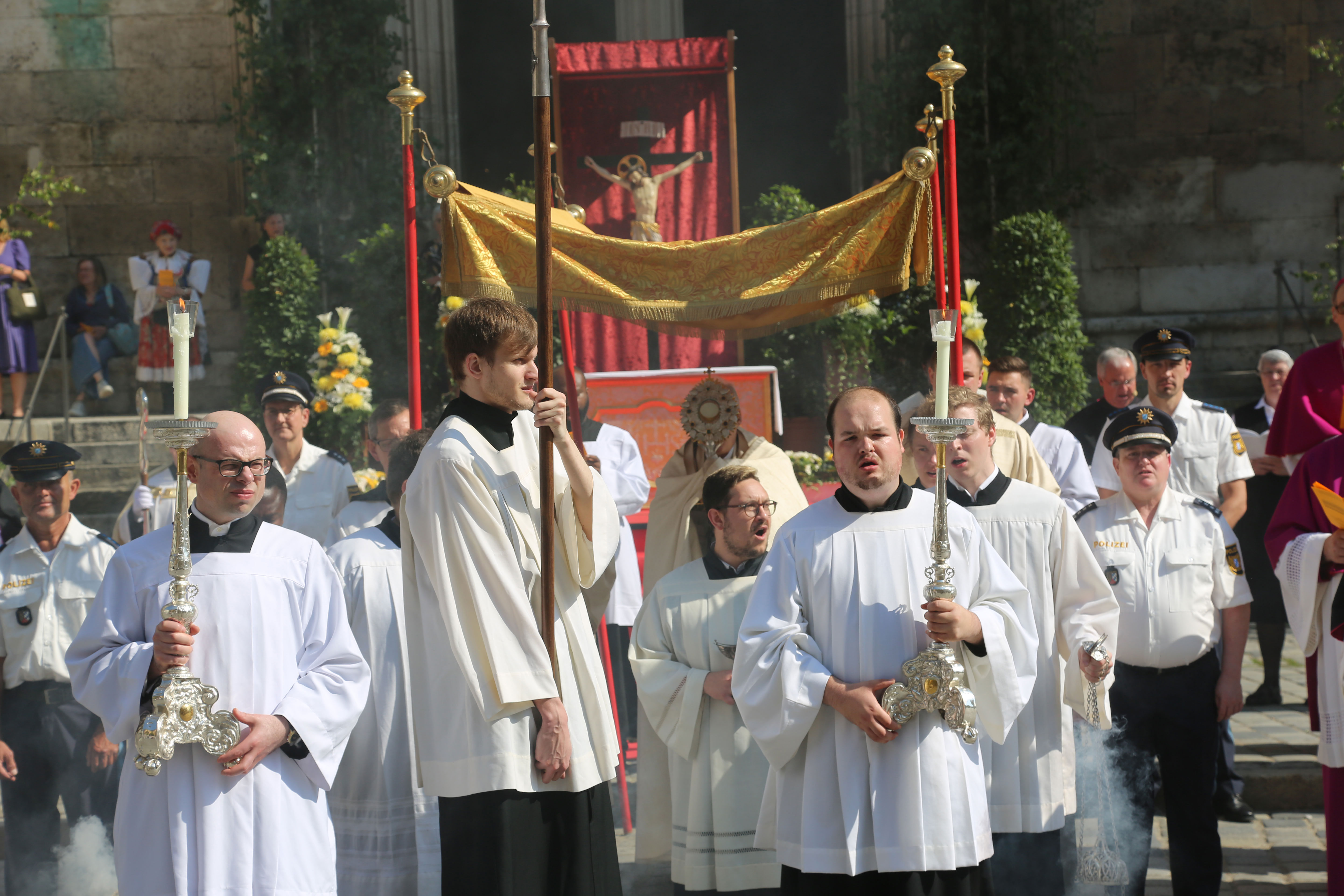 An diesem Donnerstagvormittag wurde vielfach deutlich wie die Kirche in der Gesellschaft präsent ist. Dies zeigte sich mit den Vertretern des öffentlichen Lebens, mit Regensburgs Oberbürgermeisterin Gertrud Maltz-Schwarzfischer, mit dem Bundestagsabgeordneten Peter Aumer MdB und vielen weiteren Vertretern des öffentlichen Lebens. Auch die Teilnahme politischer Vertreter unterschiedlicher Parteien sowie das Flankieren des Baldachins durch Beamtinnen und Beamte der Polizei ließen deutlich werden, dass die Kirche ein Teil der Gesellschaft ist und in diese hineinwirkt.