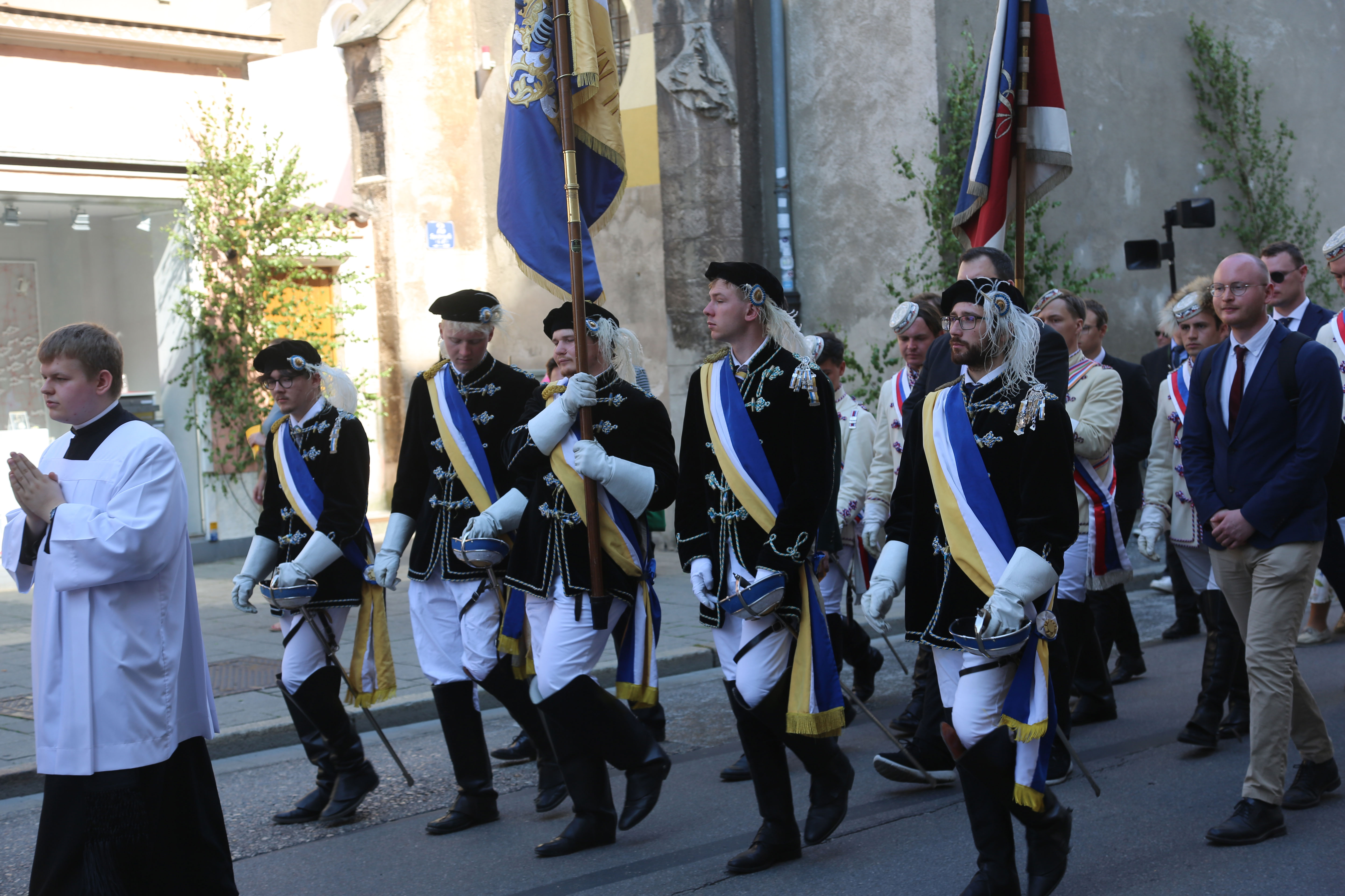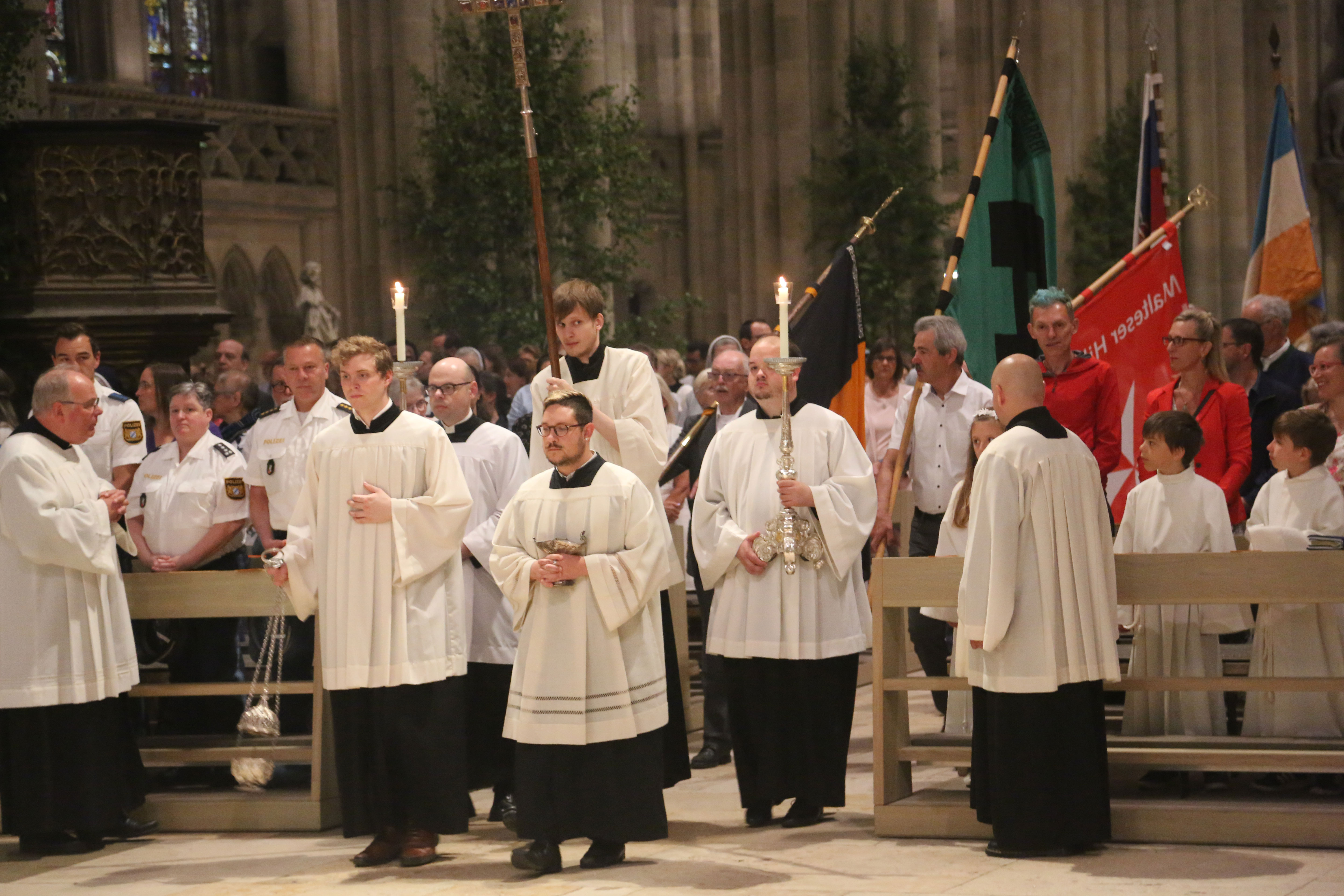 „Ich freue mich über den Fahnenwald, der heute an der Prozession teilnimmt“, so formulierte es Bischof Rudolf mit Blick auf die zahlreichen Vertreter katholischer Verbände während der Messe und der Prozession: Da sah man die Marianische Frauencongregation und die Hospitalité Notre-Dame de Lourdes, den Malteser Hilfsdienst und die Caritas sowie die Katholische Arbeiterbewegung und das Kolpingwerk. Auch wieder mit dabei waren die Vertreter der drei Katholischen Studentenverbindungen Agilolfia, Rupertia und Pontana. Die Familiaren des Deutschen Ordens mit ihren schwarzen Mänteln und die Damen und Ritter des Ordens vom Heiligen Grab zu Jerusalem bereicherten nicht nur optisch das Bild, sondern auch mit ihrem Einsatz für den Glauben. Wenngleich nicht mit einer Fahne oder einem Banner vertreten, waren viele Gläubige mit dabei, die sich in ihren Pfarreien für den Glauben einsetzen.