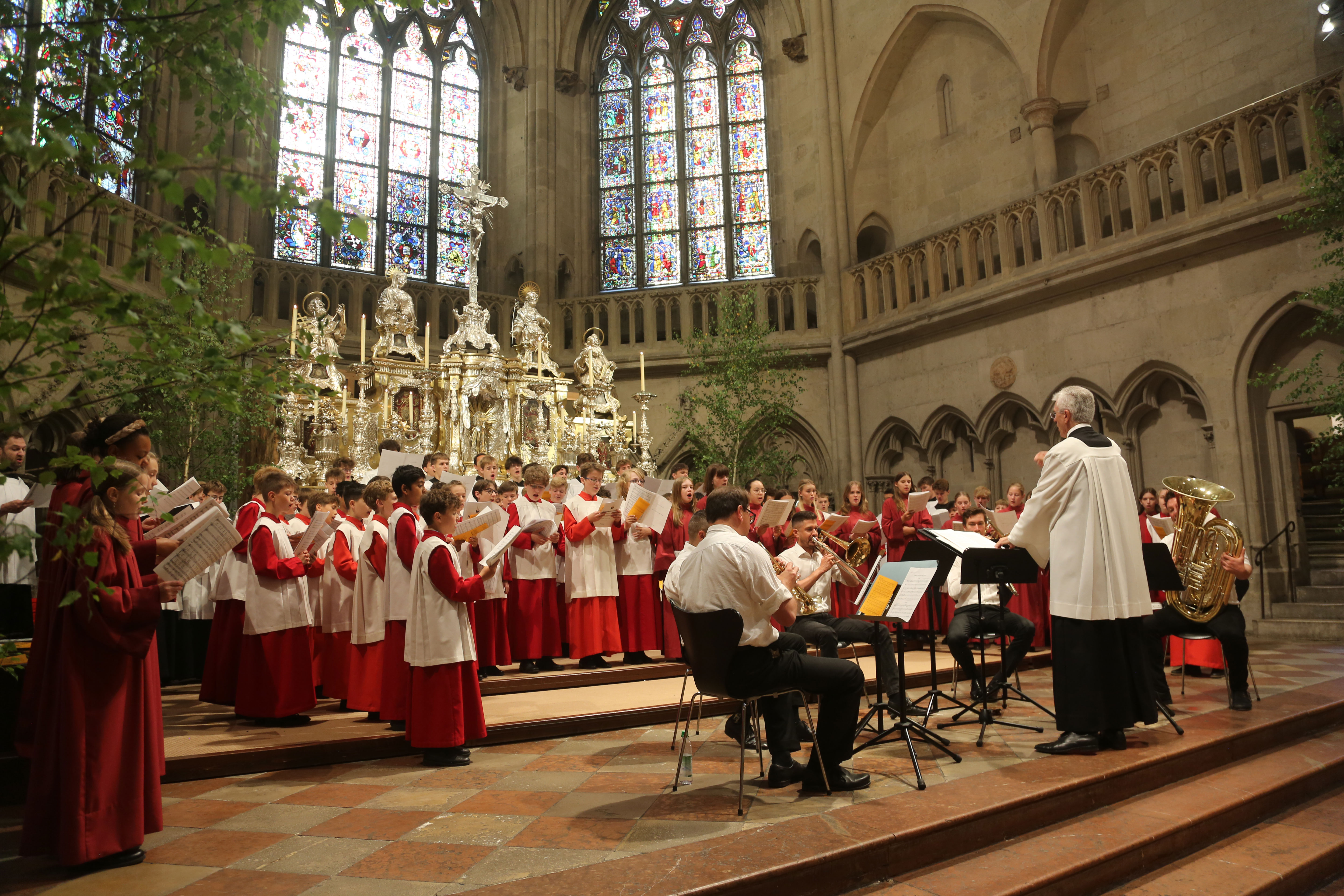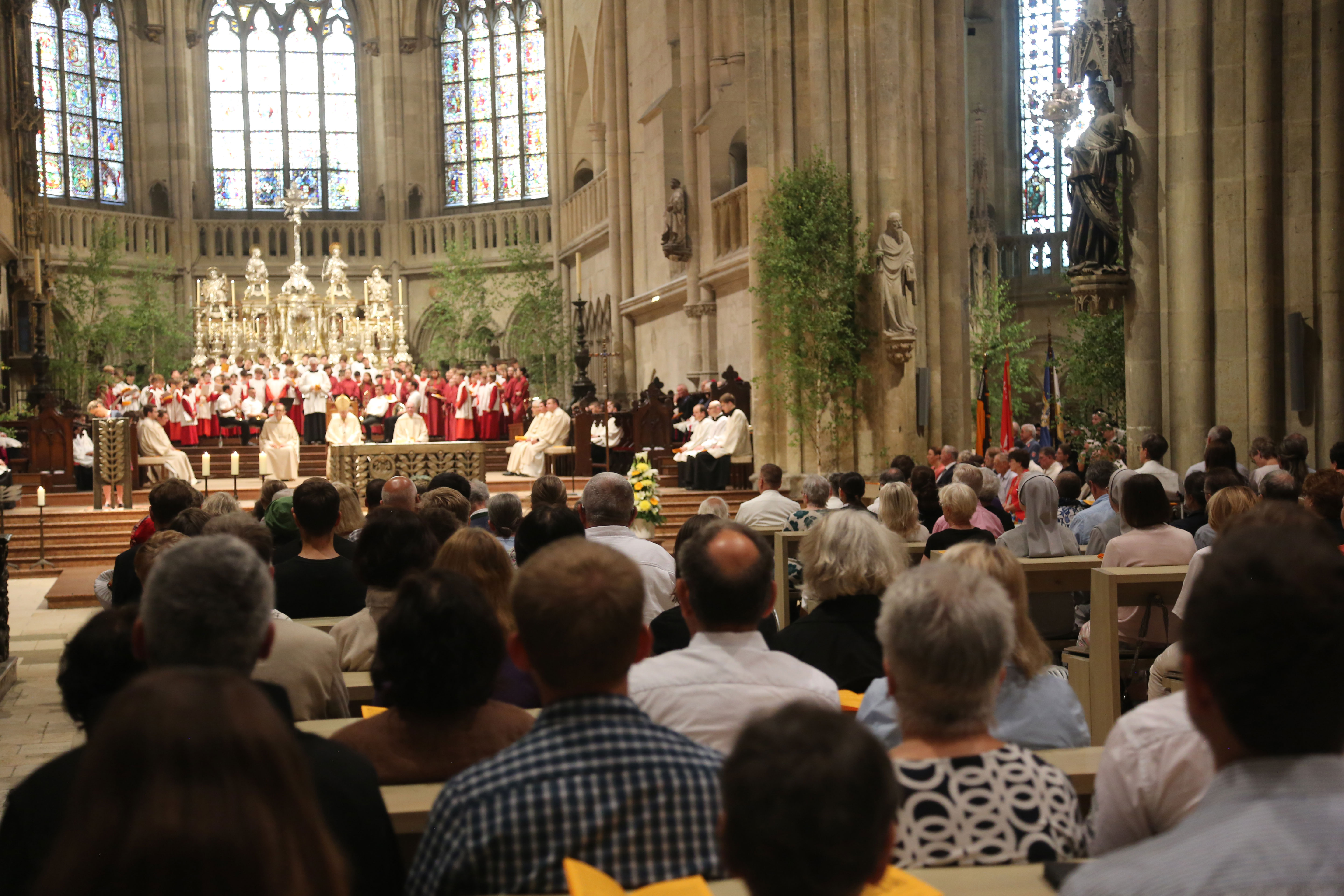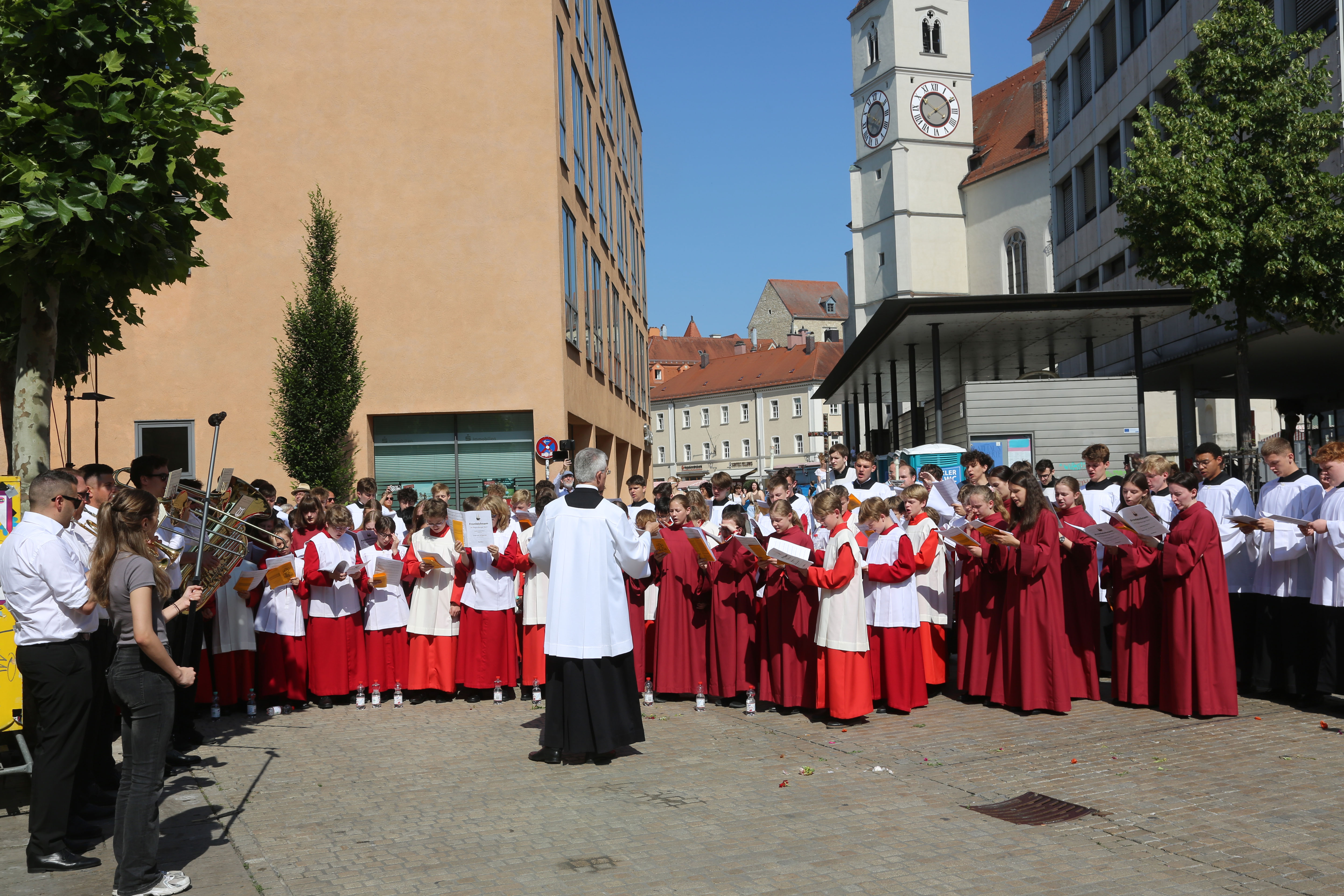 Dass Regensburg alt ist und neu zugleich konnte man auch mit Blick auf die Kirche an diesem Fronleichnamsfest wieder erleben. Da waren Prozessionsteilnehmer, die viele Jahre schon im katholischen Glauben zu Hause sind. Da waren auch die Kommunionkinder und Firmlinge, die eher noch am Anfang ihres Glaubensweges stehen. Da waren die jungen Stimmen der Domspatzen und der Mädchenkantorei, die gemeinsam unter der Leitung von Domkapellmeister Christian Heiß das Gebet der Gläubigen im Dom und auf dem Prozessionsweg multiplizierten. Unter den Teilnehmern des Priesterseminares St. Wolfgang waren junge Männer kurz nach dem Abitur, aber auch berufserfahrene Seminaristen, die sich alle auf den Weg zum Priestertum machen.