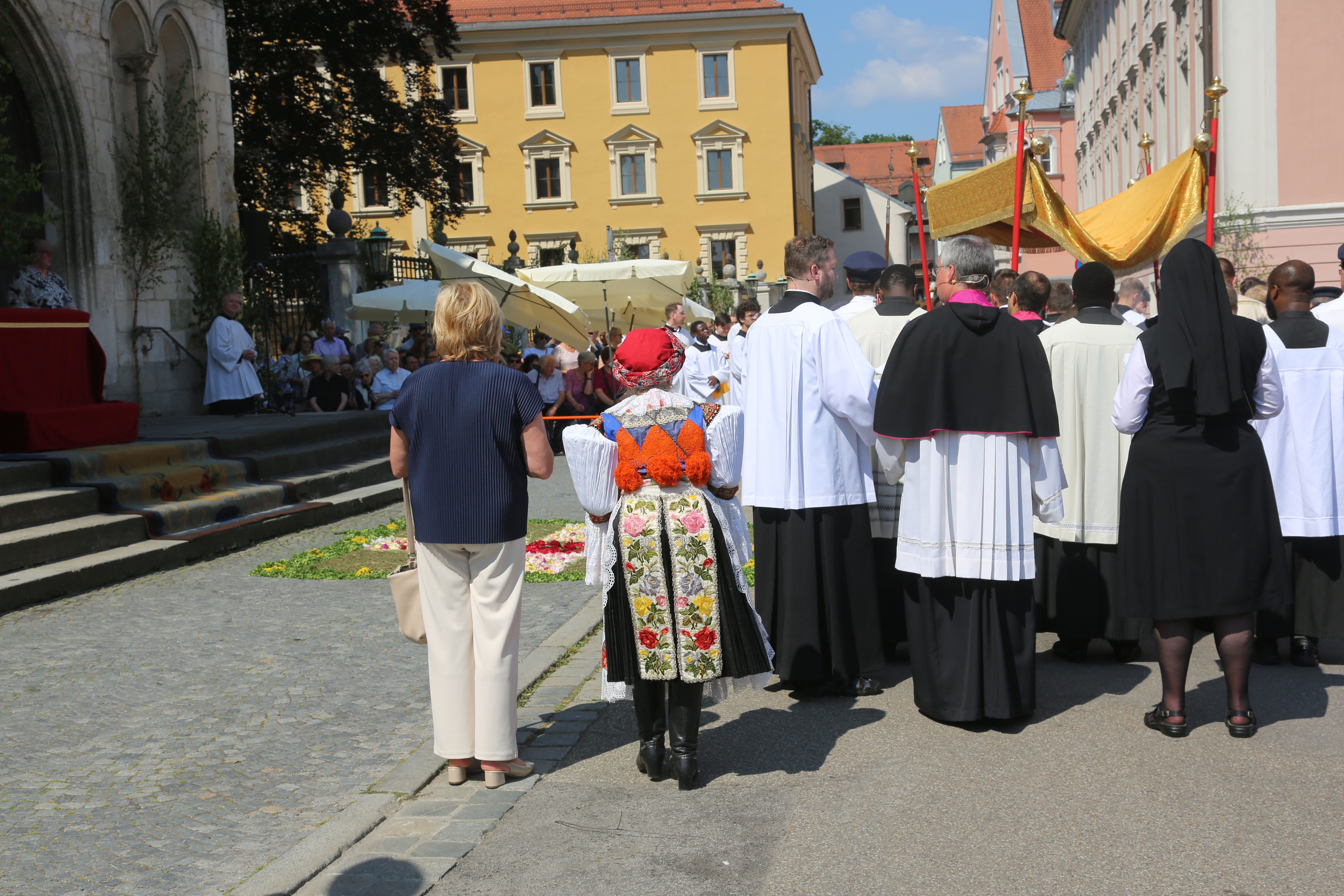 Der oft zitierte Satz von Bischof Rudolf bewahrheitete sich auch bei der diesjährigen Fronleichnamsprozession wieder. Das waren die afrikanischen Seminaristen, großen teils aus dem Orden der Mariannhiller Missionare, die mit der Gemeinschaft des Priesterseminares St. Wolfgang teilnahmen. Eine große Gruppe von südkoreanischen Katholiken, die Regensburg besuchten, nahmen auch an der Prozession teil. Und unter der farbenfrohen Beterschaft fiel eine Frau aus der mährischen Slowakei mit ihrer äußerst farbenfrohen Tracht auf.