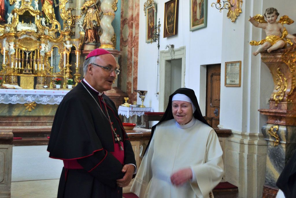 "Singet froh, wir haben Grund zum Danken", so stimmte das Vocalensemble Cantico in der Dominikanerinnenkirche Hl. Kreuz im Regensburger Stadtwesten zu Beginn des Pontifikalamtes mit Bischof Rudolf Voderholzer an. Grund zum Danken gab es gleich mehrfach an diesem Sonntagmorgen. Im weltweiten Jubiläumsjahr zu 800 Jahren Dominikanerorden feierte der Bischof mit den Schwestern des fast 800 Jahre alten Klosters, den Mitgliedern der Dominikanischen Laiengemeinschaft und vielen weiteren Gläubigen den Gedenktag des hl. Dominikus, der im Heiligenkalender am 8. August verzeichnet ist. Für Bischof Rudolf war dies nicht der erste Besuch in der Klosterkirche Hl. Kreuz. Bereits wenige Tage nach seiner Bischofsweihe 2013 hatte er mit den Schwestern dort den Gedenktag des hl. Thomas von Aquin gefeiert.