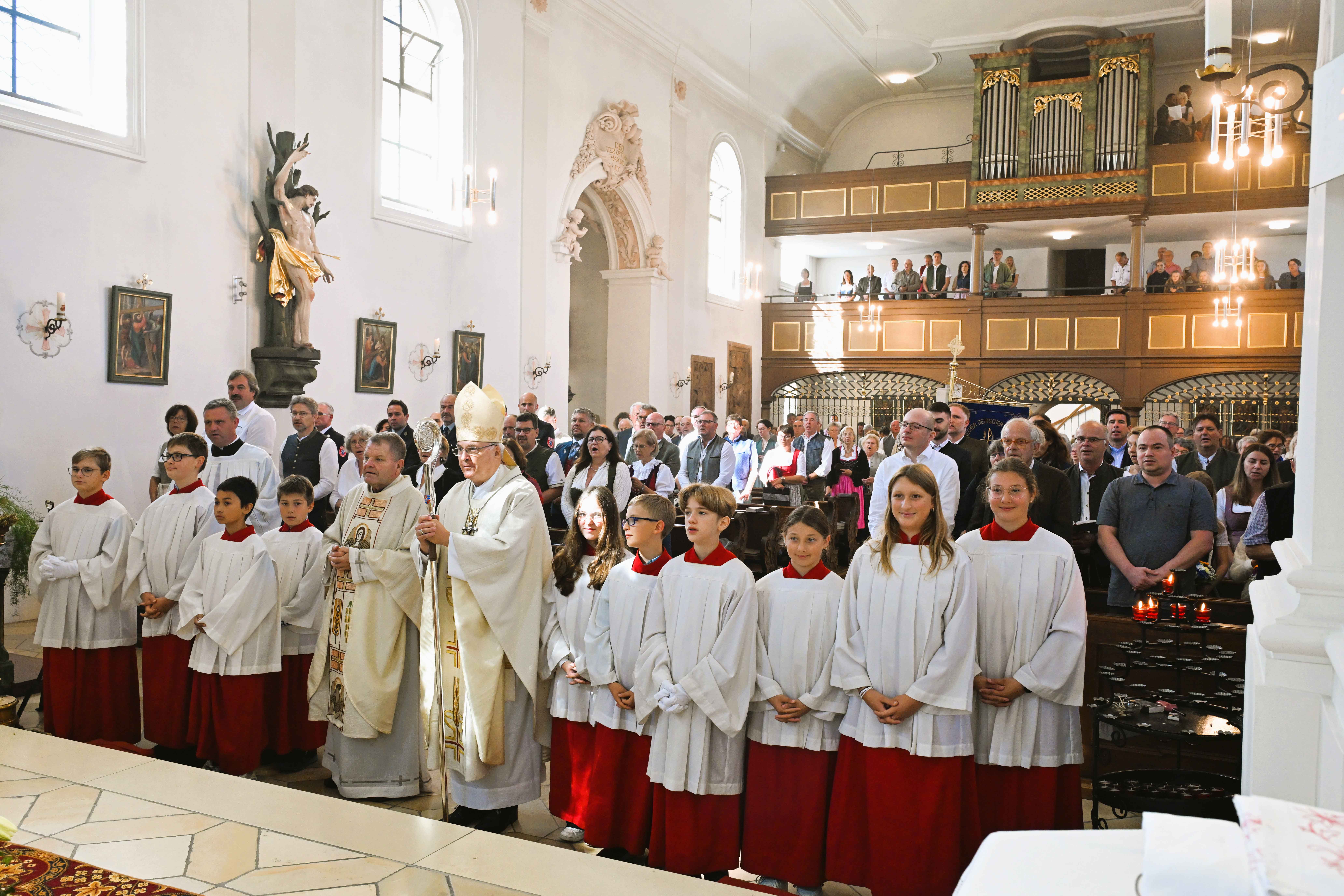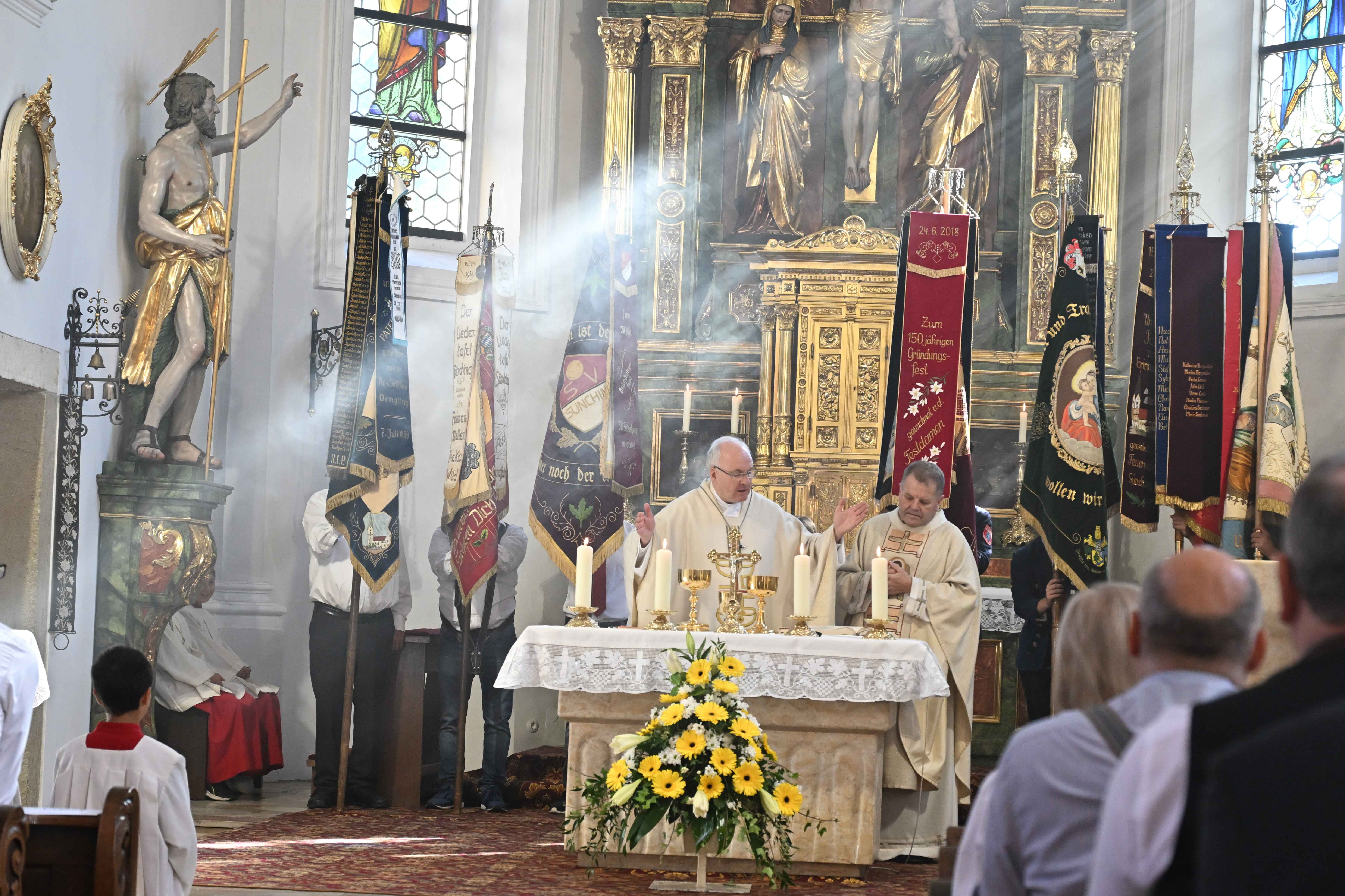 Bereits um 9 Uhr eröffnete Bischof Rudolf gemeinsam mit Pfarrer Erwin Gietl den Festgottesdienst in der Pfarrkirche St. Johannes der Täufer und St. Johannes Evangelist. Zuvor hieß Bürgermeister Robert Spindler Bischof Rudolf gemeinsam mit dem Gemeinderat, der Kirchenverwaltung, dem Pfarrgemeinderat sowie den Blumenkindern Lotta Handl und Hannah Lex willkommen. Acht Fahnen der örtlichen Vereine schmückten den Altarraum beim feierlichen Einzug.