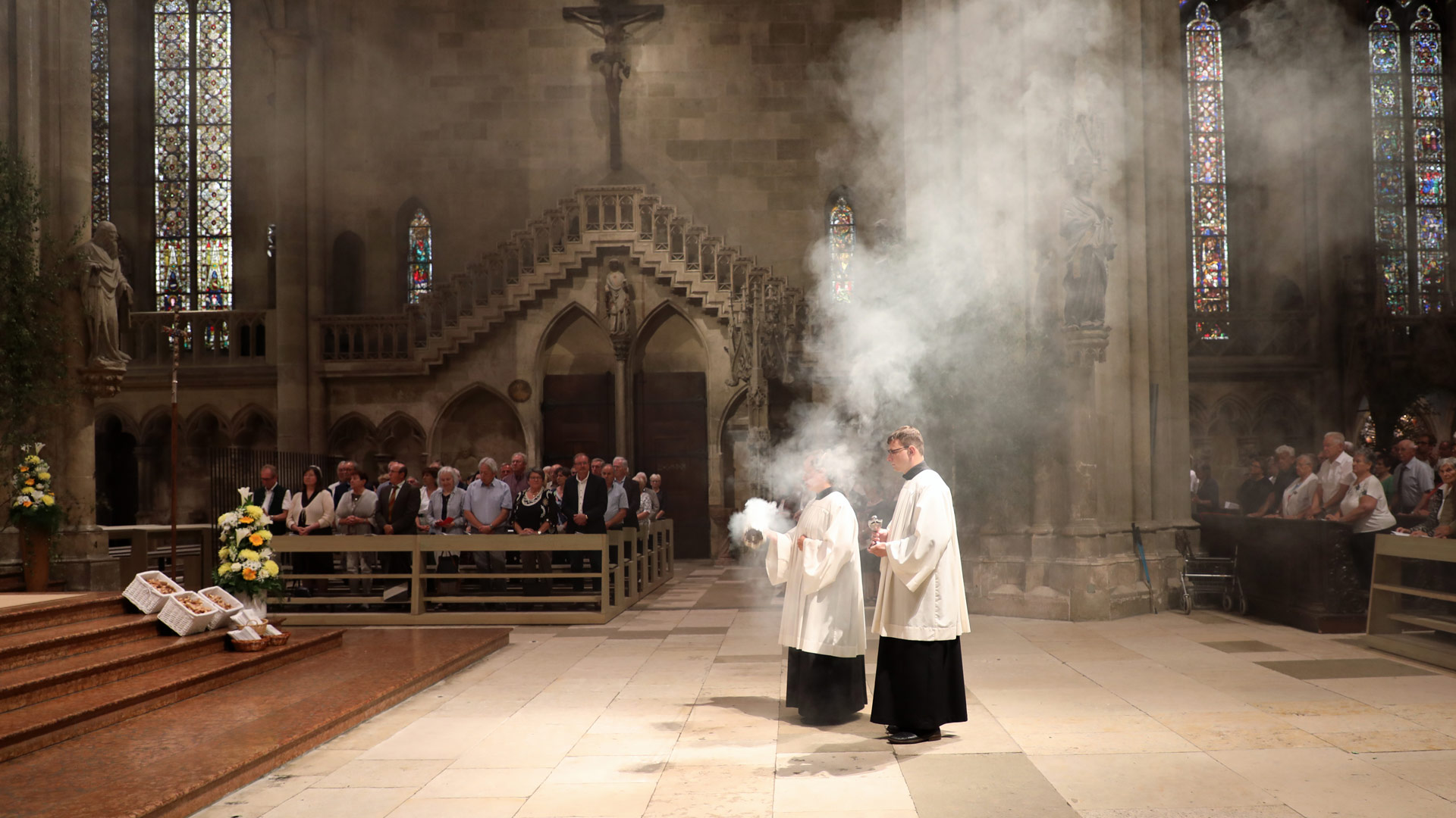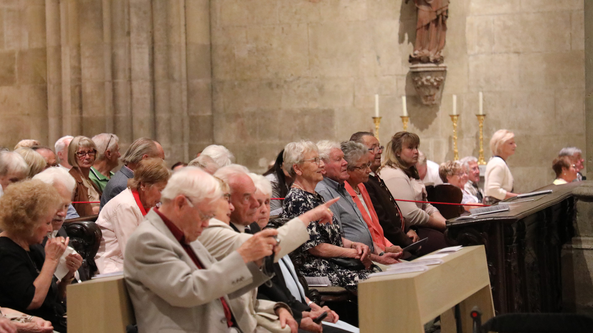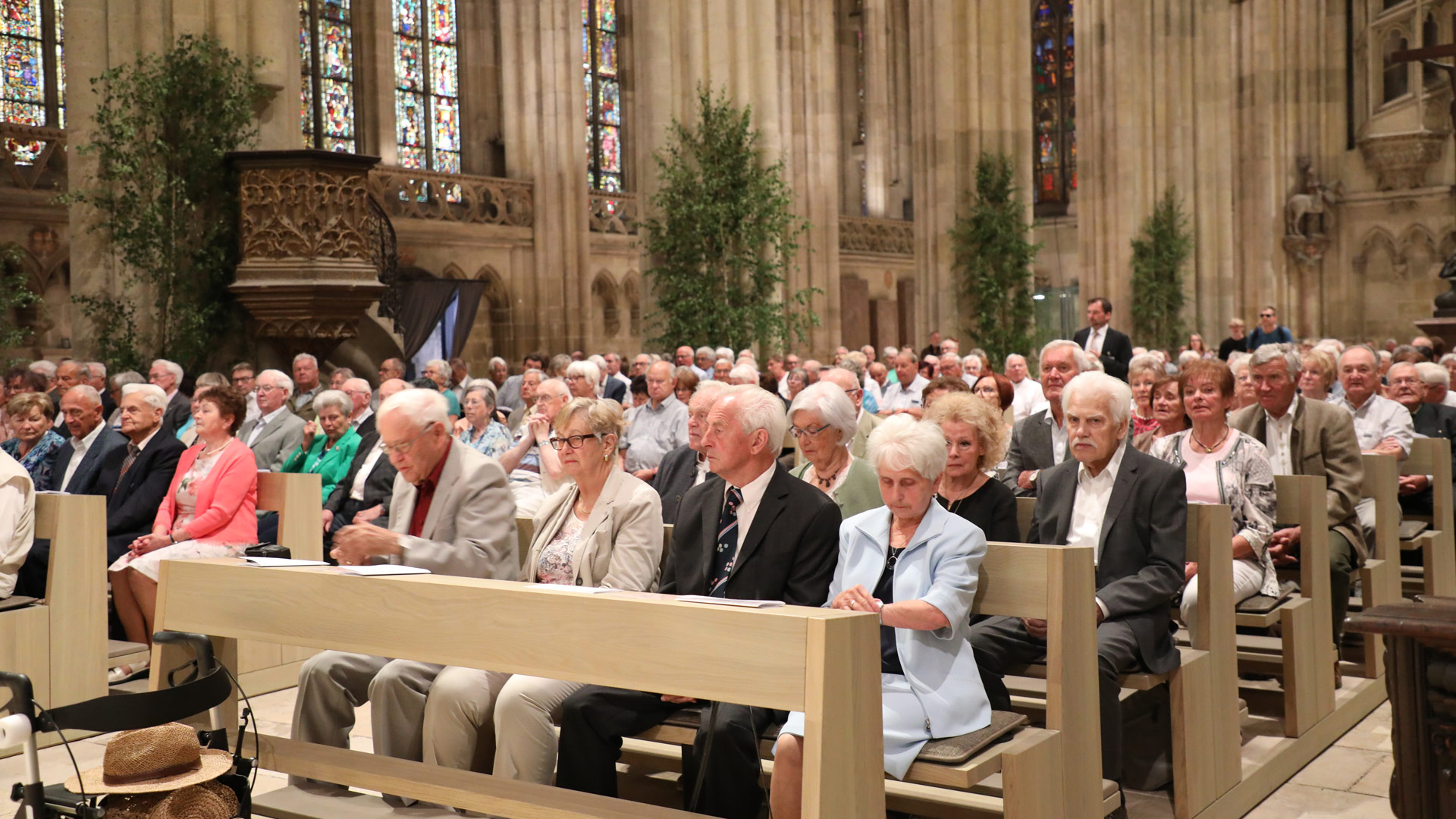 Volle Kirchenbänke im Regensburger Dom: Die 236 Ehepaare und einige Angehörige sind bei strahlendem Sommerwetter aus dem ganzen Bistum zusammengekommen. Die Ehejubilare haben vor 25, 40, 50, 55, 60 und mehr Jahren den Bund der Ehe geschlossen und feiern in diesem Jahr ihren gemeinsamen Lebensweg. 100 Paare blicken dabei auf ihr 50-Jähriges Jubiläum zurück, sieben Paare feierten gar mehr als 60 gemeinsame Jahre. Im Regensburger Dom saßen in den vordersten Bänken die Ehepaare, die am längsten verheiratet sind. Musikalisch gestaltete ein Ensemble ehemaliger Domspatzen unter Leitung des ehemaligen Domkapellmeisters Roland Büchner die Feierlichkeiten. Die Orgel spielte Domorganist Prof. Franz-Josef Stoiber.