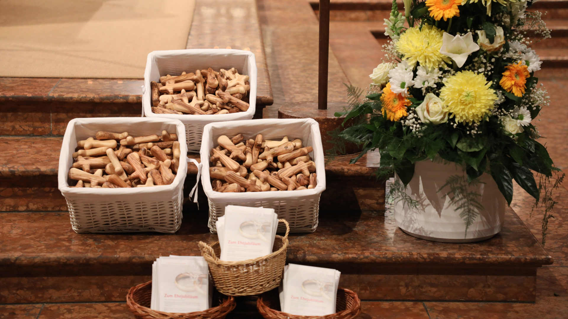 Der festliche Gottesdienst endete mit dem gemeinsamen Segen für alle Ehejubilare – verbunden mit dem Wunsch auf noch viele gemeinsame Jahre im Licht des Glaubens. Nach dem Pontifikalsegen im Dom wurden drei Holzbänke im Altarraum aufgestellt. Die Ehejubilare gingen der Reihe nach vorne und bekamen von den Ministranten ein handgroßes Olivenholzkreuz gereicht. Die Kreuze wurden von Christen um Betlehem herum angefertigt und drücken handgreiflich aus, dass Jesus der dritte im Bund der Ehe sei. Die Ehejubilare knieten sich auf die Holzbänke, umfassten gemeinsam das Kreuz und empfingen von Bischof Rudolf oder den Weihbischöfen Graf und Pappenberger den Segen.