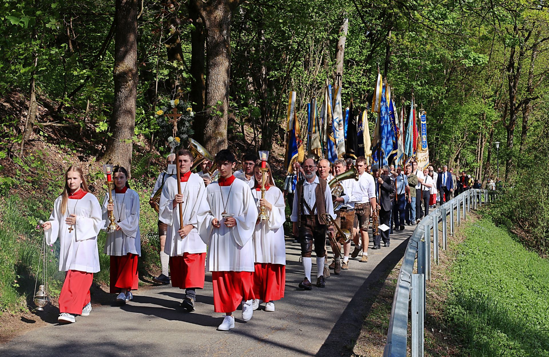 Die Feier begann mit einer beeindruckenden Prozession vom Feuerwehrhaus in Neuhaus hinauf zur Kapelle. Angeführt von den Ministranten, Geistlichen und Ehrengästen zogen etwa 30 Vereine und Abordnungen der Marianischen Männerkongregationen zum Marienheiligtum. Die örtliche Feuerwehr sorgte mit Getränkestationen für das leibliche Wohl, die Johanniter für das körperliche.