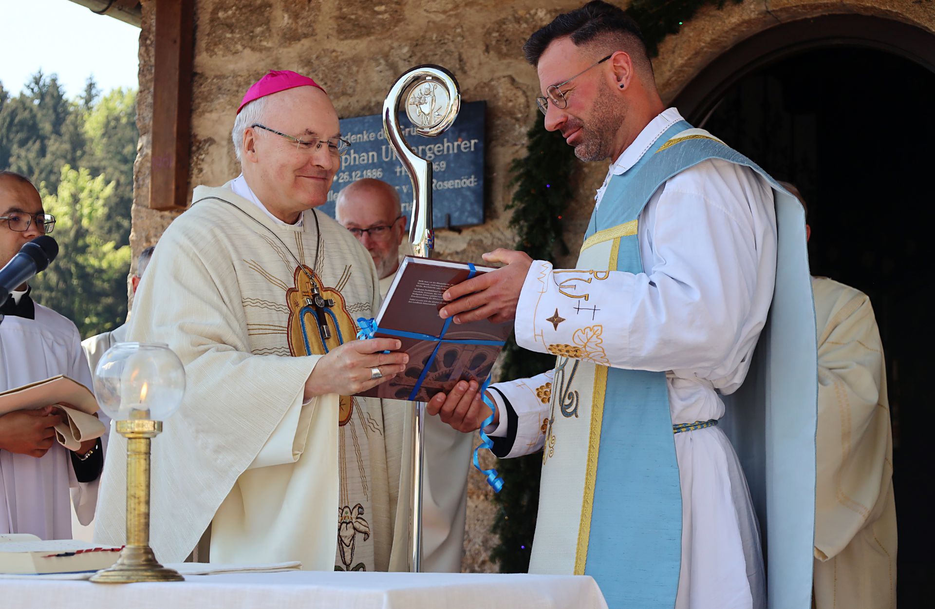 Der Festgottesdienst wurde von Bischof Voderholzer als Hauptzelebrant geleitet, unterstützt von zahlreichen Priestern und Diakonen. Darunter waren Pfarrer Sebastian Scherr, der Rodinger Pfarrer Josef Schmaderer i.R., Schorndorfs Ortspfarrer Martin Schöpf und viele weitere Geistliche. Ehrengäste wie die Bürgermeister Max Schmaderer (Schorndorf) und Christian Raab (Michelsneukirchen) sowie Vertreter des öffentlichen Lebens waren ebenfalls anwesend. Die Blasmusik Krottenthaler sorgte mit festlichen Klängen für eine würdige musikalische Gestaltung des Gottesdienstes.