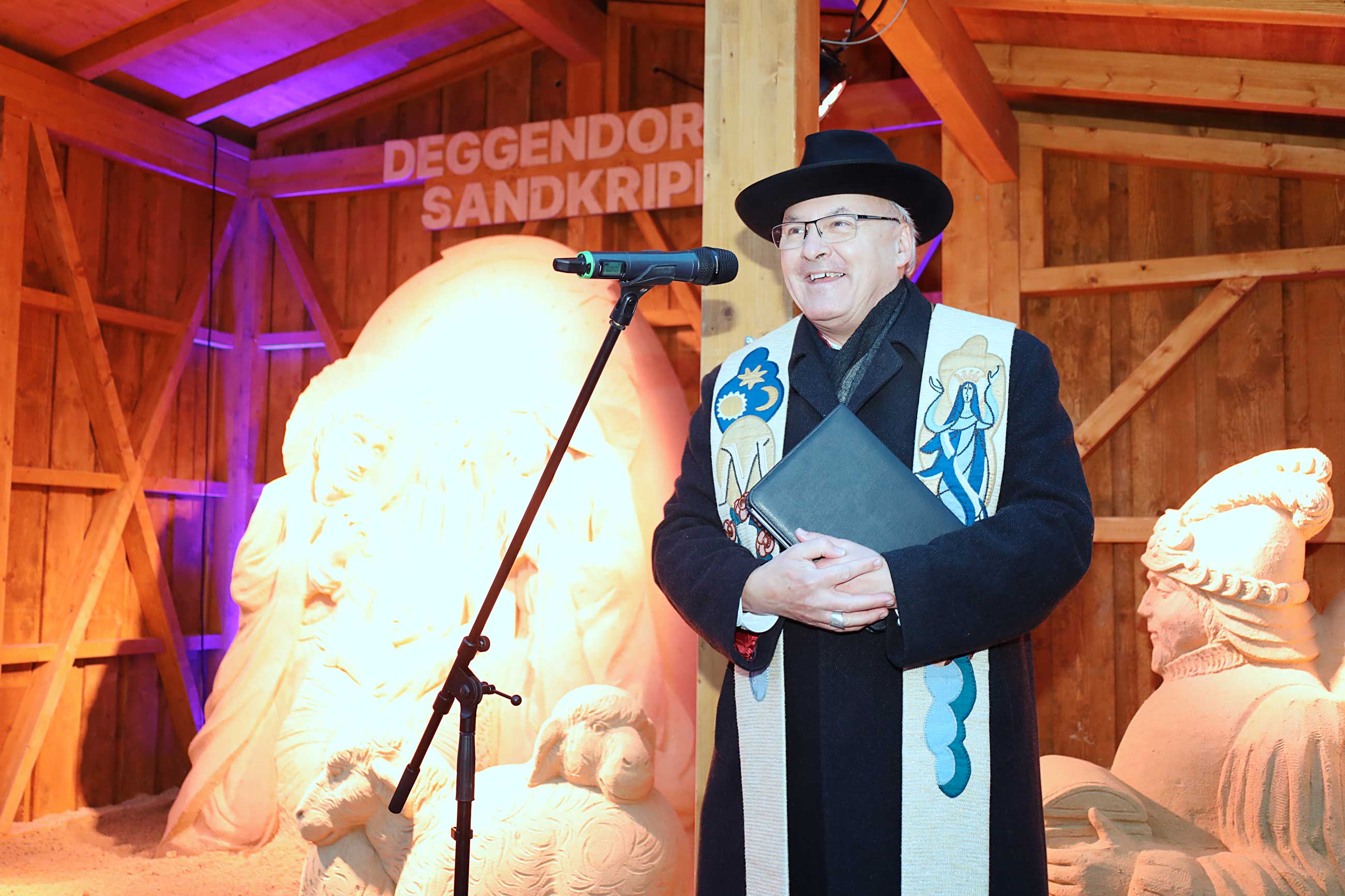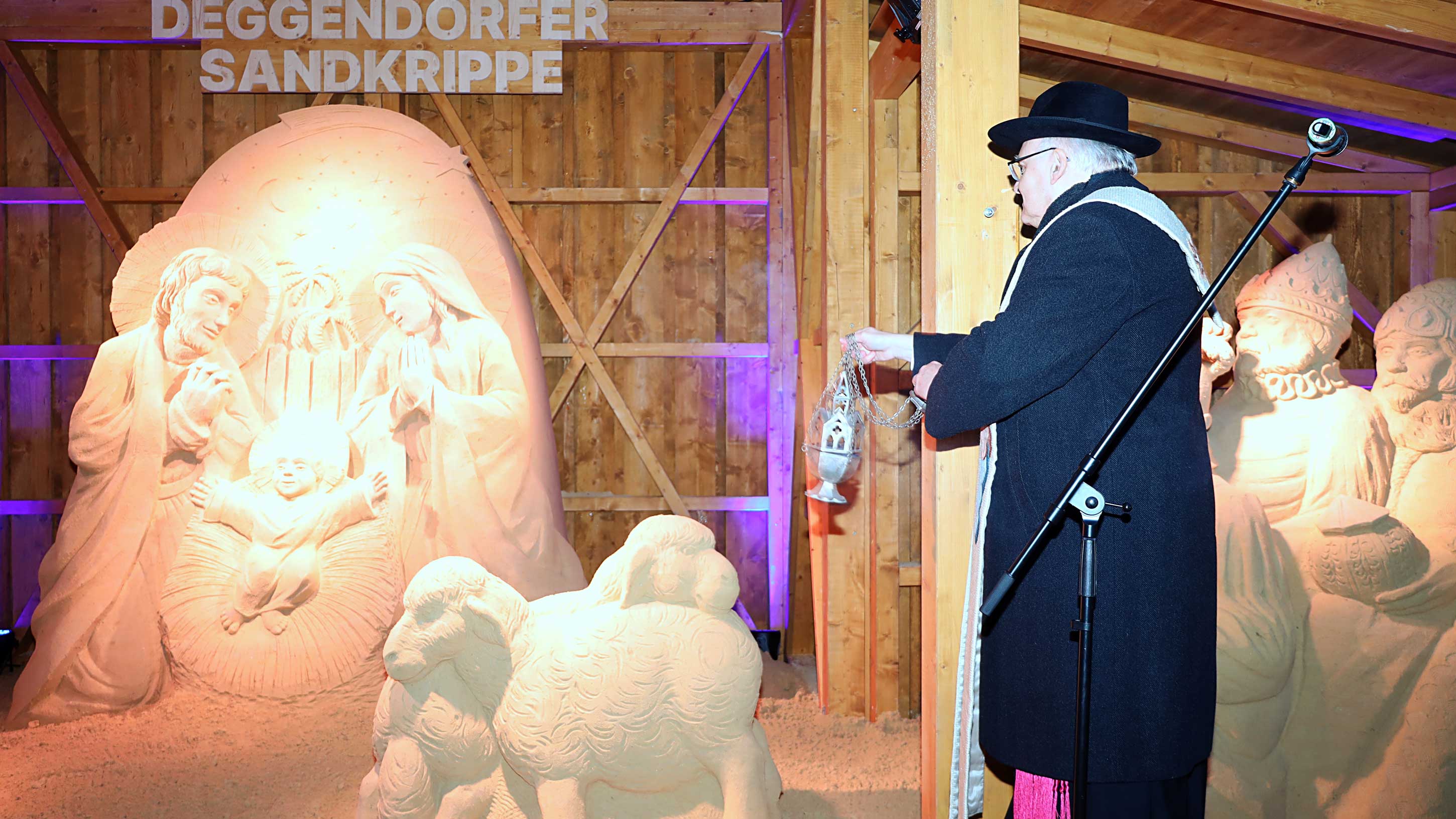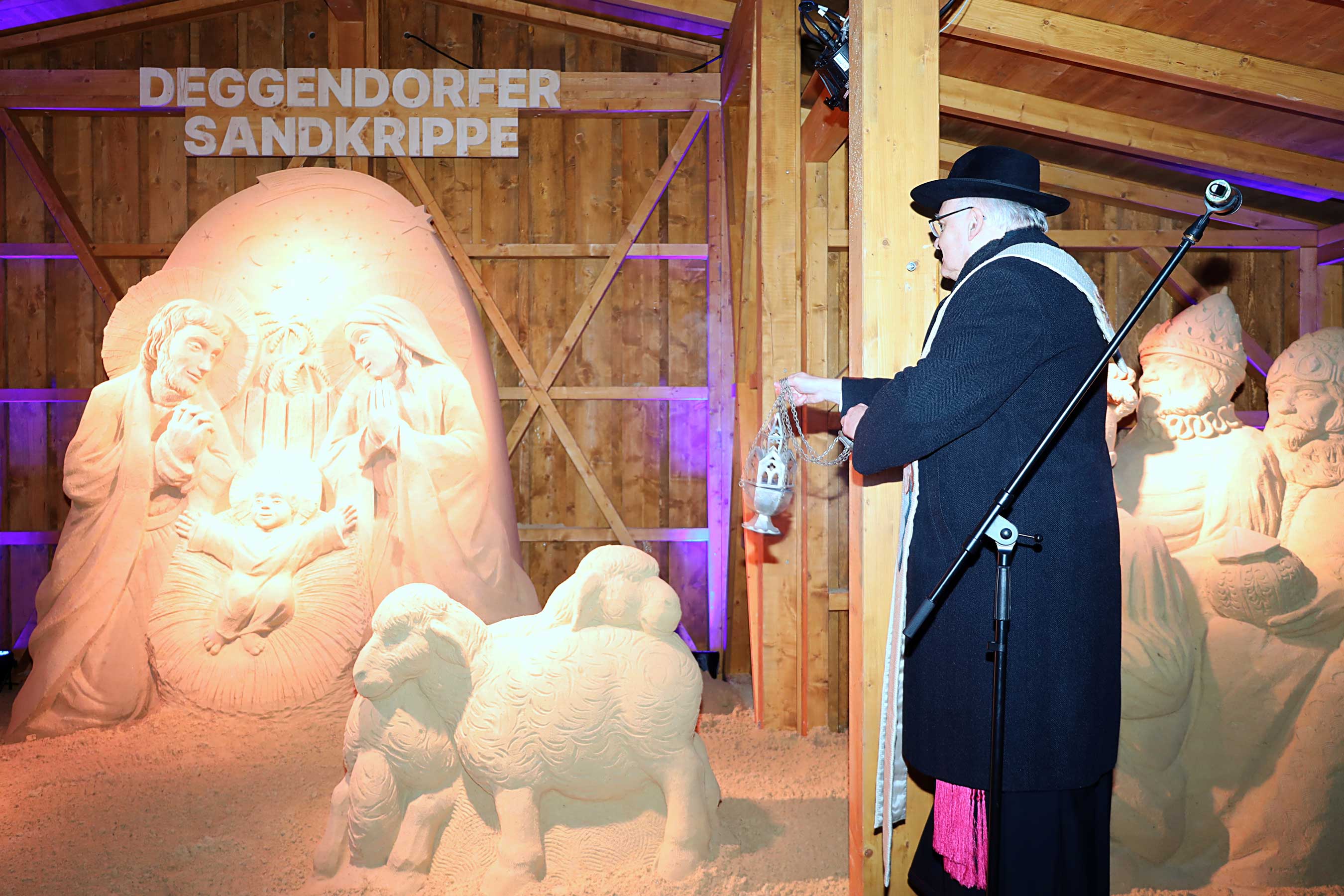 Als bekennender Krippenfreund war Diözesanbischof Dr. Rudolf Voderholzer am ersten Adventssonntag nach Deggendorf gereist. Er gratulierte der Stadt zur „wahrscheinlich größten Sandkrippe Deutschlands“. Fasziniert zeigte sich der Bischof von der handwerklichen Leistung. Er zog einen Vergleich zur klassischen Bildhauerei: Es sei wie beim Marmor, man müsse „nur das Überflüssige wegschlagen“, scherzte er anerkennend über die gestampften Sandblöcke, aus denen die Figuren herausgearbeitet wurden.