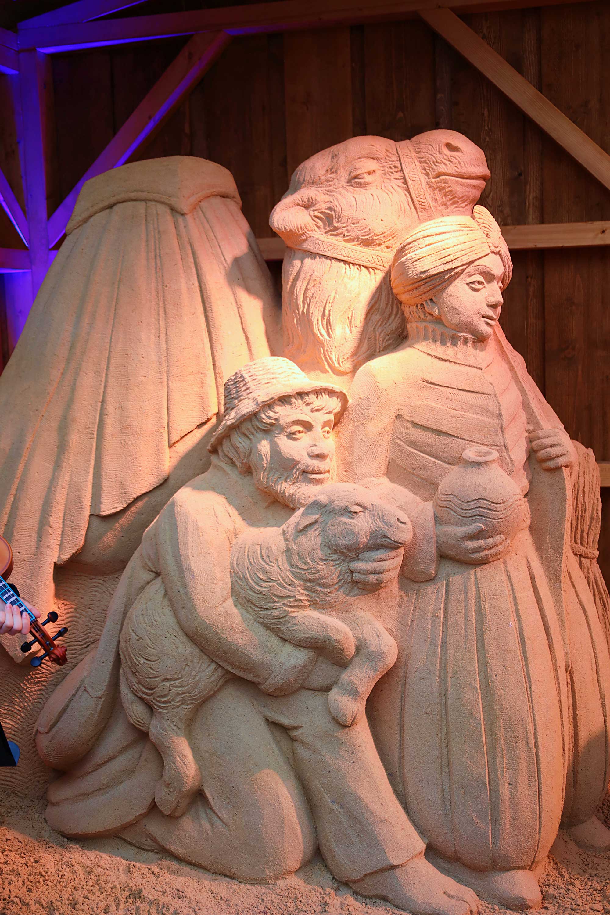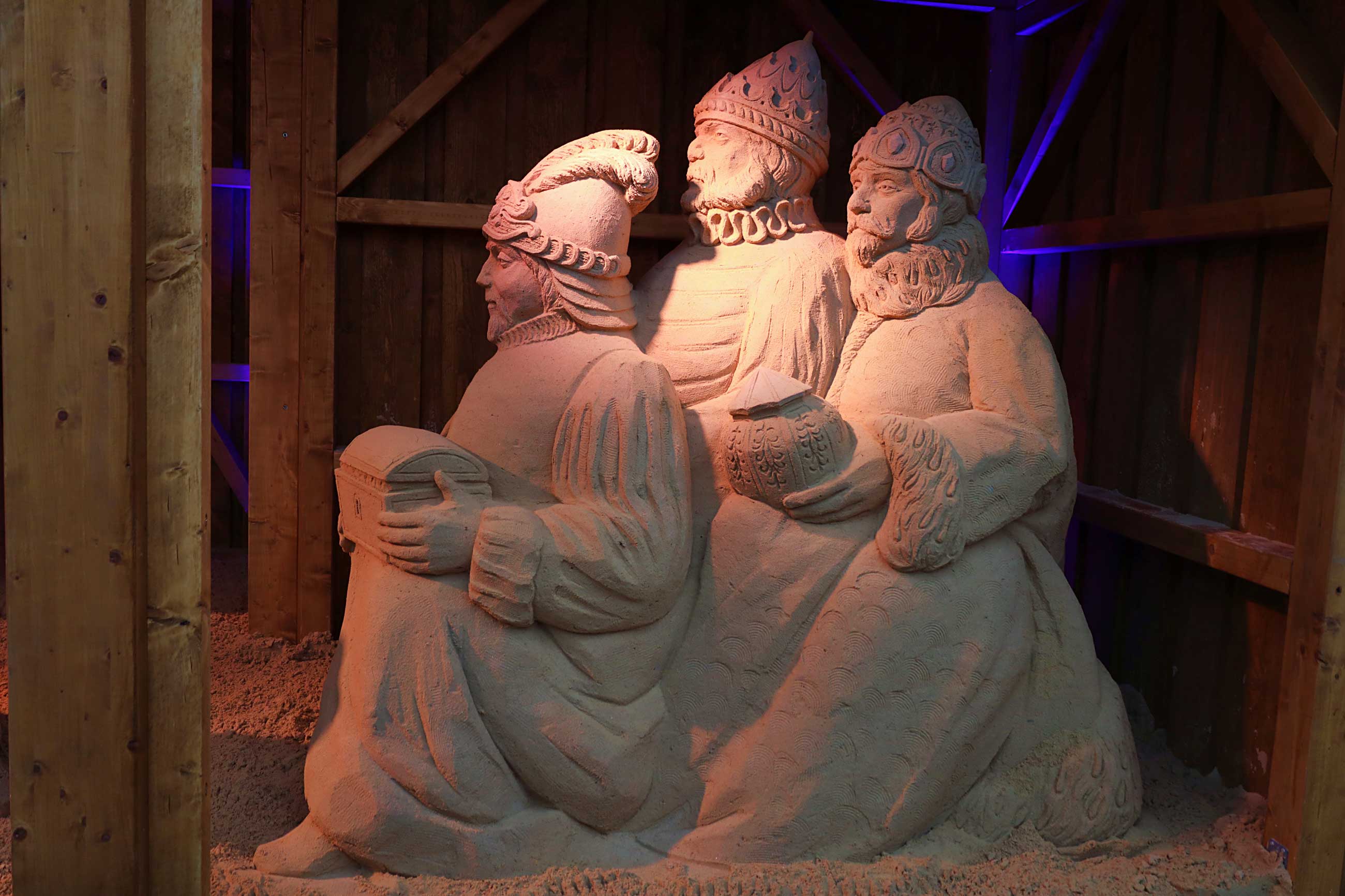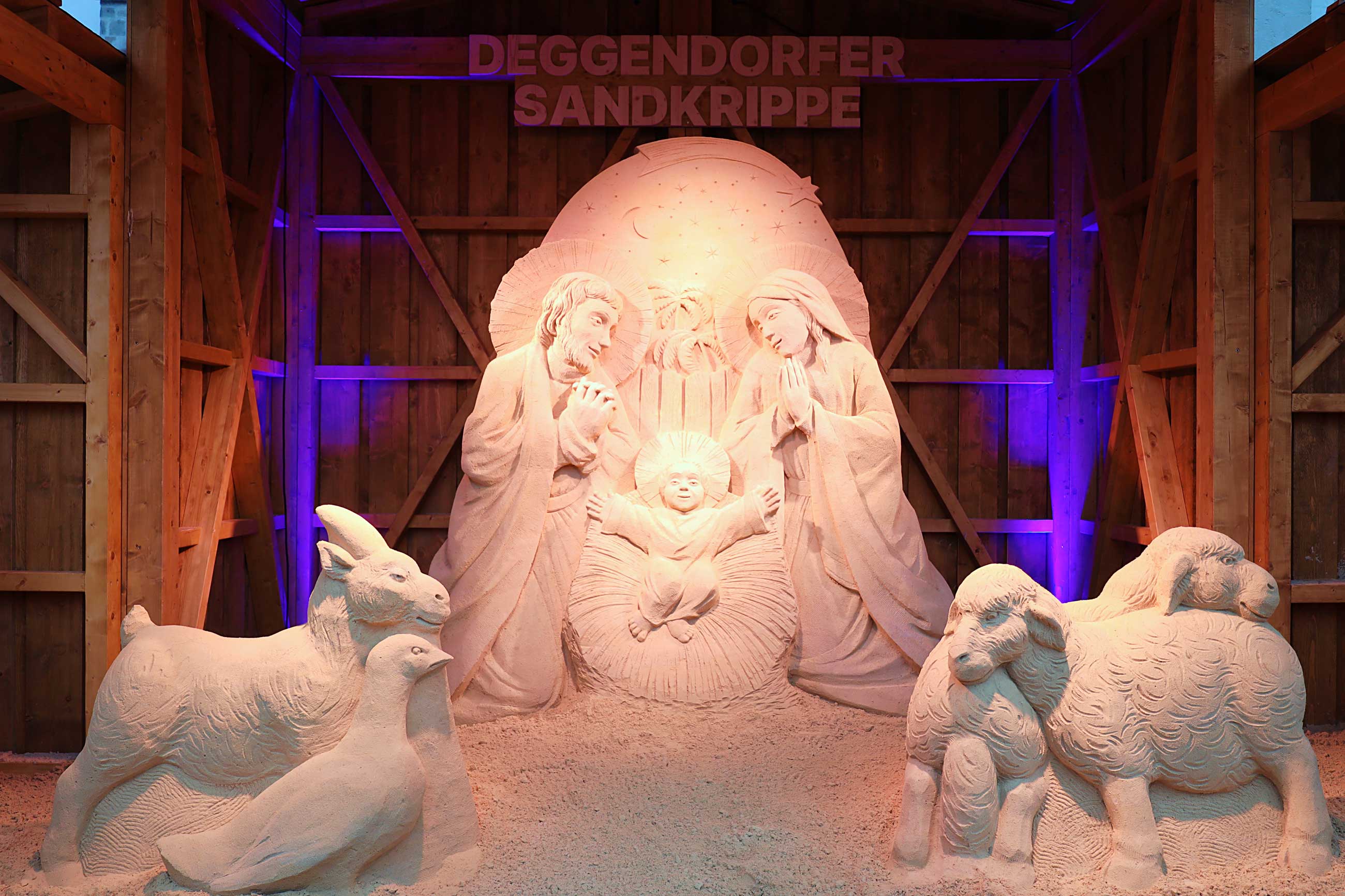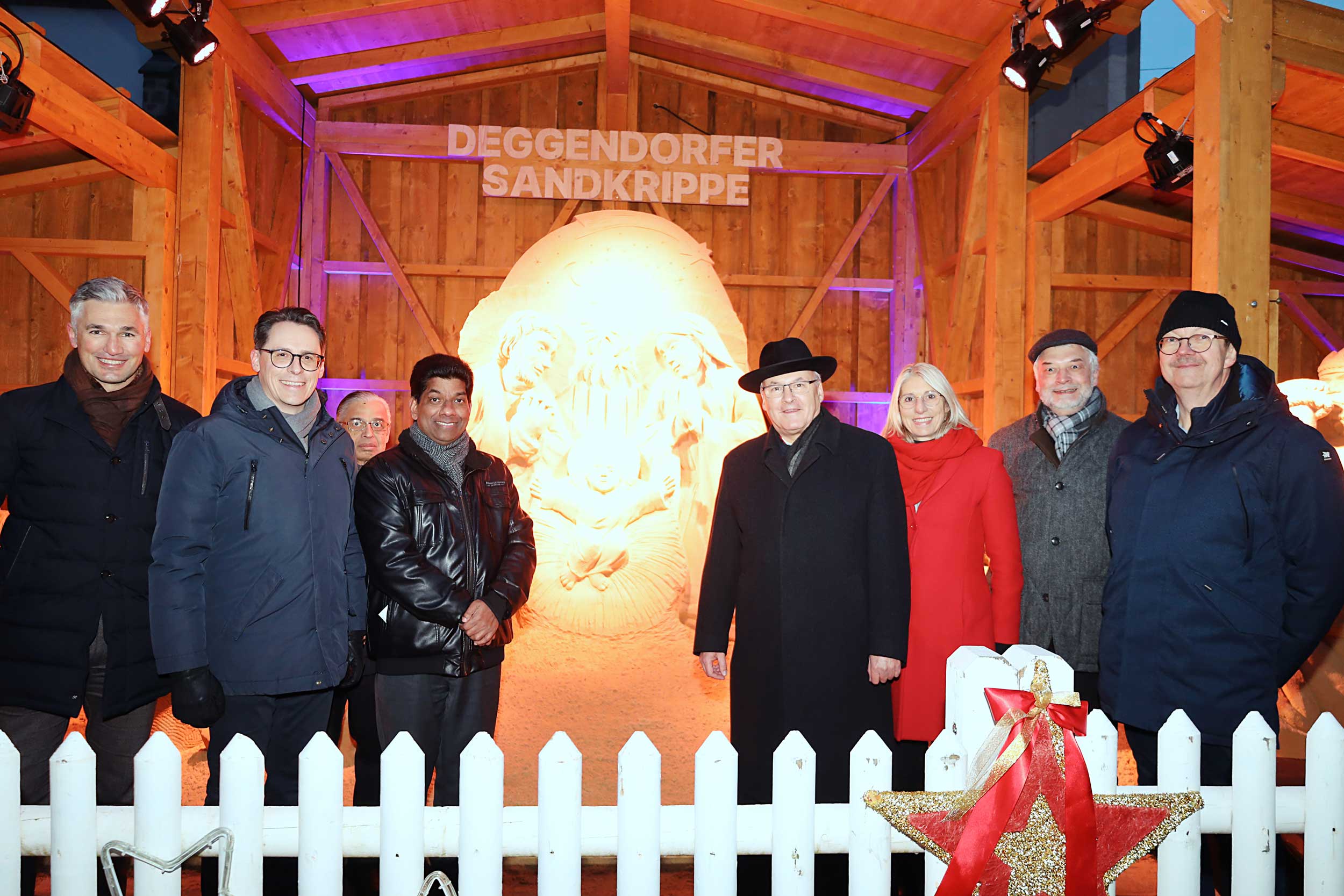 Als bekennender Krippenfreund war Diözesanbischof Dr. Rudolf Voderholzer am ersten Adventssonntag nach Deggendorf gereist. Er gratulierte der Stadt zur „wahrscheinlich größten Sandkrippe Deutschlands“. Fasziniert zeigte sich der Bischof von der handwerklichen Leistung. Er zog einen Vergleich zur klassischen Bildhauerei: Es sei wie beim Marmor, man müsse „nur das Überflüssige wegschlagen“, scherzte er anerkennend über die gestampften Sandblöcke, aus denen die Figuren herausgearbeitet wurden.