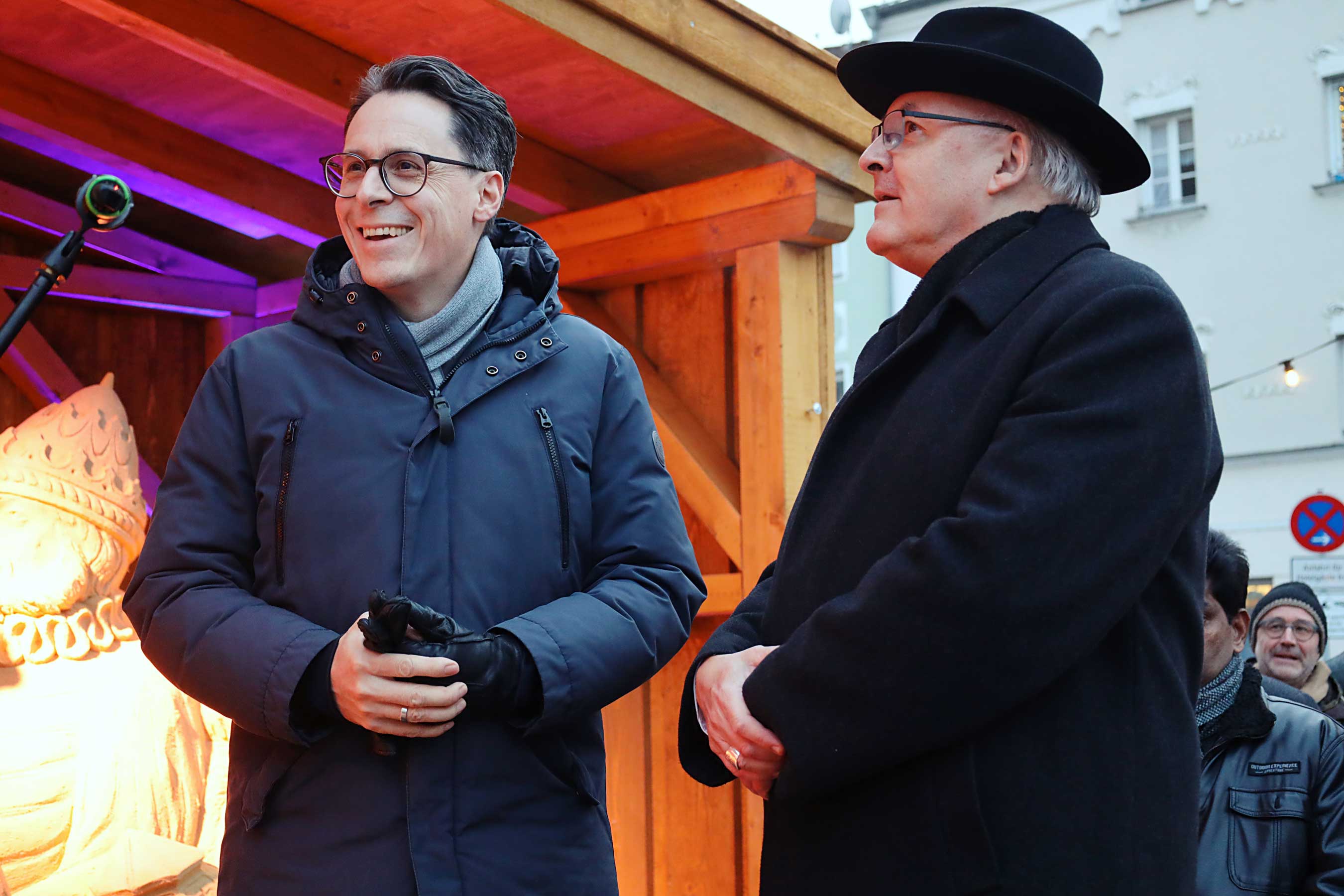 Oberbürgermeister Dr. Christian Moser eröffnete den Festakt und begrüßte die zahlreichen Ehrengäste. Er skizzierte die Entstehung der Krippe über die letzten drei Jahre – vom Mittelgebäude über den linken Flügel mit den Königen bis hin zur diesjährigen Vollendung. Das Stadtoberhaupt stellte klar, warum die Stadt diesen Aufwand betreibt. Man feiere die Adventszeit nicht „aus dem Kommerz heraus“, sondern „weil Jesus Christus geboren worden ist“.