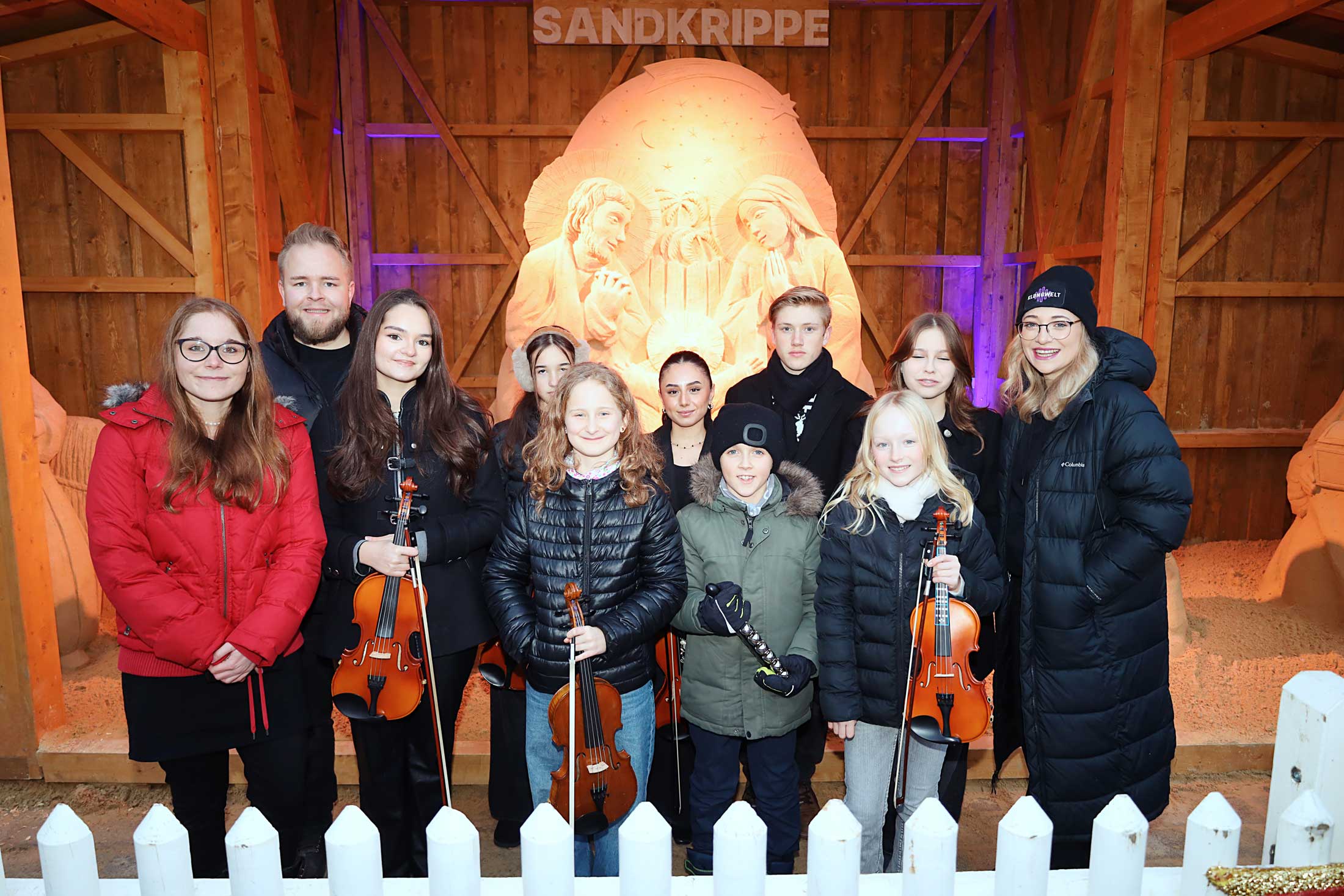 Bischof Rudolf lobte ausdrücklich die grenzüberschreitende Dimension des Werkes. Mit Blick auf den Prager Künstler Jiří Kašpar und die tschechischen Gäste sprach er anerkennend von einer „böhmischen Krippe auf bayerischem Boden“. Auch an die musikalische Tradition der Nachbarn erinnerte er : „Zu einer echten böhmischen Krippe gehören eigentlich immer Musikanten.“. Diese Rolle übernahmen an diesem Abend die jungen Talente der „Musikschule Klangwelt“ unter der Leitung von Laura Weichselgartner, die die Feier mit festlichen Weisen umrahmten. Den Höhepunkt der Feierstunde bildete die Segnung. So besprengte Bischof Voderholzer die Sandfiguren mit Weihwasser und inzensierte sie mit Weihrauch. Er bat darum, dass das Bild der Krippe vielen Menschen „die Augen öffnen möge für das Geheimnis der Weihnacht“. Die Sandkrippe am Luitpoldplatz bleibt nun bis zum Dreikönigstag ein leuchtendes Zeichen der Hoffnung inmitten der Deggendorfer Altstadt.