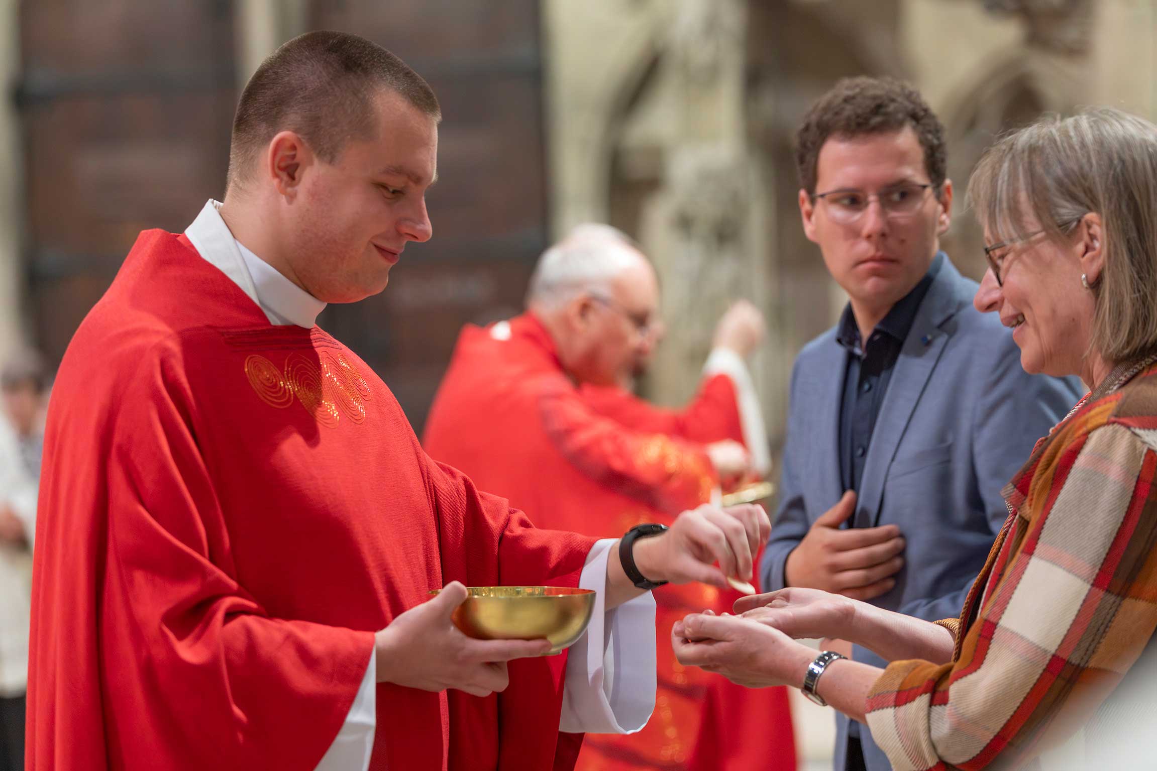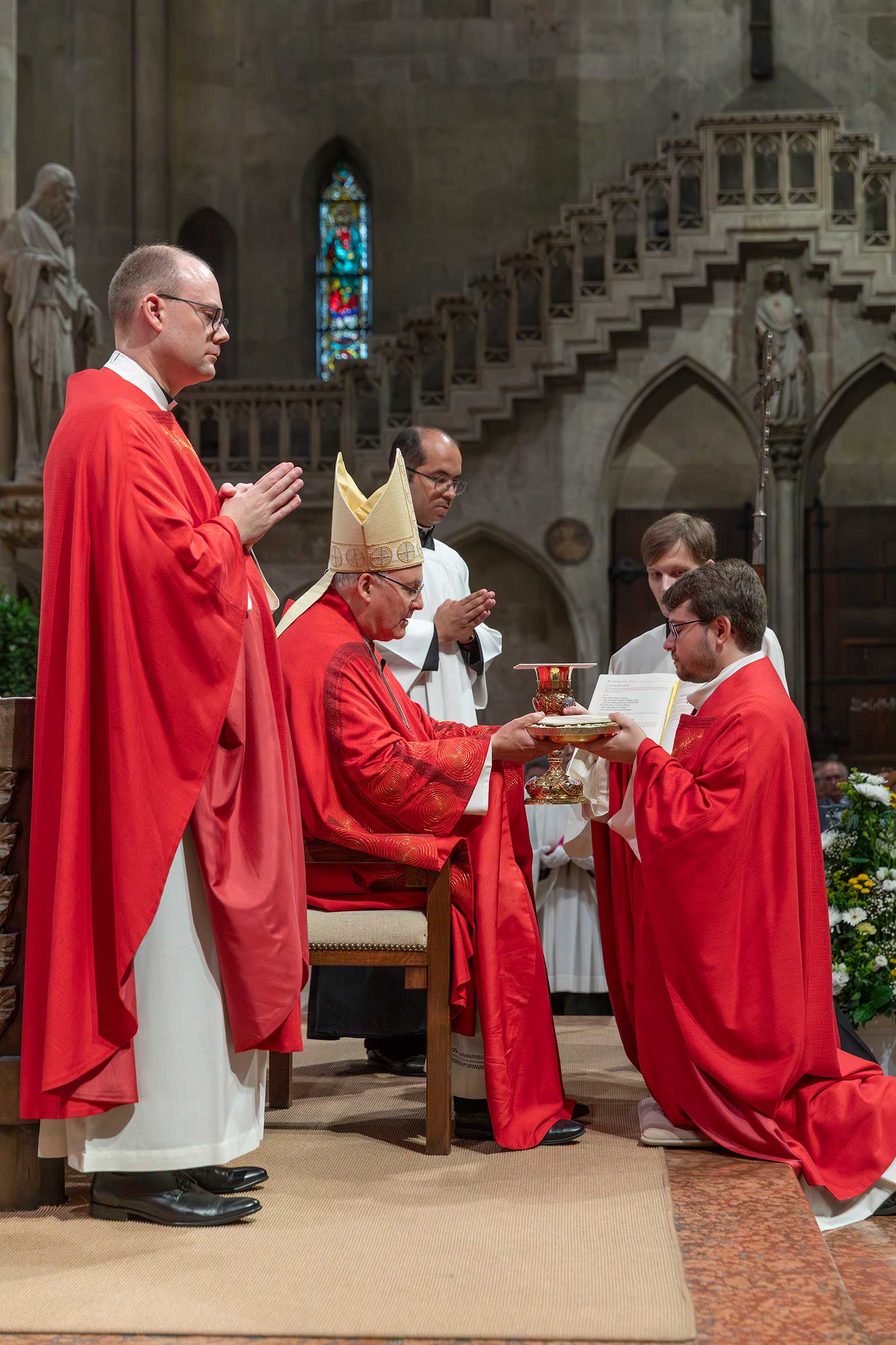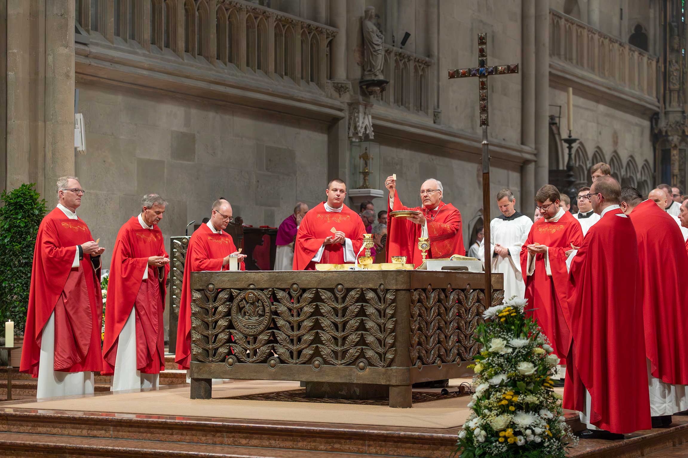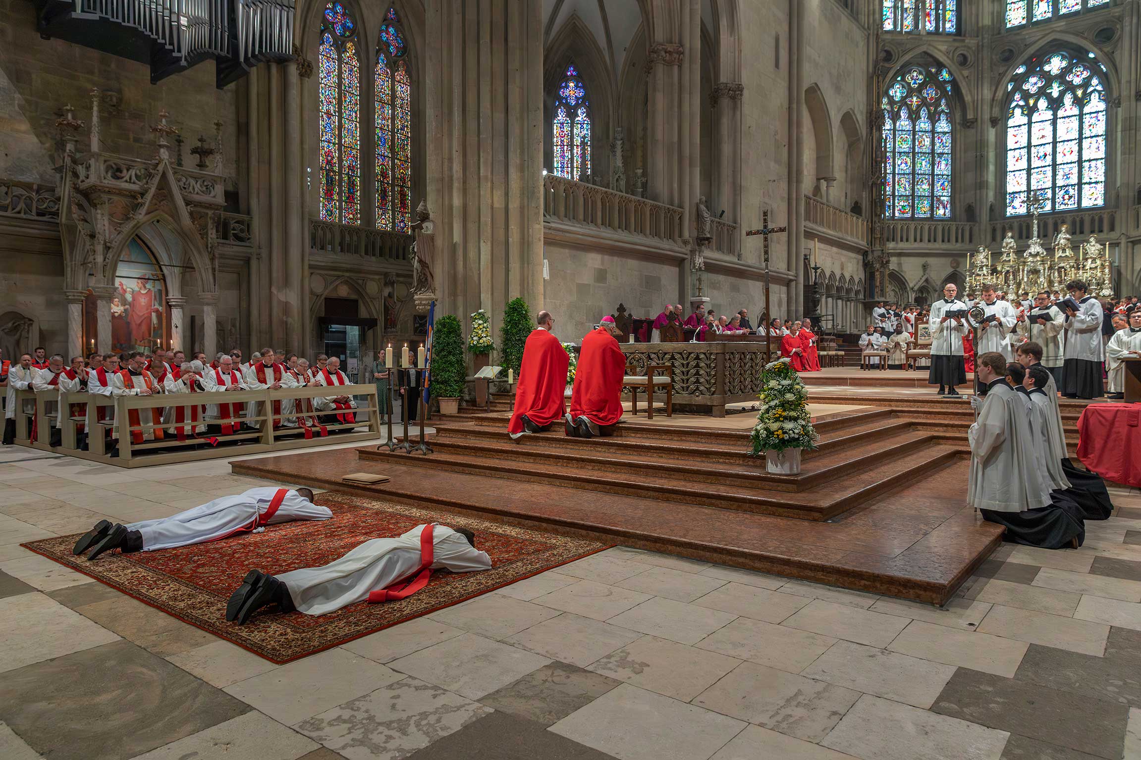 Bischof Rudolf Voderholzer feierte die Priesterweihe in Konzelebration mit Domdekan Generalvikar Dr. Roland Batz, Regens Daniel Stark, Subregens Christoph Leuchtner, Spiritual Matthias Effhauser sowie den Heimatpfarrern der Priesteramtskandidaten, Pfarrer Erich Renner und Pfarrer Klaus Beck.