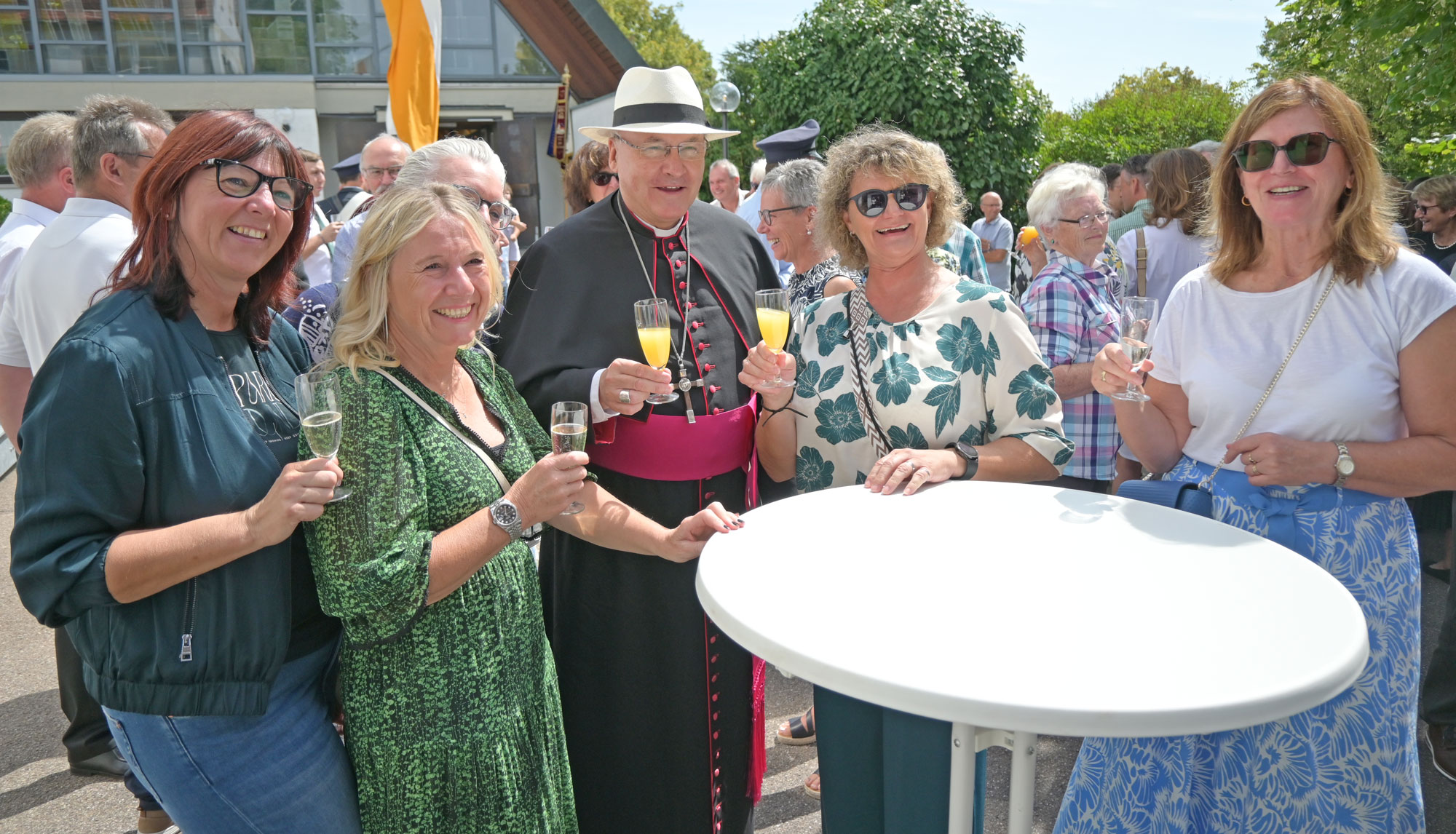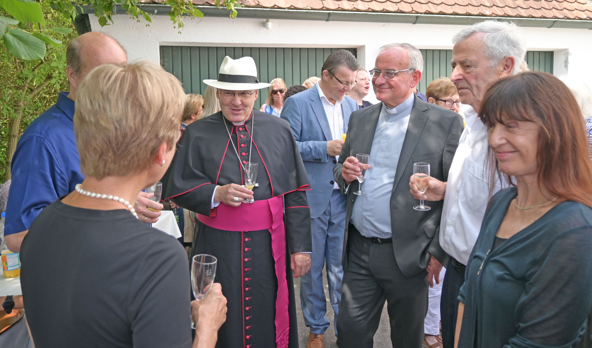 Vor dem Pontifikalsegen überreichten Pfarrgemeinderatssprecherin Monika Ortner und Kirchenpfleger Konrad Lins einen Präsentkorb an Bischof Voderholzer und dankten ihm für den Besuch im westlichsten Ort des Bistums Regensburg. Bischof Voderholzer dankte für die Gastfreundschaft und würdigte diesen ganz besonderen Kirchenbau, der den alten und neuen Teil gut verbindet, als „Zelt Gottes unter den Menschen“.