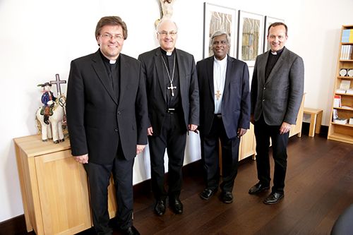 Moses Prakasam, Bischof der indischen Diözese Nellore, hat Bischof Rudolf Voderholzer in Regensburg besucht. Der indische Bischof firmt in diesen Wochen 385 Jugendliche im Rahmen von 6 Firmgottesdiensten im ganzen Bistum Regensburg. In Regensburg leben derzeit etliche junge Männer aus der Diözese von Bischof Moses, die hier einem Studium der Theologie nachgehen und sich auf das katholische Priestertum vorbereiten. Regens Msgr. Martin Priller und Pfarrer Günter Müller aus Pfeffenhausen nahmen an den Gesprächen teil.