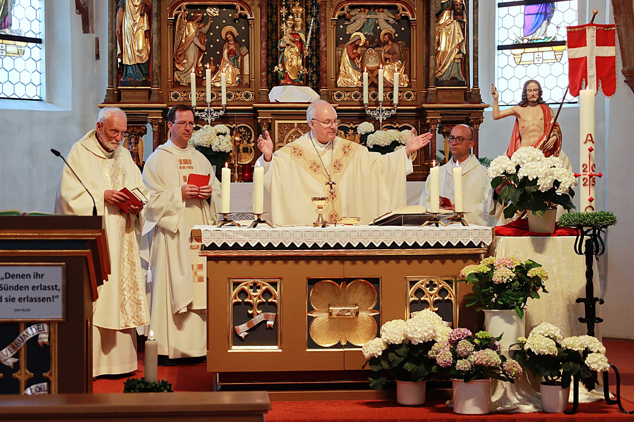 Den Höhepunkt des Tages bildete die Eucharistiefeier in der nahegelegenen Pfarrkirche St. Bartholomäus und Dionysius, da die Wallfahrtskirche Maria Schnee derzeit saniert wird. Bischof Dr. Rudolf Voderholzer zelebrierte den Gottesdienst gemeinsam mit Domkapitular Prof. Dr. Josef Kreiml, Pater Siegbert Mayer aus Altötting, Pfarrer Tobias Magerl aus Teisnach und Pater Benedikt M. Sedlmair C.O. In seiner Predigt blickte Bischof Voderholzer auf das Tagesevangelium nach Johannes (Joh 6, 1–15), das von der wundersamen Brotvermehrung berichtet. Dies, so der Bischof, sei als ein vorausweisendes Zeichen für die Eucharistie zu deuten. Die Menschen, die Jesus nachfolgen, seien geistig hungrig auf sein Wort, doch Jesus kümmerte sich auch um ihren leiblichen Hunger. Paradoxerweise, so der Bischof, führe die Sättigung des körperlichen Hungers die Menschen nicht zu einer größeren Sehnsucht nach dem wahren „Brot des Lebens“, ganz im Gegenteil. Er zog eine Parallele zur heutigen Zeit: Die unvorstellbare Brotvermehrung durch moderne Landwirtschaft in Europa führe nicht zwangsläufig zu mehr Dankbarkeit und Offenheit für Gottes Wort. Oft führe der Überfluss eher dazu, die Quelle aller Gaben zu vergessen. Der Bischof erinnerte zudem an den Gedenktag des heiligen Athanasius, des großen Bischofs von Alexandria, dessen Standhaftigkeit im Glauben an die Menschwerdung Gottes in Jesus Christus – verteidigt auf dem Konzil von Nicäa (325) – ein eindrückliches Vorbild sei. Athanasius musste mehrfach aus seinem Bistum fliehen, weil er am überlieferten Glauben festhielt, doch stets blieb er standhaft und treu. Seine Beharrlichkeit sei ein Zeugnis dafür, dass der christliche Glauben kein theoretisches Konstrukt sei, sondern sich auf einem festen Fundament gründe. In den Fürbitten dankten die Gläubigen dem heiligen Franziskus und Bruder Konrad im Umgang mit der göttlichen Schöpfung, beteten für Demut und Dankbarkeit im Alltag und gedachten den verstorbenen Angehörigen und insbesondere Papst Franziskus.